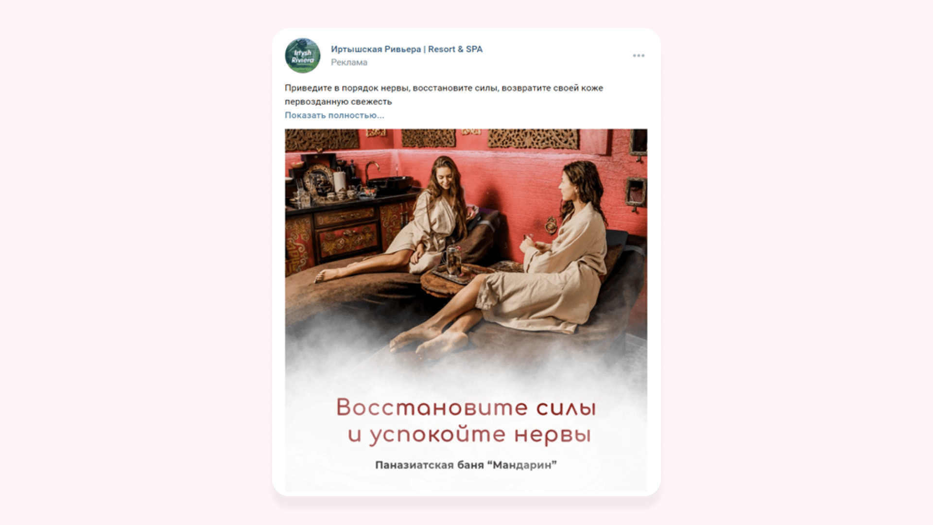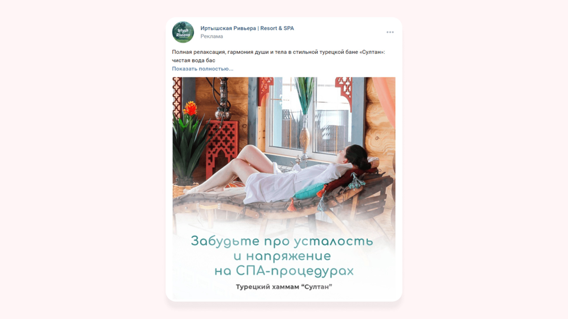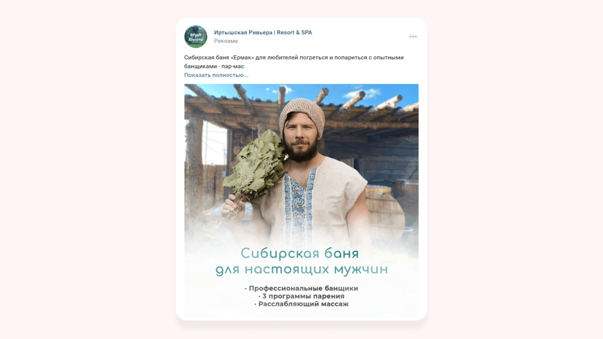 По итогам тестового периода работы получили 67 вступлений в сообщество и 5 заявок по 1014 ₽ Так как первые заявки на «Гостевые дома» выходили по стоимости выше KPI, то мы исключили из рекламной кампании объявления, которые работали хуже всего, и добавили рекламу в видеоформате. Видеоклип и объявления, которые показали хороший результат в тестовом периоде, продолжили запускать на аудиторию «Прямые конкуренты» и начали показывать на аудитории «Ключевые фразы по загородному» отдыху и на «Заинтересованные аудитории». Понимая, что средний цикл принятия решения о заказе услуг в туркомплексе не менее 30 дней и любой подписчик сообщества мог являться нашим потенциальным клиентом, мы сфокусировались не на чистой лидогенерации, а на работе вдолгую, через набор базы подписчиков. За второй месяц работы лучшим объявлениям для привлечения подписчиков стал видеоклип, который показывал территорию туркомплекса. К видеоклипу не писали текст, чтобы не отвлекать аудиторию от динамической картинки, которая показывала дома, спа, набережную, ресторан и территорию и дарила приятные эмоции. После основного периода работы получили 234 подписчика и 26 обращений по 632 ₽* по запросу на бронирование гостевого дома в сообщениях сообщества. В итоге за весь период работы по направлению «Гостевые дома»: Для продвижения направления «Бани и спа-услуги» начали работу с аудиториями прямых конкурентов. У нас была база из 11 000 жителей Омска, которые ранее интересовались и посещали спа-салоны. Все эти люди были нашими потенциальными клиентами. Сложность была в том, что большая часть базы конкурентов была из неактивных подписчиков: люди неохотно лайкали посты и писали комментарии. Поэтому с этой аудиторией решили работать с минимальным дневным бюджетом: охватывали аудиторию не за 1-2 дня, а примерно за неделю. Рекламную кампанию направления «Бани и спа-услуги» решили разделить. У заказчика одна баня и два вида спа-процедур: турецкий хаммам «Султан» и паназиатская баня «Мандарин». У каждого свои особенности и преимущества, поэтому решили на каждый вид услуг запустить своё рекламное объявление. Реклама паназиатской бани «Мандарин». Сделали акцент на роскошные процедуры в экзотической атмосфере сиамского массажного салона, ароматные скрабы и омолаживающие обертывания на французской косметике. Во время тестового периода запуска рекламы на паназиатскую баню получили 35 подписчиков и 2 заявки по 2569 ₽ Реклама турецкого хаммама «Султан». Сделали акцент на уникальный массаж, пилинг, французское обертывание и бассейн. Интересно, что стоимость обращения по рекламе спа-процедуры паназиатская баня «Мандарин» была в 6 раз выше средней стоимости заявки по хаммаму, хотя призывы к действию в рекламных объявлениях были одинаковые. Забегая вперед скажем, что и при основном ходе работы объявление спа-процедуры турецкий хаммам «Султан» сработал лучше. С него получили 25 подписчиков и 6 обращений по 387 ₽. Предполагаем, что в рекламе сработала фотография девушки, которая отдыхает после спа-процедур в туркомплексе. И предложение провести время на спа-процедурах и избавиться от напряжения и усталости. Именно этого хотят женщины после трудной недели. Русская банька. У заказчика профессиональные пар-мастера, которые учились у лучших банщиков России, поэтому мы разместили их на фотогр