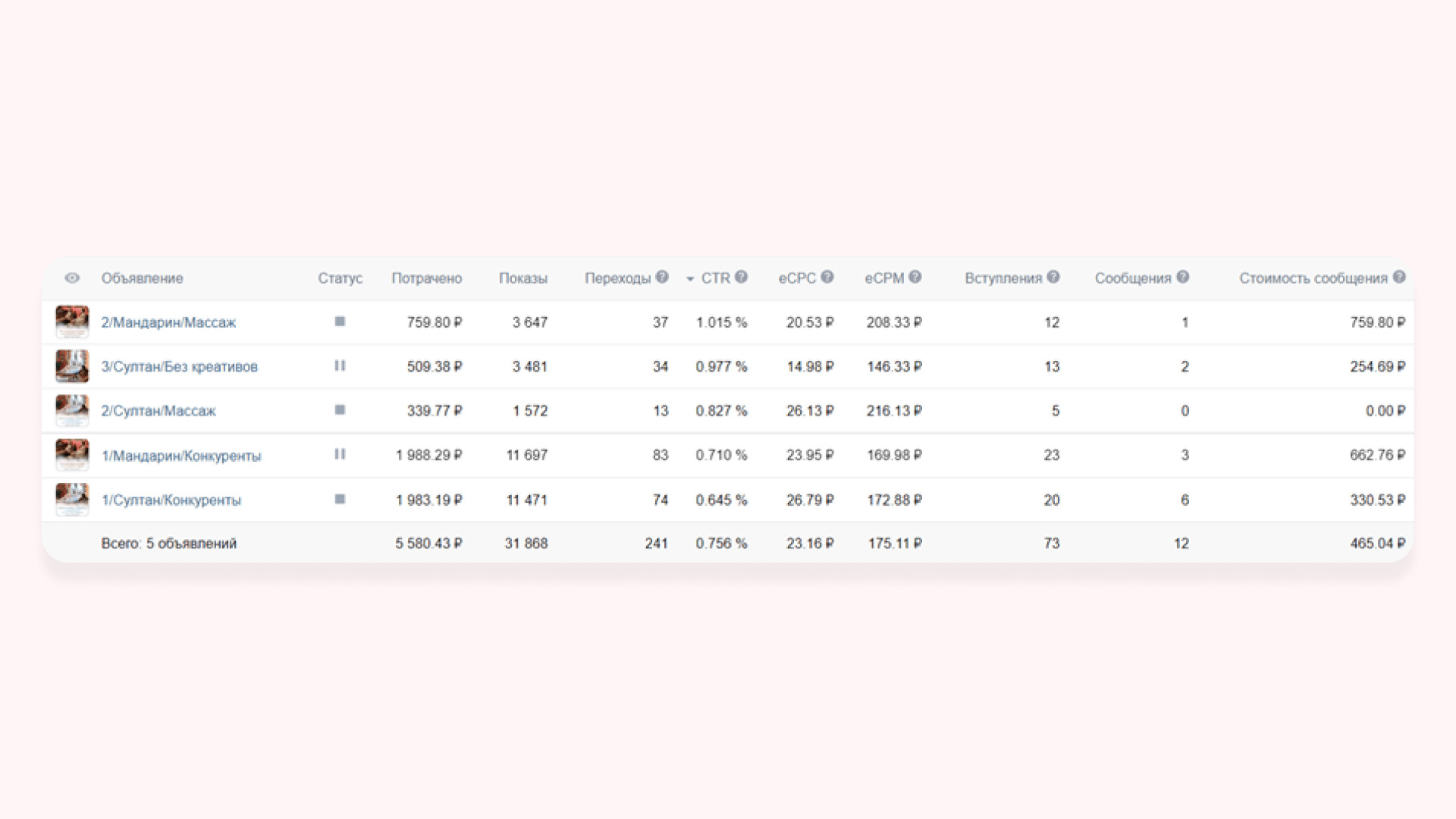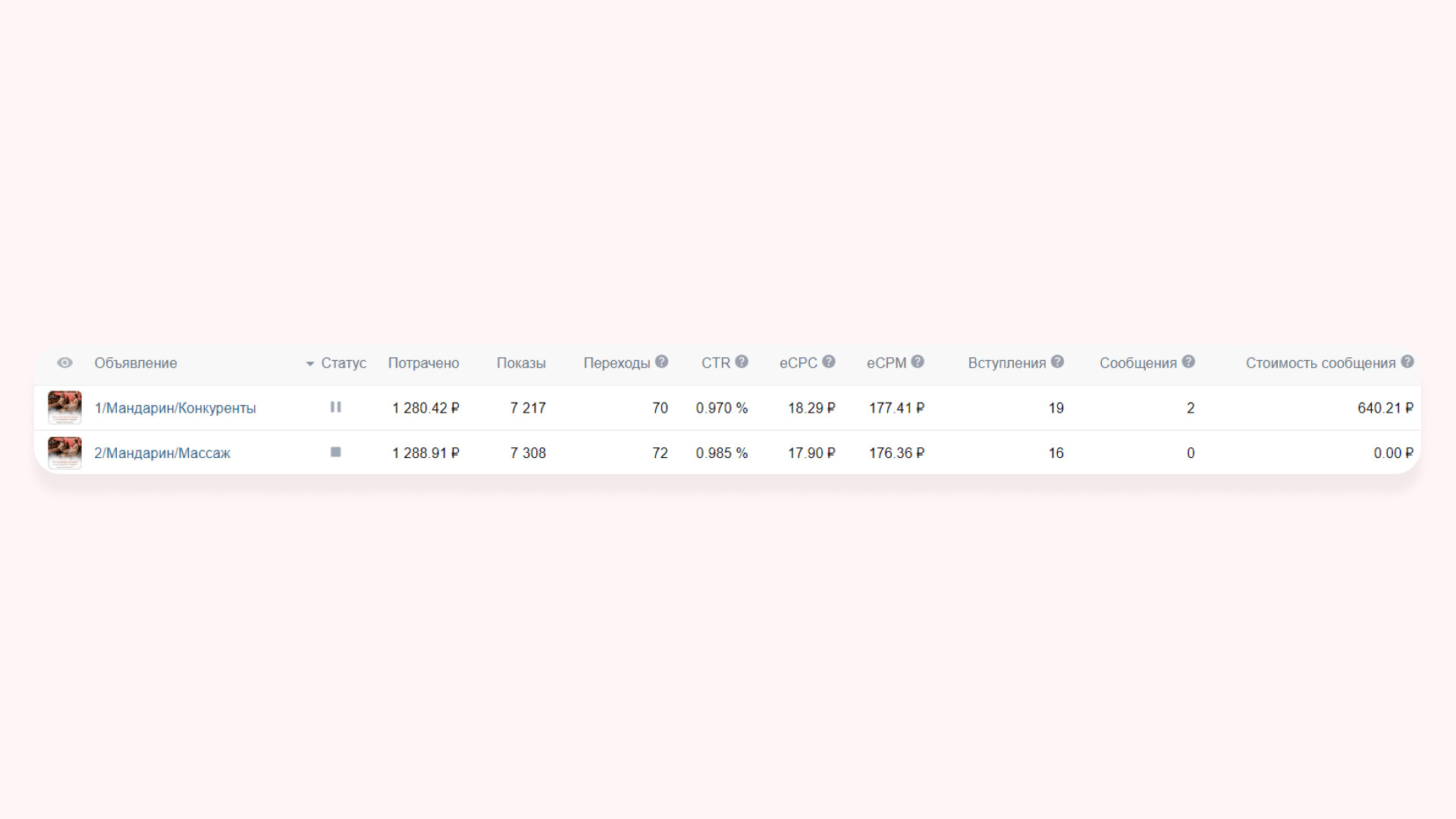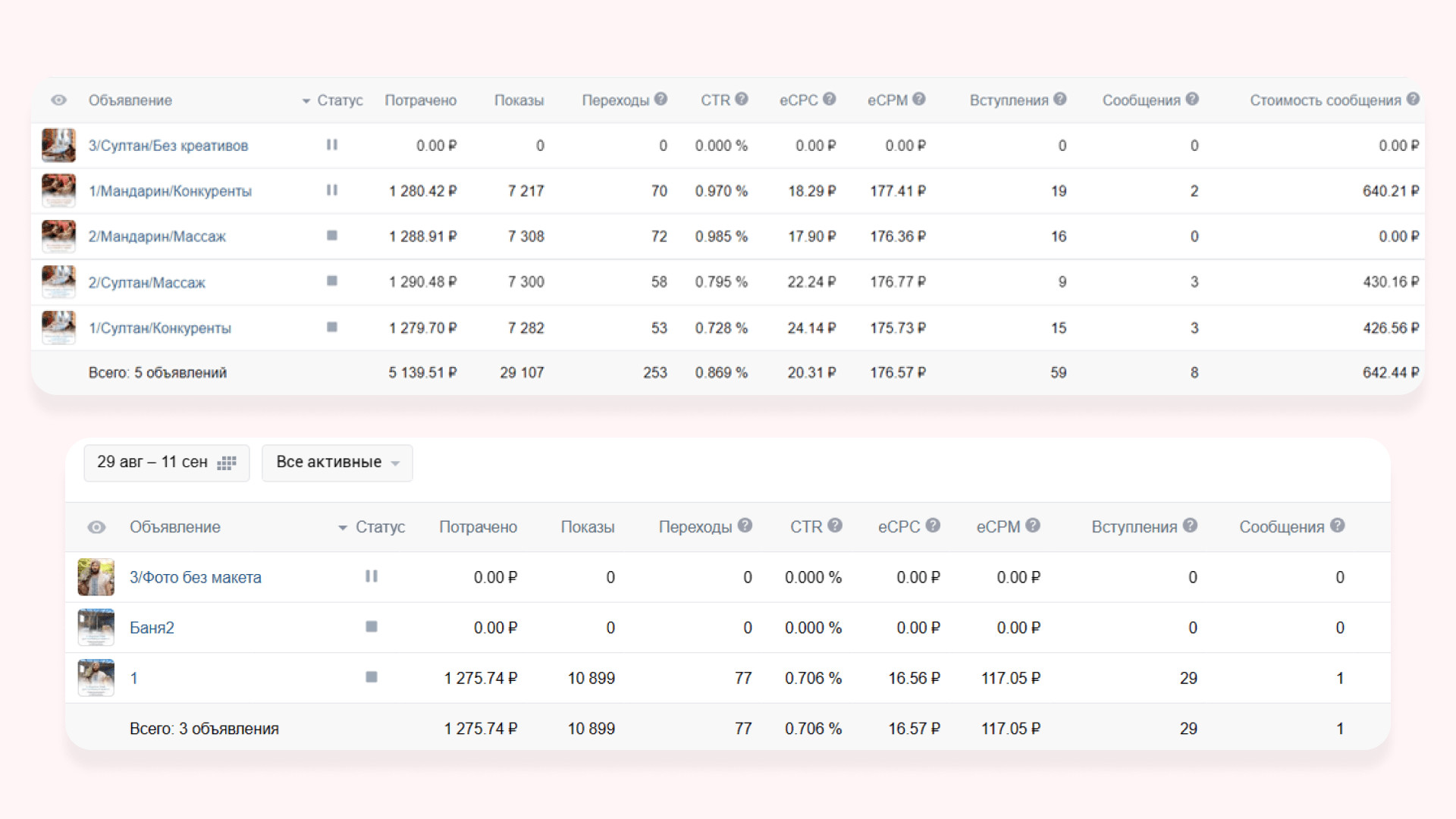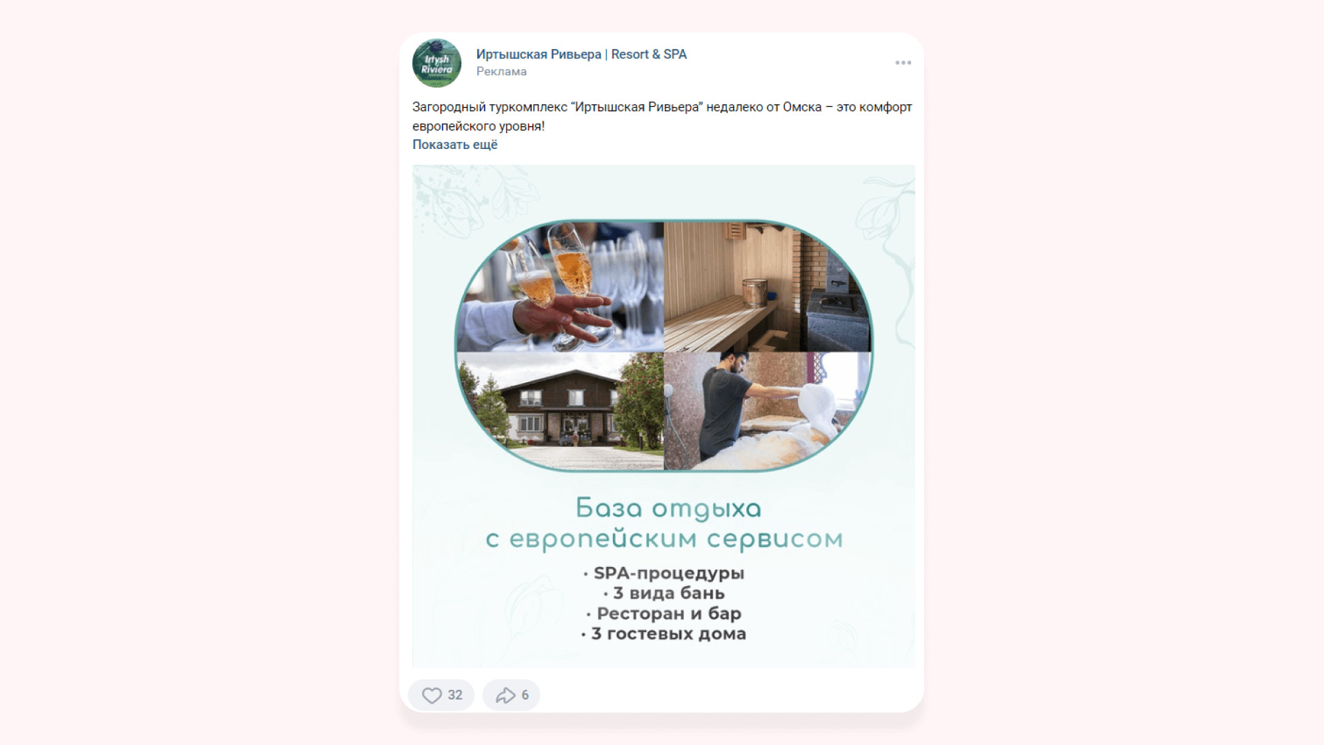 По итогам тестового периода работы получили 67 вступлений в сообщество и 5 заявок по 1014 ₽ Так как первые заявки на «Гостевые дома» выходили по стоимости выше KPI, то мы исключили из рекламной кампании объявления, которые работали хуже всего, и добавили рекламу в видеоформате. Видеоклип и объявления, которые показали хороший результат в тестовом периоде, продолжили запускать на аудиторию «Прямые конкуренты» и начали показывать на аудитории «Ключевые фразы по загородному» отдыху и на «Заинтересованные аудитории». Понимая, что средний цикл принятия решения о заказе услуг в туркомплексе не менее 30 дней и любой подписчик сообщества мог являться нашим потенциальным клиентом, мы сфокусировались не на чистой лидогенерации, а на работе вдолгую, через набор базы подписчиков. За второй месяц работы лучшим объявлениям для привлечения подписчиков стал видеоклип, который показывал территорию туркомплекса. К видеоклипу не писали текст, чтобы не отвлекать аудиторию от динамической картинки, которая показывала дома, спа, набережную, ресторан и территорию и дарила приятные эмоции. После основного периода работы получили 234 подписчика и 26 обращений по 632 ₽* по запросу на бронирование гостевого дома в сообщениях сообщества. В итоге за весь период работы по направлению «Гостевые дома»: Для продвижения направления «Бани и спа-услуги» начали работу с аудиториями прямых конкурентов. У нас была база из 11 000 жителей Омска, которые ранее интересовались и посещали спа-салоны. Все эти люди были нашими потенциальными клиентами. Сложность была в том, что большая часть базы конкурентов была из неактивных подписчиков: люди неохотно лайкали посты и писали комментарии. Поэтому с этой аудиторией решили работать с минимальным дневным бюджетом: охватывали аудиторию не за 1-2 дня, а примерно за неделю. Рекламную кампанию направления «Бани и спа-услуги» решили разделить. У заказчика одна баня и два вида спа-процедур: турецкий хаммам «Султан» и паназиатская баня «Мандарин». У каждого свои особенности и преимущества, поэтому решили на каждый вид услуг запустить своё рекламное объявление. Реклама паназиатской бани «Мандарин». Сделали акцент на роскошные процедуры в экзотической атмосфере сиамского массажного салона, ароматные скрабы и омолаживающие обертывания на французской косметике. Во время тестового периода запуска рекламы на паназиатскую баню получили 35 подписчиков и 2 заявки по 2569 ₽ Реклама турецкого хаммама «Султан». Сделали акцент на уникальный массаж, пилинг, французское обертывание и бассейн. Интересно, что стоимость обращения по рекламе спа-процедуры паназиатская баня «Мандарин» была в 6 раз выше средней стоимости заявки по хаммаму, хотя призывы к действию в рекламных объявлениях были одинаковые. Забегая вперед скажем, что и при основном ходе работы объявление спа-процедуры турецкий хаммам «Султан» сработал лучше. С него получили 25 подписчиков и 6 обращений по 387 ₽. Предполагаем, что в рекламе сработала фотография девушки, которая отдыхает после спа-процедур в туркомплексе. И предложение провести время на спа-процедурах и избавиться от напряжения и усталости. Именно этого хотят женщины после трудной недели. Русская банька. У заказчика профессиональные пар-мастера, которые учились у лучших банщиков России, поэтому мы разместили их на фотогр