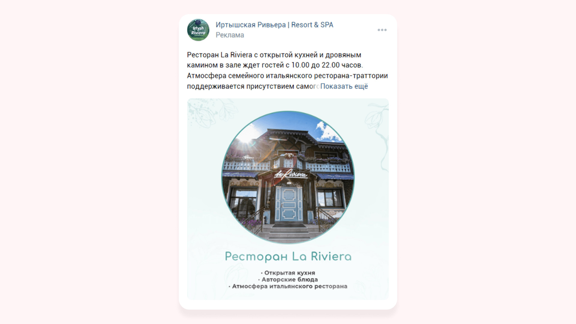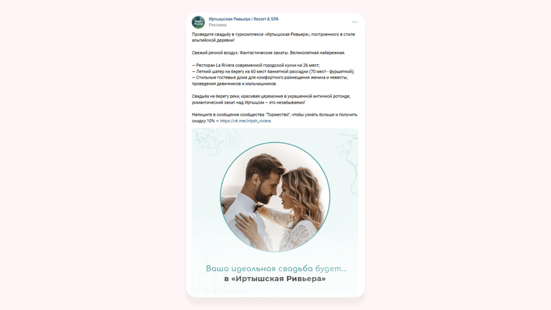 Формат «Универсальная запись» выбрали, потому что он позволяет разместить текст почти в 17 000 символов и добавить до 10 фотографий. Услуги туркомплекса уникальные и дорогие, поэтому понадобилось много текста и фотографий, чтобы обосновать цены и подробно описать ценности, которые человек получит во время отдыха.