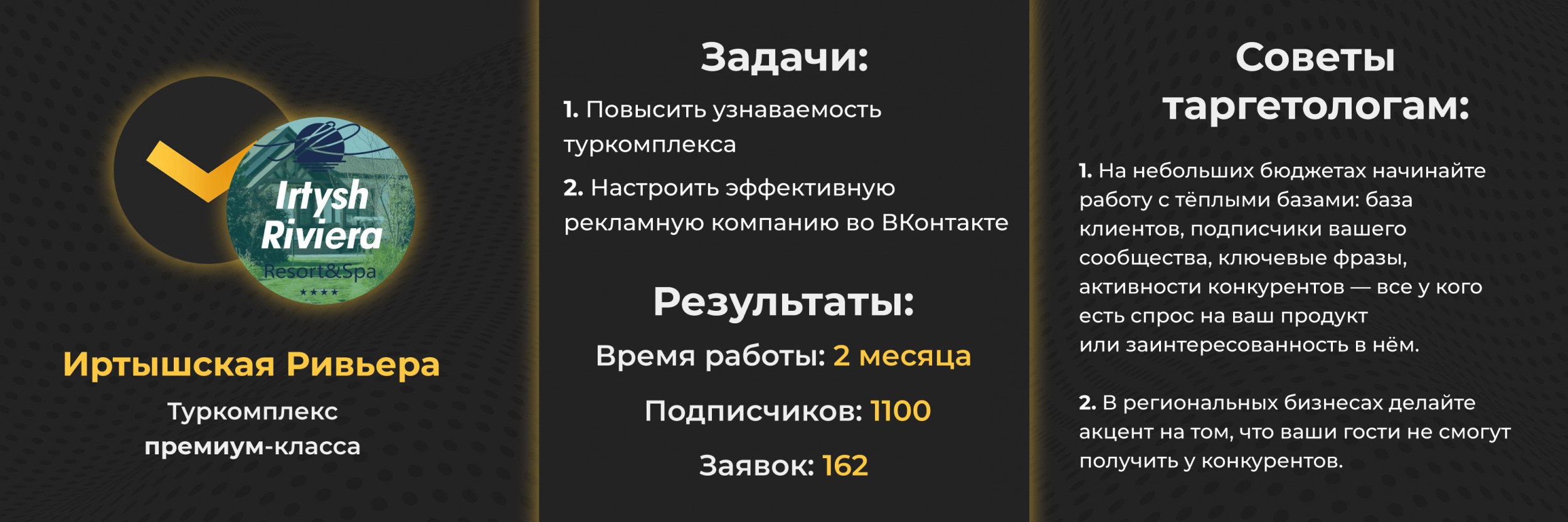 К нам обратился туркомплекс «Иртышская Ривьера». Ранее заказчик уже запускал рекламу во ВКонтакте, но цена заявки была высокой, поэтому решили начать работу с нами.