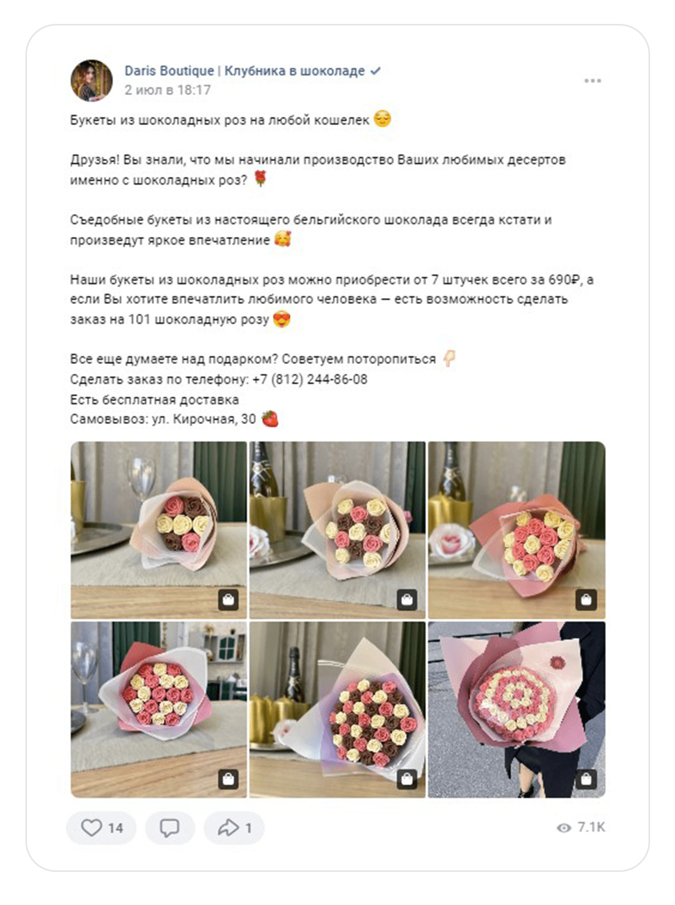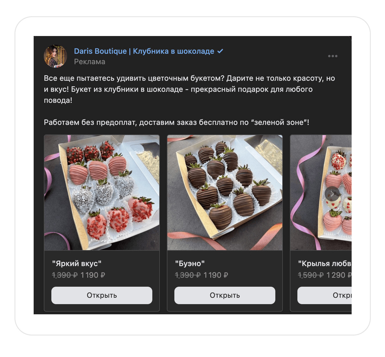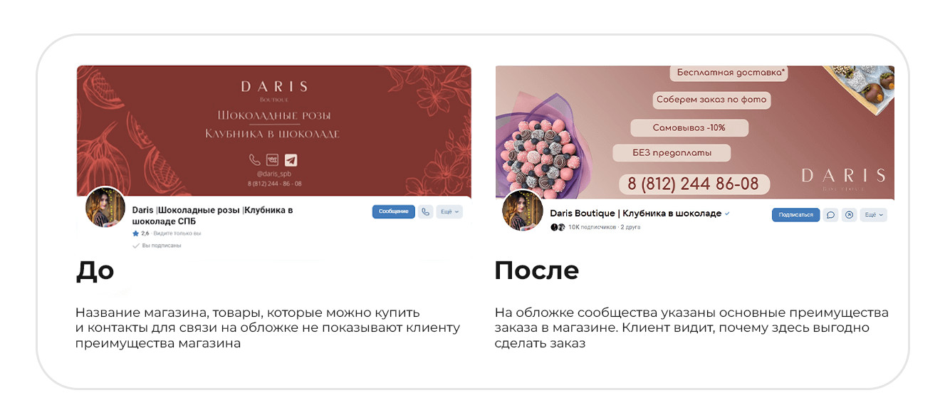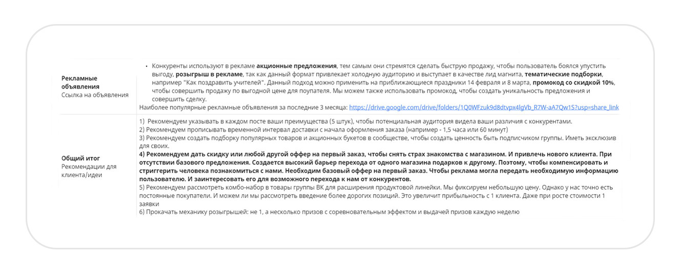 Конкуренты. Изучили идеи продвижения и преимущества, которые они транслируют в рекламе. Составили для заказчика список рекомендаций, благодаря которым можно отстроиться от конкурентов. Например, в рекламе на холодную аудиторию предлагать аудитории отдельные товары на акции. Такой подход поможет клиенту сделать первую покупку и убедиться в качестве продукта и уровне сервиса. После анализа сообщества во ВКонтакте составили для заказчика рекомендации, которые помогут привлечь внимание покупателя и выделиться среди конкурентов. Обложка. Указать на обложке сообщества основные офферы, что поможет клиенту сразу увидеть главные преимущества магазина. Оффер в посте. В каждом посте писать о стоимости букета, способах заказа, условиях доставки, адрес и время работы магазина. Клиент сразу увидит всю необходимую информацию для заказа, сэкономит время и быстро определиться с покупкой. Тематические подборки. За месяц до праздничных событий делать посты с тематическими подборками букетов, которые подойдут к празднику. Например, на 8 Марта, ко Дню матери, на выпускной или подарки не выше 1000 р. Такие подборки можно использовать в рекламе на теплую и на холодную аудиторию. Клипы. Записывать трендовые видео под популярную музыку и размещать в разделе «Клипы». В роликах можно показать реальный размер букета, процесс создания клубники в шоколаде или эмоции, которые вызовет подарок у получателя. Этот раздел работает по принципу рилс в запрещенной соцсети или тик-токе. С помощью него можно получить бесплатный трафик: внутренний алгоритм ВКонтакте будет показывать клип пользователям, которые не подписаны на сообщество магазина. Шопинг теги на фотографиях в посте помогут сократить путь клиента от картинки с букетом до заказа. Как работают шопинг-теги и как их установить. Ответы на все комментарии администратором сообщества помогают повторно вовлечь подписчиков в диалог, и получить больший охват у записи. Информативные иллюстрации. Людям сложно понять реальный размер подарка. Лучше всего размер помогает передать человек, который держит сладкий букет в руках. Но не всегда есть возможность сделать такую фотографию. В этом случае можно указывать в тексте количество шоколадных клубничек в коробке. Так клиенту будет проще сориентироваться с размером. Качественные фотографии. Уделять внимание качеству фотографий сладких подарков. Например, делать снимки на однородном фоне, чтобы акцент был на букете. Советы по съемке букетов В первый месяц работали с теплой и холодной аудиториями и запустили посевы в маркет-платформе. Так как мы были вторым подрядчиком у заказчика, то запустить рекламу автопродвижения товаров не могли. Эта рекламная кампания оставалась на стороне другого рекламного агентства. Чтобы достичь целей заказчика, вместо продвижения товаров активно задействовали формат «Карусель». С помощью таргета привлекали людей в сообщество и создавали аудиторию ретаргетинга. Старались выстраивать путь, чтобы человек после перехода не терялся, а подписывался либо на рассылку, либо в сообщество. В идеале сразу покупал и оставался в клиентской базе. Проводили А/Б-тестирование — это способ маркетингового исследования, который помогает сравнить две версии рекламного объявления и определить, какой вариант лучше привлекает клиентов и прино