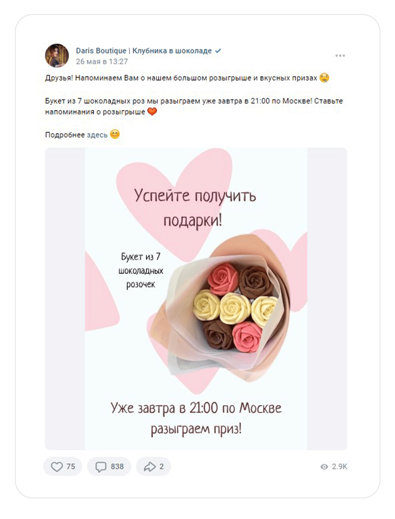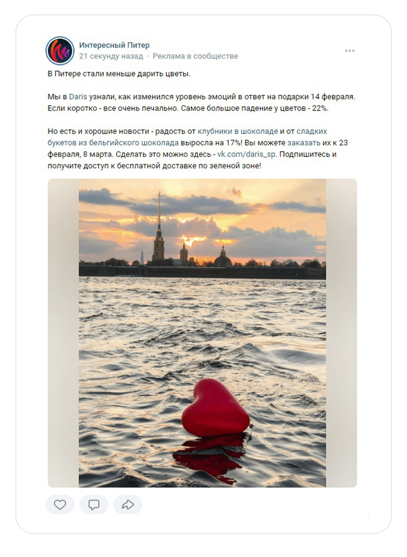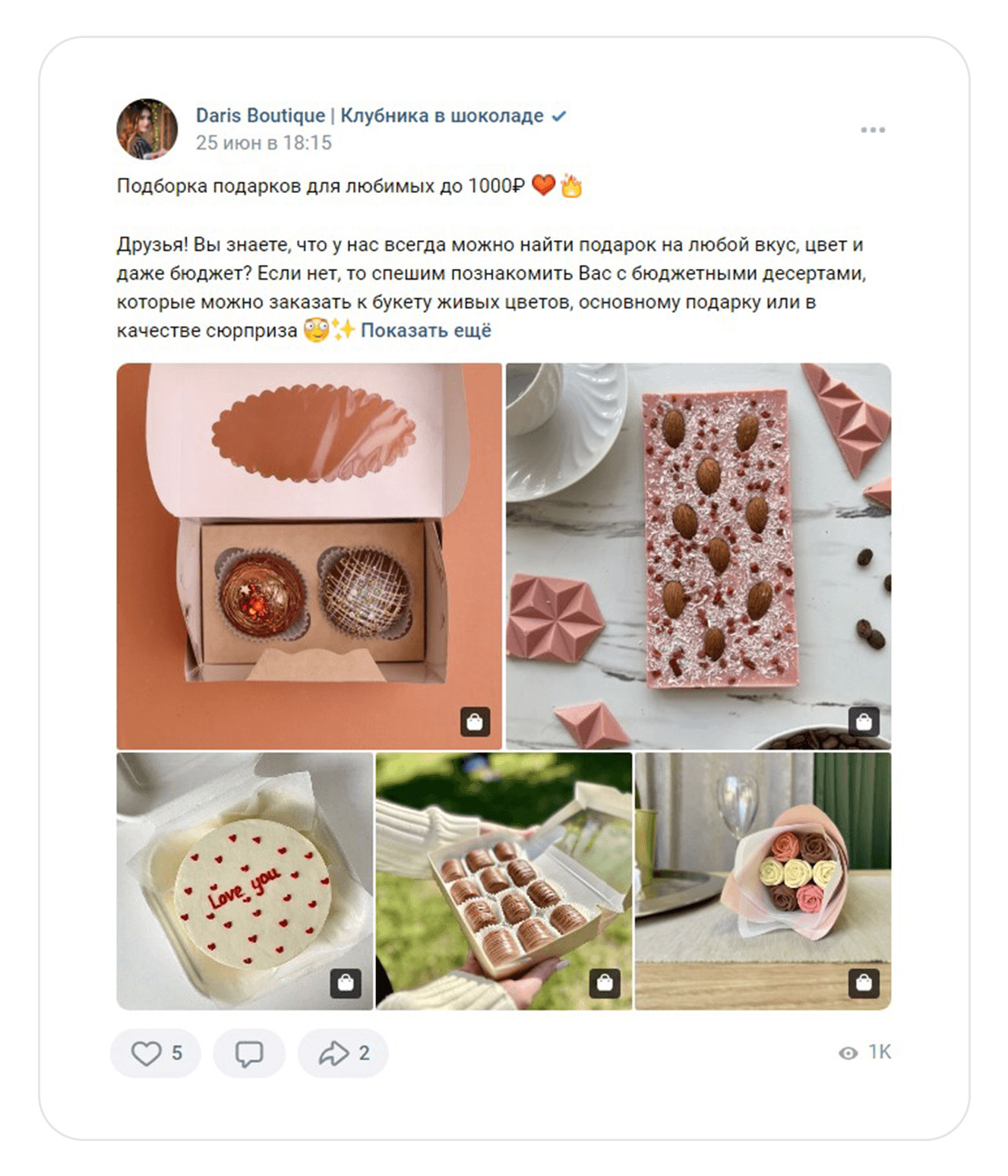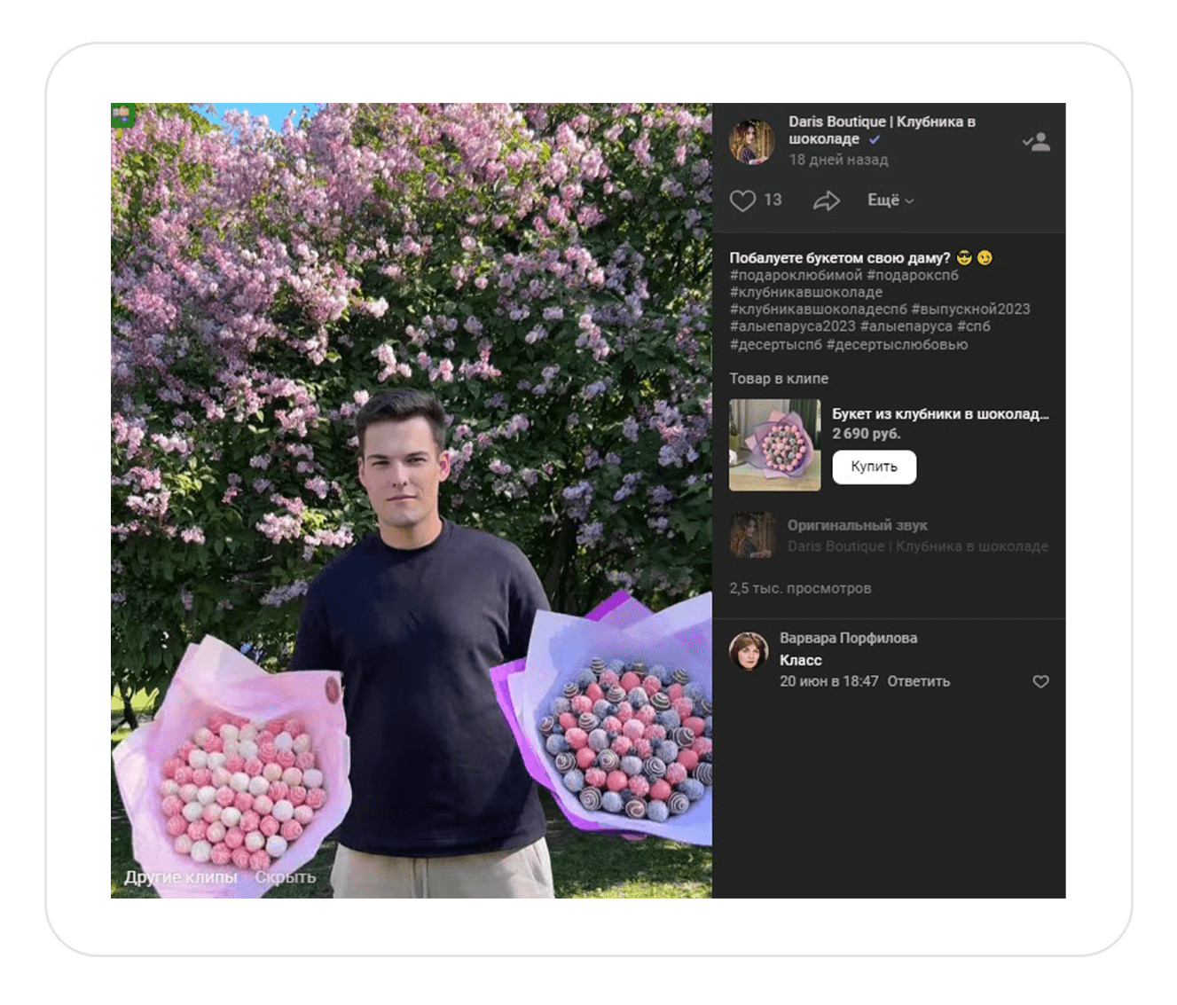 Конкуренты. Изучили идеи продвижения и преимущества, которые они транслируют в рекламе. Составили для заказчика список рекомендаций, благодаря которым можно отстроиться от конкурентов. Например, в рекламе на холодную аудиторию предлагать аудитории отдельные товары на акции. Такой подход поможет клиенту сделать первую покупку и убедиться в качестве продукта и уровне сервиса. После анализа сообщества во ВКонтакте составили для заказчика рекомендации, которые помогут привлечь внимание покупателя и выделиться среди конкурентов. Обложка. Указать на обложке сообщества основные офферы, что поможет клиенту сразу увидеть главные преимущества магазина. Оффер в посте. В каждом посте писать о стоимости букета, способах заказа, условиях доставки, адрес и время работы магазина. Клиент сразу увидит всю необходимую информацию для заказа, сэкономит время и быстро определиться с покупкой. Тематические подборки. За месяц до праздничных событий делать посты с тематическими подборками букетов, которые подойдут к празднику. Например, на 8 Марта, ко Дню матери, на выпускной или подарки не выше 1000 р. Такие подборки можно использовать в рекламе на теплую и на холодную аудиторию. Клипы. Записывать трендовые видео под популярную музыку и размещать в разделе «Клипы». В роликах можно показать реальный размер букета, процесс создания клубники в шоколаде или эмоции, которые вызовет подарок у получателя. Этот раздел работает по принципу рилс в запрещенной соцсети или тик-токе. С помощью него можно получить бесплатный трафик: внутренний алгоритм ВКонтакте будет показывать клип пользователям, которые не подписаны на сообщество магазина. Шопинг теги на фотографиях в посте помогут сократить путь клиента от картинки с букетом до заказа. Как работают шопинг-теги и как их установить. Ответы на все комментарии администратором сообщества помогают повторно вовлечь подписчиков в диалог, и получить больший охват у записи. Информативные иллюстрации. Людям сложно понять реальный размер подарка. Лучше всего размер помогает передать человек, который держит сладкий букет в руках. Но не всегда есть возможность сделать такую фотографию. В этом случае можно указывать в тексте количество шоколадных клубничек в коробке. Так клиенту будет проще сориентироваться с размером. Качественные фотографии. Уделять внимание качеству фотографий сладких подарков. Например, делать снимки на однородном фоне, чтобы акцент был на букете. Советы по съемке букетов В первый месяц работали с теплой и холодной аудиториями и запустили посевы в маркет-платформе. Так как мы были вторым подрядчиком у заказчика, то запустить рекламу автопродвижения товаров не могли. Эта рекламная кампания оставалась на стороне другого рекламного агентства. Чтобы достичь целей заказчика, вместо продвижения товаров активно задействовали формат «Карусель». С помощью таргета привлекали людей в сообщество и создавали аудиторию ретаргетинга. Старались выстраивать путь, чтобы человек после перехода не терялся, а подписывался либо на рассылку, либо в сообщество. В идеале сразу покупал и оставался в клиентской базе. Проводили А/Б-тестирование — это способ маркетингового исследования, который помогает сравнить две версии рекламного объявления и определить, какой вариант лучше привлекает клиентов и прино