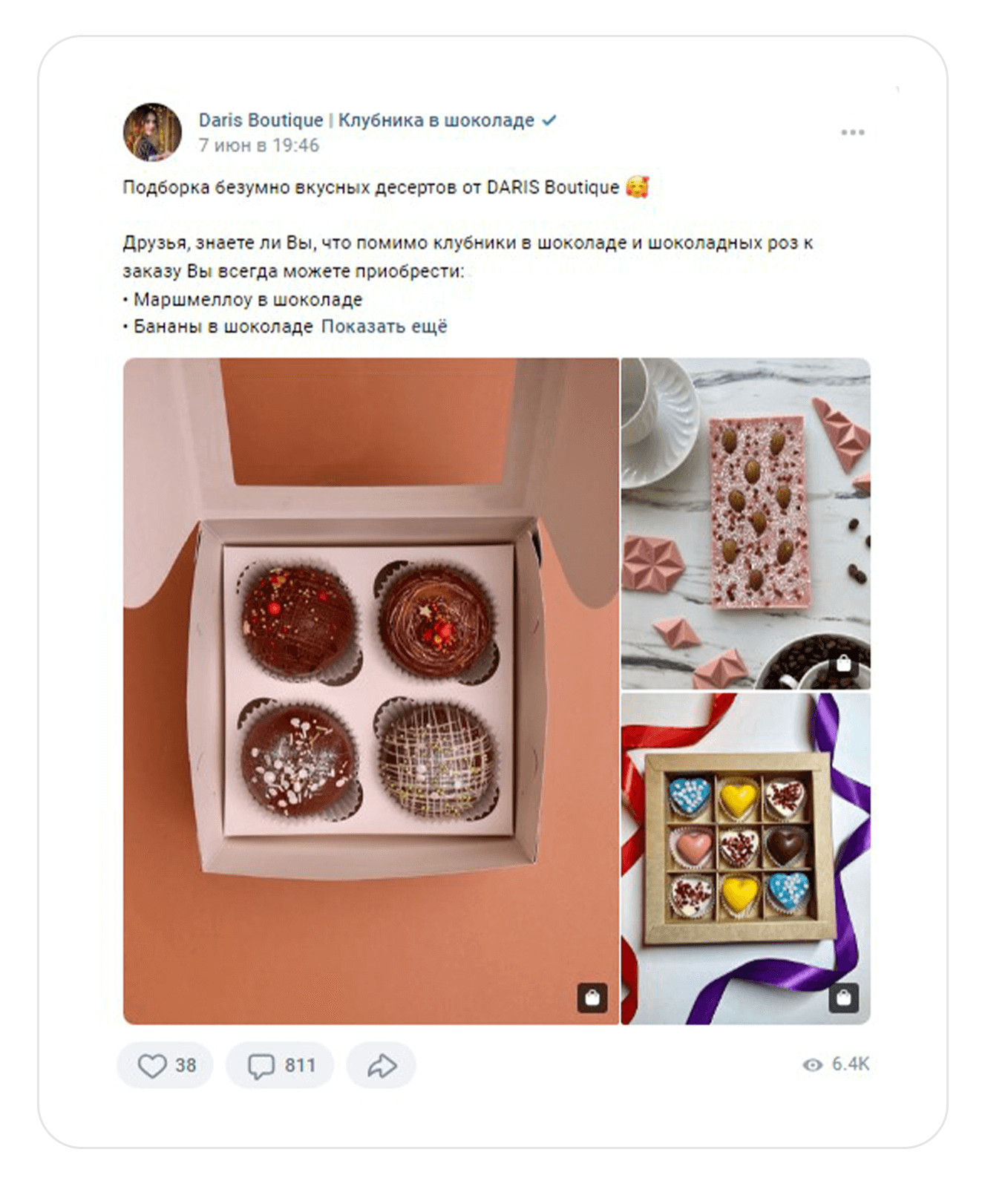 Дариш — магазин в Санкт-Петербурге, который продает букеты из шоколадных роз, клубнику в шоколаде, бенто-торты с дизайном и другие сладости. В составе настоящий бельгийский шоколад. Средний чек: 1500 р. −1700 р.