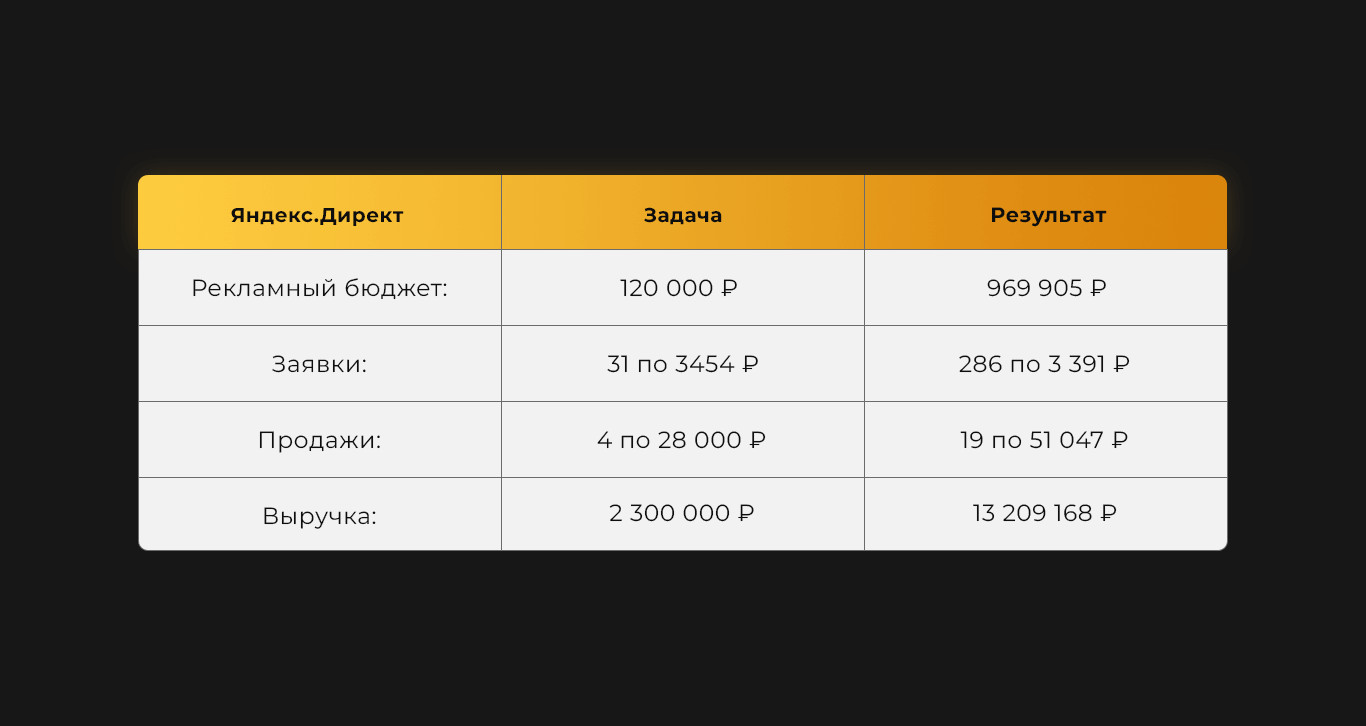 Лучшие объявления на Поиске с конкретными тезисами в заголовке, например, «Под ключ», «Гарантия 2 года» в связке с названием направления «Теплый пол». Мастер кампаний с оплатой за кликив нише строительства не сработал. Бюджет расходовался, но заявок не было, так как алгоритмы не обучаются под аудиторию, а просто ведут трафик на сайт. Поиск с оплатой за конверсии запустили в тестовом режиме, потому что в некоторых нишах хорошо работал в паре с автотаргетингом. Нужных результатов не получили. Первую неделю алгоритм работал на охваты, дальше перестал приносить регистрации. РСЯ с оплатой за конверсии не дал нужного результата, потому что алгоритм не смог выделить целевые аудитории заказчика и обучиться на них. Перезапуск кампании не помог прийти к нужному результату, поэтому отключили этот вид рекламы. Ремаркетинг настроили на аудиторию, которая взаимодействовала с сайтом. Предполагали, что инструмент хорошо отработает за счет таргетинга на аудиторию, которая была на сайте и знакома с продуктом. На деле получили охваты и переходы. Число отказов >10%. Регистраций не было. Перенесли данный инструмент на продвижение во ВКонтакте. Там получаем лиды по 500 р. В итоге за полгода продвижения: Рекламный бюджет: 969 905 р. Заявки: 286 по 3 391 р. Продажи: 19 по 51 047 р. Выручка: 13 209 168 р. 1. Использовать больше креативов с мастерами и фотографиями работ, чтобы повысить результативность рекламы. 2. Улучшить посадочные площадки: разместить реальные фотографии объектов и мастеров в процессе монтажа, чтобы повысить доверие у клиентов к сайтам. 3. Создать отдельную посадочную страницу с направлением «Отопление» и запустить рекламу, чтобы собирать регистрации на услуги отопления по отработанной схеме. 4. Регулярно вести SEO-оптимизацию сайта, чтобы люди находили ответы на вопросы по отоплению дома на посадочных площадках заказчика. 5. Продлить услугу контент-продвижение. Люди тщательно выбирают подрядчика, а экспертные посты в сообществе помогают повысить лояльность клиентов и увеличивают эффективность рекламы. 6. Расширить каналы продаж: Проведем аудит рекламы и покажем, как увеличить бюджет и снизить стоимость заявки!
