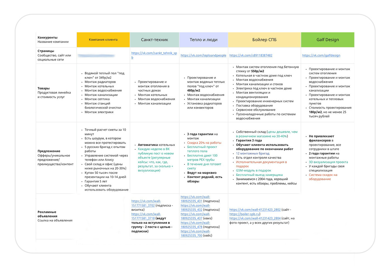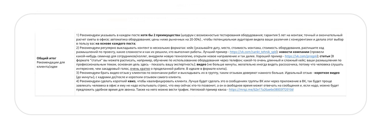 Разработка сайтов для тестирования. Создали два варианта сайта и провели A/B-тестирование площадок, чтобы повысить рост конверсии в заявку. Меняли расположение блоков на сайте, тексты в заголовке и в блоках, убирали и добавляли всплывающие окна со скидкой на работы. В итоге определили, что работает лучше всего, и дали заказчику рекомендации по доработке сайтов. Главной рекомендацией было поставить фотографии реальных объектов и мастеров в процессе монтажа. Анализ прямых конкурентов. Для отстройки от конкурентов дали рекомендации по ведению сообщества, видам контента, ключевым сообщениям в постах и описанию сообщества. Сегменты целевой аудитории. Провели сегментацию аудитории исходя из того, откуда идет самая большая прибыль компании. Выбрали самый целевой сегмент и предложили заказчику разделить его на подсегменты, чтобы глубже понимать потребности клиентов.