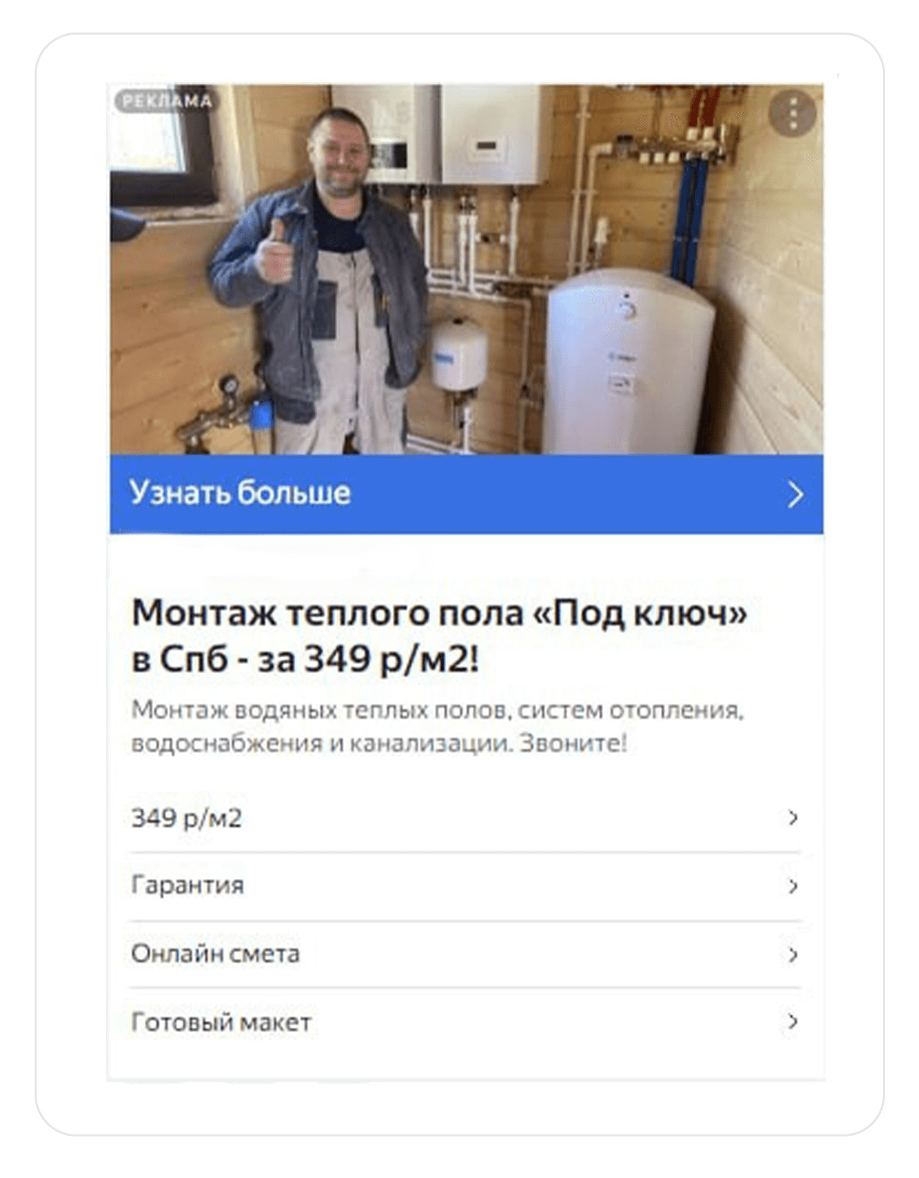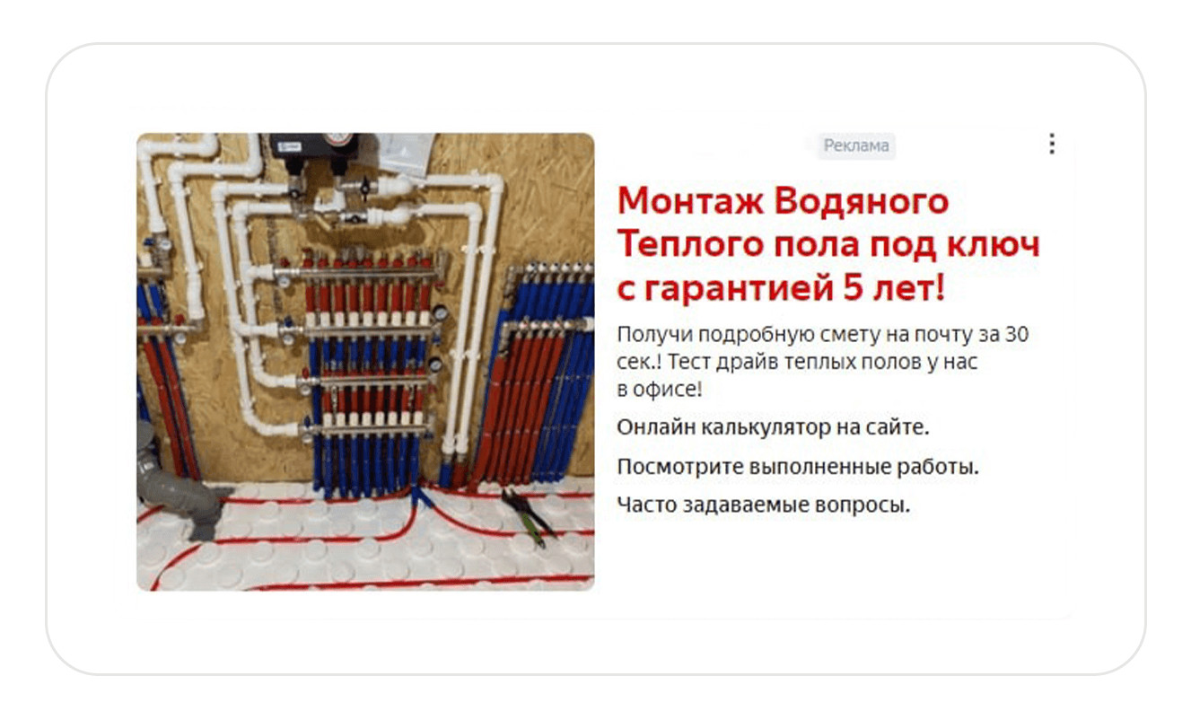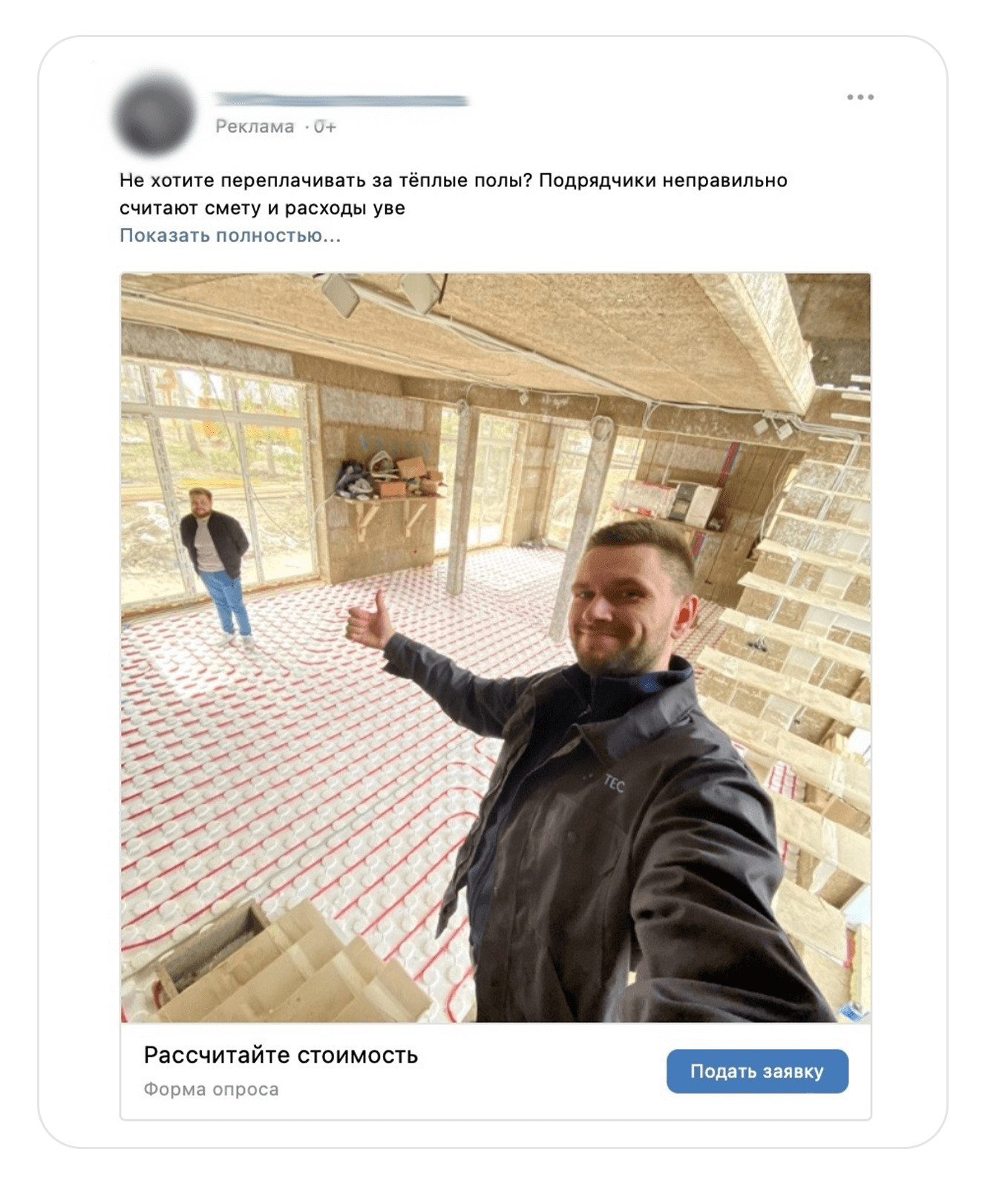 Расскажем, какие инструменты ВКонтакте применяли в работе, что сработало, а что не принесло результатов. Новый рекламный кабинетв нише строительства показал себя лучше, чем старый. В рекламе использовали формат лид-форм для сбора заявок из ВКонтакте. Самостоятельно настроили интеграцию в сервисе Albato, теперь заявки сразу попадают в CRM-систему заказчика с пометками. Кампании ретаргета посетителей сайтов дают лучший результат. Реклама догоняет потенциального клиента с сайта во ВКонтакте и приносит самые дешевые лиды по 61 р. В кампании на позитив собираем активных пользователей и запускаем рекламу на горячих клиентов. В итоге получаем лиды по 294 р. Кампании по ключевым словам ниши теплых полов нацелены на теплую аудиторию, и стабильно приносят обращения заинтересованных клиентов по 1290 р. Лучшее объявление за первый месяц работы привело 6 обращений по 997 р. Один из критериев успеха — фотография с человеком, который устанавливает теплый пол. Объявления такого формата помогли отстроиться от конкурентов, потому что конкуренты в рекламе, как правило, размещают фотографии теплых полов. «Шаблон рекламного объявления, который вызывает доверие и закрывает страхи клиентов». Кампании по геопозиции с коттеджными поселкамии участниками групп поселков в нише строительства, не принесли результатов, потому что в данном направлении сложно выделить горячую аудиторию. Кампании по интересам строительства не дали ожидаемых результатов. Не привели заявки до 1800 р. Предполагаем, потому что ниша «теплых полов» довольно узкая. Собранная аудитория активности конкурентов показала высокую стоимость заявки, более 2000 р. Скорей всего, потому что лайкают, репостят и пишут комментарии в группе не всегда потенциальные клиенты. Результат. В итоге за полгода работы получили: Рекламный бюджет: 262 196 р. Подписчики: 200 Заявки: 114 по 1 299 р. Продажи: 6 по 43 699 р. Выручка: 3 561 000 р. Делимся стратегиями и рабочими инструментами продвижения в Яндекс.Директе. Поиск. Тестировали разные стратегии и связки. В итоге лучшие показатели у стратегии «Максимум кликов». Внутри кампании стоит разбивка на группы по частотности запросов: высокая, средняя и низкая. Хорошо работает стратегия с «Ручным управлением ставками» на малом бюджете, до 15 000 р. в неделю. С увеличением бюджета стоимость заявки растет, поэтому решили отказаться от этой стратегии. РСЯ. Тестировали разные стратегии, от полностью автоматической с «Оплатой за конверсии» до ручной. Остановились на «Оптимизации конверсий с оплатой за клики», которая дает хорошие охваты и стабильно приводит лиды по стоимости в рамках KPI. Постоянно мониторили и чистили мусорные площадки, чтобы бюджет не уходил на нецелевые заявки. Мастер кампаний. Запускали на тест мастер кампаний с разными стратегиями. В итоге получилось настроить автоматический инструмент мастера кампаний с «Оплатой за конверсии», который стабильно приводит 15−20 целевых регистраций в месяц. Лучшие объявления в РСЯ с качественной картинкой в ярком цвете и с мастерами на фоне сделанной работы.