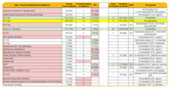 Креативы делали с картинками по психологии. Сверху писали название курса и его преимущества. По креативам чёткого фаворита не было. Но лучше цепляли те, где сразу видно, о чём курс, когда старт и сколько мест. Ещё работали формулировки, которые психологи используют в работе — так аудитория быстрее понимала, что это для них. С такого креатива получили 65 лидов по 809 ₽ за все время продвижения В рекламных объявлениях слабо сработали общие фразы вроде «Стань лучше в профессии». Психологи — вдумчивая аудитория, они долго сравнивают варианты, читают отзывы, советуются. Расплывчатые призывы их не цепляли, поэтому CTR и конверсии были низкими. Нужна конкретика — иначе просто пролистывают. Основные трудности и решения. Во-первых — изначально из-за большого количества курсов (до 26 направлений) было легко запутаться в рекламных кампаниях и потерять фокус. Чтобы упростить работу, мы создали единые шаблоны для объявлений, креативов и лид-форм. Это ускорило запуск рекламы, повысило эффективность тестирования и в целом снизило хаос в процессе. Единые шаблоны ускорили запуски и повысили эффективность продвижения Во-вторых — необходимость говорить с психологами на их профессиональном языке. Общие фразы не работали, нужна была точная терминология. Стали изучать, как пишут эксперты, подмечали их формулировки и встроили в УТП: добавили «подтверждение НОЦ», «практические кейсы», «супервизию». То есть такая терминология была непонятна обычному человеку, поэтому он проходил мимо, но понятна нашей целевой аудитории. В результате за 10 месяцев:Вложили: 2 173 829 ₽Запустили объявлений: 1 344 шт.Охватили: 12 млн человек с CTR 0,3% (норма для узкой аудитории).Количество заявок: 1 366Стоимость заявок: 1 333 ₽, что эффективно для платных курсов с высоким LTV.Продажи: 29Выручка: 1,7 млн ₽* — значимый вклад в общий доход проекта (9,4 млн ₽) *На данный момент вложения превышают выручку. Но это — планомерные инвестиции в рост. У курсов заказчика длинный цикл принятия решения: клиенты проходят путь от первого контакта до покупки от 2−3 месяцев. Это абсолютная норма для сложных и дорогих продуктов. Мы видим, как стратегия работает: выручка от рекламы растёт, и 1,7 млн ₽ — это лишь начало. Основная аудитория сейчас в воронке и постепенно принимает решение о покупке. Реклама работает, просто результат распределён во времени. Основные выводы: С сентября запустили продвижение курсов в Яндекс.Директ. Трафик направляли на лендинги конкретных программ: «Профессия: Психолог-консультант», «КПТ», «РАС» и другие. Цель — чтобы человек сразу увидел содержание курса, его пользу и возможности, и захотел подать заявку или купить. Минимум шагов, максимум информации. Сначала хотели собирать заявки как можно дешевле: до 5−10 тыс. р. за заявку. Позже подключили аналитику и начали смотреть глубже: сколько людей из заявок реально платят и окупается ли реклама. Чтобы понять, какие курсы действительно работают, создали сводную таблицу. В ней вручную сопоставляли данные из Яндекс. Директа и CRM. Фиксировали не только количество и стоимость заявок, но и конечные бизнес-метрики: число оплат и выручку по каждому курсу. Это позволило увидеть полную картину. Теперь видим полную цепочку: от клика до денег. Это помогло перейти от догадок к цифрам. Стало понятно, какие курсы приносят прибыль, а какие — только шум. Решения