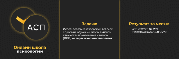 Клиент: Онлайн-школа психологииСпециализация: онлайн-курсы психологии для новичков и действующих специалистовСредний чек: 60 000 ₽ — 130 000 ₽Период работы: 1 + год (на ноябрь 2025)Задача: Использовать сентябрьский всплеск спроса на обучение, чтобы снизить стоимость привлечения клиента (ДРР), не теряя в количестве заявок.Результат за месяц: ДРР снижен до 16% (при предыдущих 25−30%)