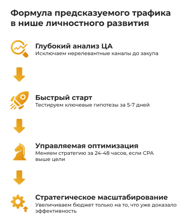 1. Глубокий анализ ЦА. Мы не берём «общий портрет» из интернета. Мы изучаем реальные боли, языковые паттерны и поведение аудитории. Тестируем гипотезы ещё до закупа — чтобы исключить нерелевантные каналы заранее. Это снимает главный страх: «А вдруг придут не те?»