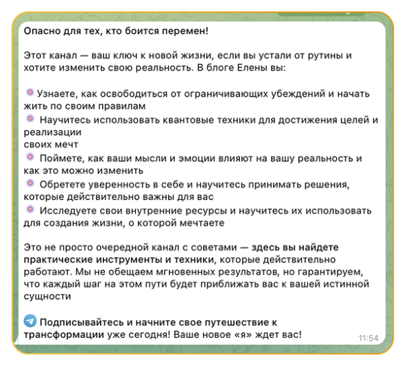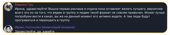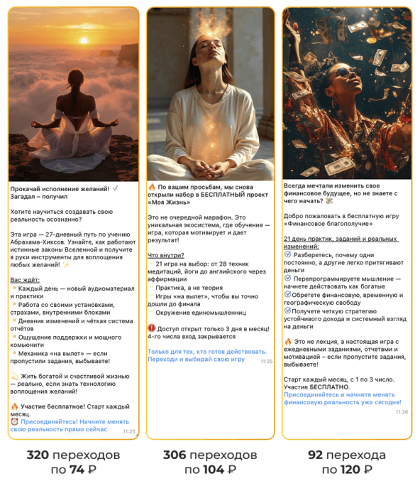 Эта формула — не теория. Это наш рабочий фундамент, который позволяет управлять трафиком вместо того, чтобы гадать. Ниже — три реальных кейса: как мы применяли её при жёстких сроках, ограниченном бюджете и разных форматах экспертов. Цифры говорят сами за себя. Задача: привлечь новую лояльную аудиторию перед запуском курса — за 7 дней и по цене не выше 150₽ за подписчика.Подготовка к запуску Проблема и решение. Изначально планировали вести трафик на группу в Telegram. Но после тестового закупа стало ясно: стратегия не работает — CPA превысил 220₽. Сразу согласовали с клиенткой изменение подхода:→ переключили трафик на личный канал,→ скорректировали рекламные подачи,→ заменили посадочную страницу. Эти шаги позволили резко снизить стоимость привлечения. Результат— Привлекли 180 новых подписчиков— Фактический CPA — 115₽ (на 23% ниже цели)— Весь закуп — включая тестирование и оптимизацию — завершили за 7 дней— Основной трафик пришёл за 3−5 дней до запуска курса, поэтому заказчик успел провести прогрев: познакомиться с аудиторией, ответить на вопросы, укрепить доверие — и выйти на запуск курса с уже вовлечённой аудиторией. Вывод. Даже при жёстких сроках можно не просто запустить рекламную кампанию вовремя, а снизить стоимость. Главное — быть готовым менять стратегию, если данные говорят «нет». Задача: собрать лояльное комьюнити в Telegram-канале — за 6 дней и по цене не выше 70₽ за подписчика. Подготовка к запуску Решение. Создали четыре уникальных рекламных поста, каждый — под отдельный сегмент целевой аудитории. Один из ключевых креативов был построен вокруг боли «боюсь перемен», и выглядел так: Уже через 24−48 часов получили данные по CPA и CTR. Связки, где стоимость подписчика оказалась ниже 70₽, и аудитория активно переходила — сразу взяли в приоритет: повторно закупили размещения в этих каналах и расширили охват за счёт дополнительных площадок. Гипотезы с высоким CPA больше не закупали — бюджет полностью перераспределили в пользу доказавших эффективность направлений. Результат Вывод. Масштабирование не ломает KPI — если оно основано на данных. Бюджет работает как инвестиция, а не как расход. *Старт в боте — это первое взаимодействие пользователя с воронкой: человек переходит по рекламе и запускает диалог с ботом. Это ключевой этап перед регистрацией и покупкой. Задача. Протестировать три аудитории и два периода (за несколько дней до старта психологических игр и в дни их проведения), чтобы определить, где стоимость входа в воронку ниже, когда конверсия выше и какие направления оставить для масштабирования. Подготовка к запуску Решение: Поэтапное тестирование → коррекция → основной закуп Этап 1. Тестирование гипотез до основного запуска. Провели два тестовых закупа с интервалом в пять дней. Уже на этом этапе отсеяли аудиторию «мамы в декрете»: данное направление принесло 174 старта в боте (средний CPA — 132 ₽), но практически не конвертировалось в регистрации и продажи — аудитория не проявила интереса к продукту. В целях сохранения бюджета приняли решение отказаться от дальнейшей работы с этим сегментом. Из 15 рекламных постов оставили только 7 самых сильных: тексты про «духовность» не цепляли, а лучше работали практичные сообщения про изменение мышления и исполнение желаний. Ниши «психология» и «глубинные практики» (таро, гороскопы, работа с 