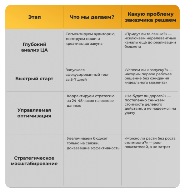 2. Быстрый старт. Мы запускаем сфокусированный тест за 5−7 дней: проверяем ключевые гипотезы по креативам, посадкам и каналам. Нам не нужно ждать «идеального момента» — мы получаем первое рабочее решение быстро и без потерь. Именно это убирает тревогу: «А вдруг не успеем к запуску?»