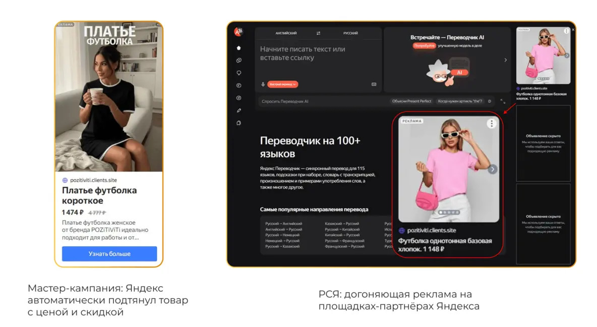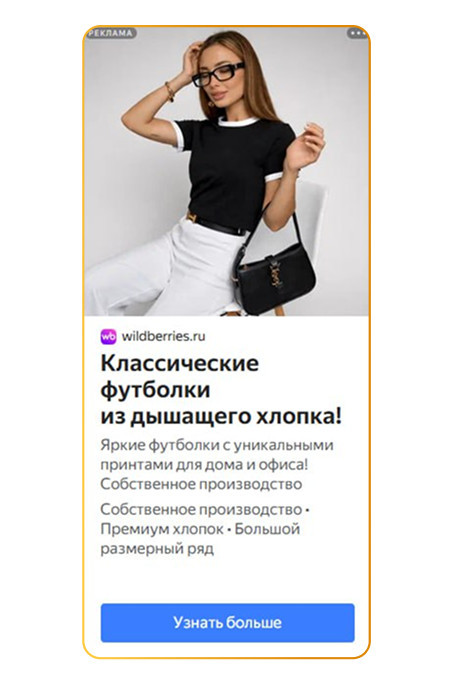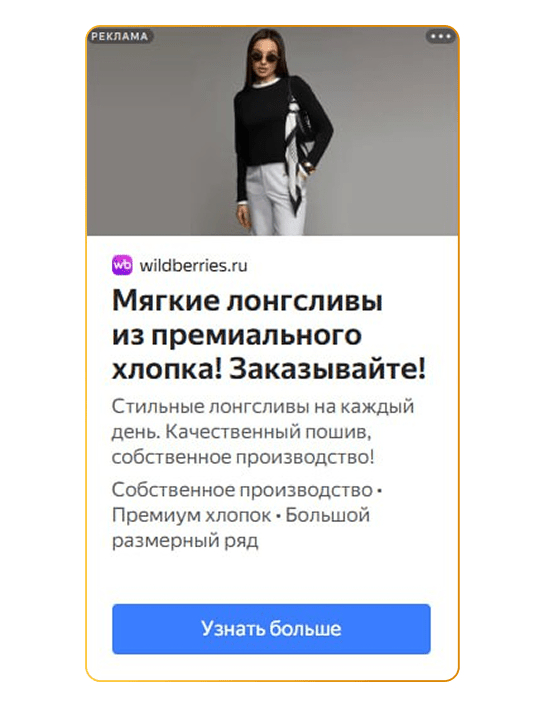 Во-первых, обратили внимание на видео: в некоторых карточках было заметно, что ролик сгенерирован нейросетью — световые переходы выглядели неестественно, а в названии бренда буква «Z» отображалась как «N». Мы посоветовали обрезать проблемные фрагменты и привести видео к единому стилю. Во-вторых, рекомендовали добавить инфографику — текстовые плашки и иконки на фото с ключевыми характеристиками: состав ткани, плотность, размерная сетка, преимущества (своё производство, износостойкий хлопок). Это помогает покупателям за 3 секунды понять, чем товар отличается от аналогов. В-третьих, предложили разнообразить фото: если в карточках позируют только модели старшего возраста, молодая аудитория может не увидеть «свой» образ.Клиент частично внёс правки до старта рекламы, что положительно повлияло на конверсию. УТП в рекламе. В заголовки и тексты добавили реальные преимущества: своё производство в России, премиум-хлопок, износостойкая ткань. Это привлекало покупателей, ценящих качество, а не только низкую цену. Мы запустили четыре типа кампаний в Яндекс. Директе, каждая из которых решала свою задачу в общей стратегии. Такое разделение позволило тестировать гипотезы параллельно, не смешивая метрики, и быстро понимать, какой формат работает лучше. Вместо шаблонного подхода мы адаптировали настройки под конкретные цели: от горячего спроса до тестирования всего ассортимента. Параллельно мы каждую неделю чистили поисковые запросы, убирая нерелевантные, чтобы не тратить бюджет на «холодный» трафик. Поисковая кампания: ловили тех, кто ищет товар прямо сейчас.Это стала основой всей стратегии. Для неё мы собрали семантическое ядро по ключевым запросам, связанным с женской одеждой из премиум-хлопка: «футболка женская плотный хлопок», «лонгслив женский износостойкий», "платье-футболка премиум".Тексты объявлений подготовили с акцентом на УТП бренда. Ссылки вели напрямую на карточки товаров-локомотивов на Wildberries, чтобы пользователь сразу попадал на страницу покупки. Итог:кампания показала лучший CTR — 3,05%, и принесла основную массу конверсий. Именно её мы взяли за основу для масштабирования. РСЯ: напоминали о бренде тем, кто уже интересовался. Эта кампания работала на догоняющий охват. Мы отобрали релевантные площадки в рекламной сети Яндекса и подготовили креативы в формате «фото + текст» с акцентом на преимущества бренда. Таргетинг настроили на пользователей, которые ранее искали похожие товары или посещали карточки конкурентов. Результат: 6 487 кликов при расходе 20 605 ₽ и CTR 1,8%. Кампания хорошо работала на узнаваемость и возвращала «тёплую» аудиторию. Мастер-кампании: автоматизация для хитов и ассортимента. Для оптимизации времени и ставок мы использовали инструмент мастер-кампаний в двух вариантах. Итог по мастер-кампаниям на весь магазин: 3 055 кликов при расходе 27 533 ₽ и успешный тест спроса на товары второй линии. Настройка кампаний обеспечивает показы, но кликают пользователи именно на визуал. Чтобы найти баланс между стоимостью клика и узнаваемостью бренда, мы протестировали два подхода. Это помогло понять, где важна незаметность, а где нужно выделяться дизайном. Нативный формат для поиска.Объявления подтягивали фотографию товара автоматически, без лишних рамок и логотипов. Это имитировало органическую выдачу Wildberries — пользовател