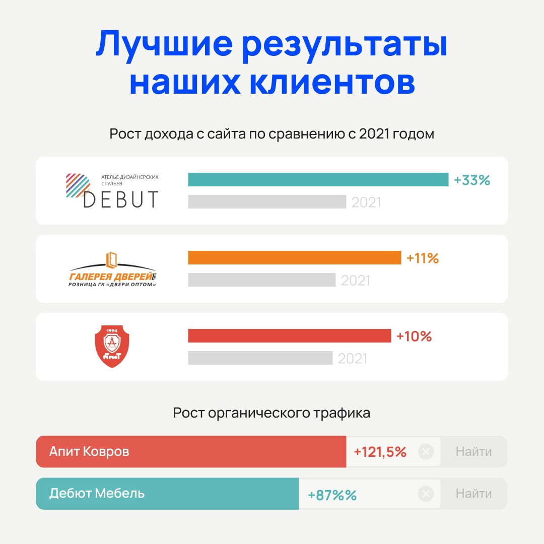 Вот наши результаты за 2022 год: Мы помогаем компаниям как надежный подрядчик, который глубоко погружается во все особенности заказчика. Сначала мы всегда проводим экспертную аналитику и составляем продуманную стратегию, чтобы не тратить время клиента на правки и корректировки в будущем. 1. Работа по шаблону без учета индивидуальных особенностей бизнеса клиента. 2. Акцент на количество выполняемых работ, объемные отчеты вместо качества и реального результата. 3. Негибкие процессы, зацикленные на соблюдении изначально подписанного договора. 1. Проводим подробный аудит ниши бизнеса, отдельные аудиты по маркетингу, юзабилити, дизайну сайта. Без этого анализа мы не приступаем к работе. 2. Тщательно изучаем особенности заказчика, поэтому план наших работ может значительно отличаться от шаблона. 3. Не считаем, что наша ответственность заканчивается на поставке лидов — отвечаем не только за количество заявок, но и за их качество. 4. Не берем большое количество проектов одновременно. 5. Наши отлаженные бизнес-процессы не позволяют перегружать сотрудников. 6. Имеем CMS собственной разработки, на которой мы делаем сайты. Внутри есть все необходимое для продвижения, и с ней просто работать даже неподготовленному пользователю.