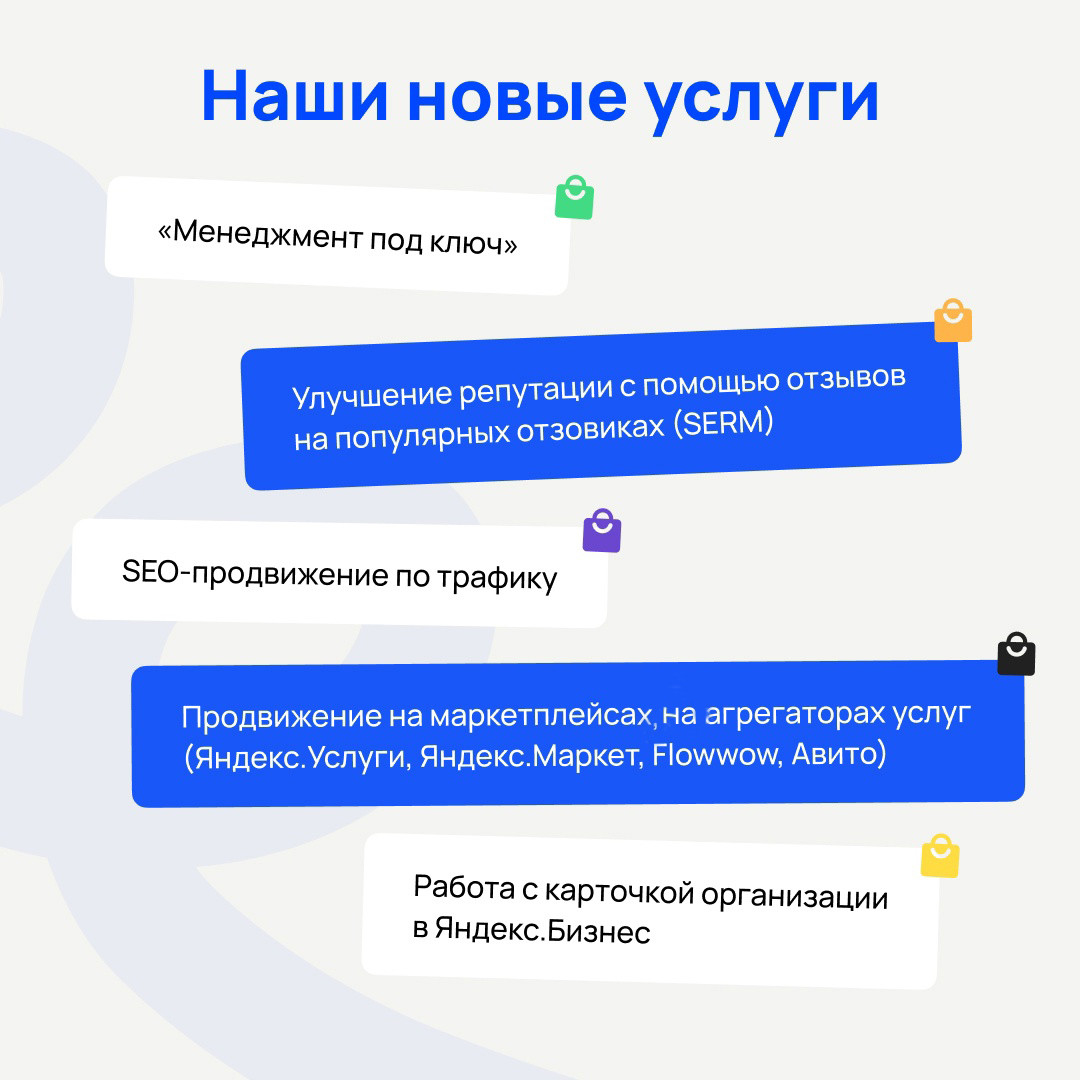 Помимо создания и продвижения сайтов, мы также оказываем услуги в области контекстной рекламы (Яндекс.Директ, Google Ads), в сфере редизайна и аудита уже существующих вебсайтов, настраиваем таргетированную рекламу во всех популярных социальных сетях, на агрегаторах услуг (Яндекс Услуги, Авито), на маркетплейсах (Ozon, Wildberries, Яндекс Маркет, Lamoda).