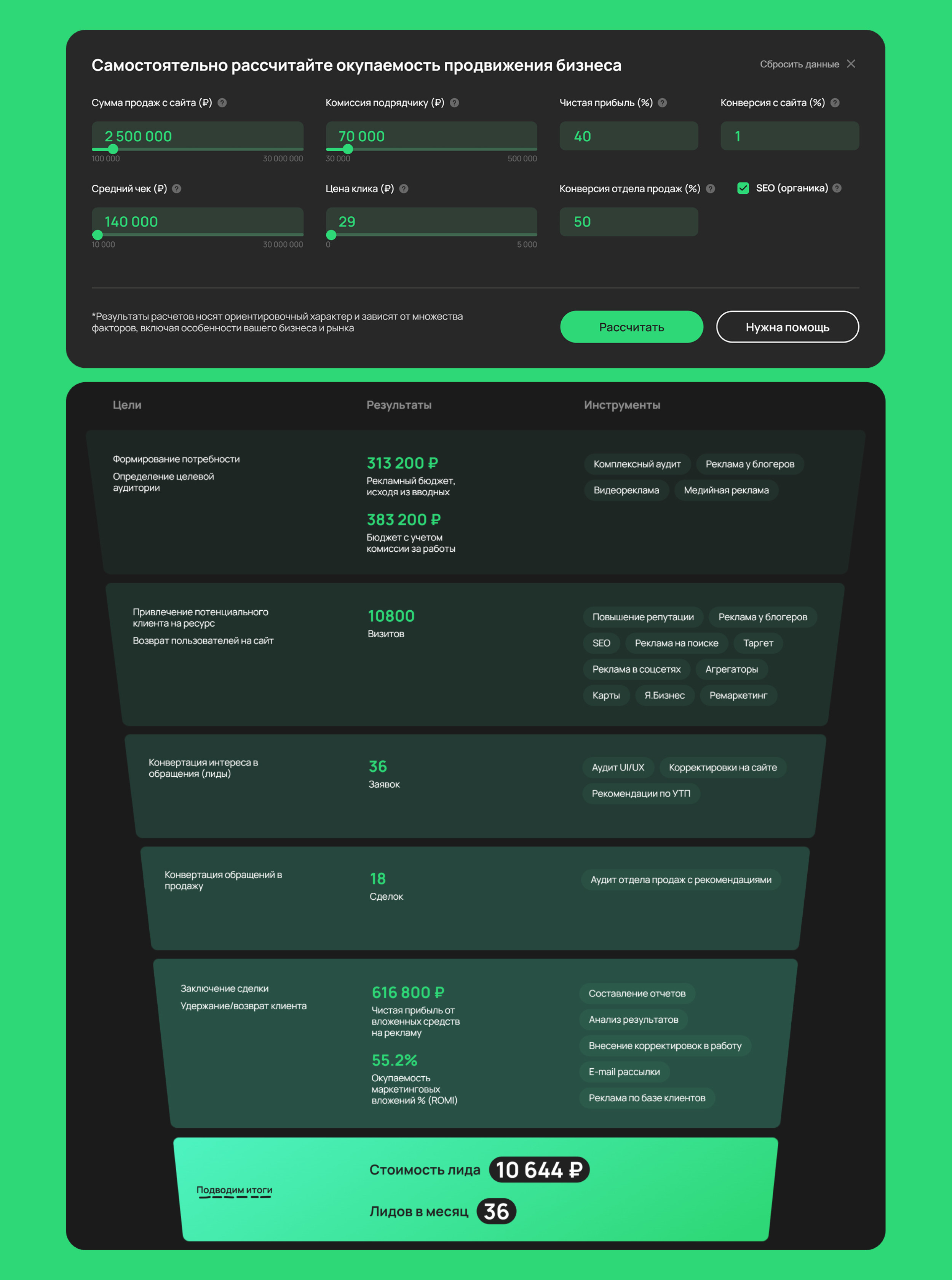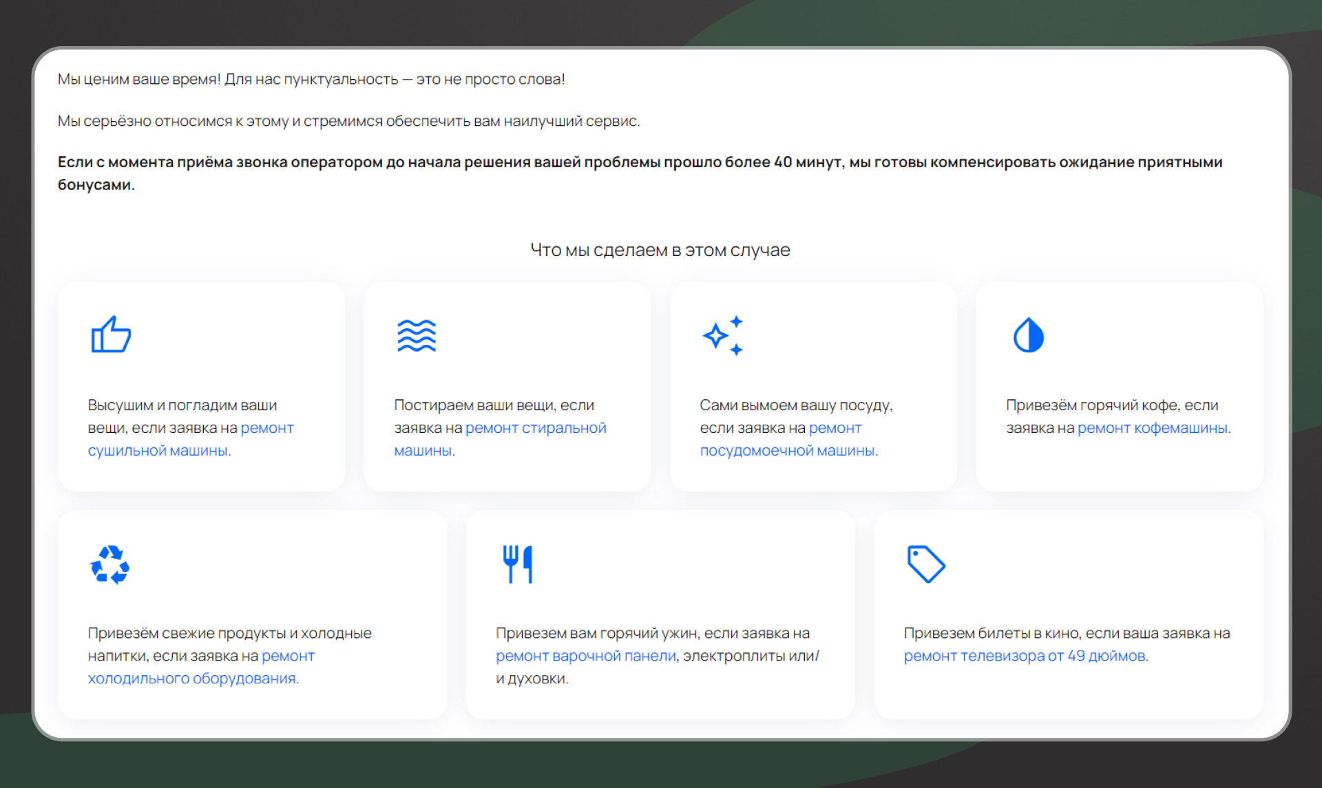 Посчитайте затраты, которые предстоят вам в первые полгода работы или хотя бы в первые три месяца, а также предполагаемый доход. Скорее всего, первое время доходы будут уходить на покрытие расходов, прежде чем бизнес начнёт окупаться. Обычно у каждой ниши на это свой срок: от полугода до нескольких лет. Также эти расчёты помогут сформулировать задачу для подрядчика, поставить измеряемую цель и запланировать бюджет на рекламу. Предприниматель знает, сколько нужно выделить денег на определенное количество заявок и сколько принесут полученные клиенты в деньгах. Цифры должны быть не просто желаемыми, а реалистичными. Если не можете рассчитать рекламный бюджет самостоятельно, приходите к нам на консультацию. Мы умеем работать с многомиллионными бюджетами и находим оптимальные решения под небольшие. Например, вы хотите понимать, сколько денег потребуется вложить в бизнес и сколько из этих вложений вернется назад. Соберите возможные статьи расходов: При планировании доходов учитывайте: Для расчёта рекламного бюджета нужно брать во внимание: Например, в рекламе Яндекса есть порог вхождения по бюджету для эффективности рекламы. Он позволяет поддерживать определённый поток конверсий в неделю для полноценной работы кампаний. Вот так выглядит расчёт окупаемости и пример медиаплана Darvin Digital: Уникальное торговое предложение — это то, что помогает вам отстроиться от конкурентов и выглядеть привлекательнее для клиентов на их фоне. В первую очередь УТП должно быть полезным для клиента, а не просто изюминкой для галочки. Думаете, что в вашей нише всё стандартно и невозможно придумать что-то новое? Давайте рассмотрим на примере ниже. Наш клиент — компания по ремонту бытовой техники на дому. Каждый в их нише обещал быстро приехать на вызов, выполнить работу качественно и недорого. Но мы пошли дальше и придумали, как превратить тезис, ставший базовым обещанием, в настоящее УТП. Если мастер приступает к работе позже заявленного срока, то компания компенсирует ожидание приятными бонусами: горячим кофе, обедом или даже стиркой вещей. Такие офферы были взяты в том числе за основу рекламных объявлений. Заказчику со своей стороны остается выполнять заявленное обещание, и это уже тема следующего пункта. Интернет-маркетинг — не волшебная таблетка, способная за один день выстроить очередь из клиентов. Это планирование, аналитика, согласования и правки. На каждом этапе важна активность и вовлеченность клиента, готовность реагировать на изменения и внедрять новые подходы в работу. Наше агентство разделяет принцип партнёрства: мы с клиентом проводим грамотный аудит и аналитику, чтобы узнать, какие каналы используются, насколько они эффективны и что можно усилить в конкретном проекте. Далее создаем стратегию и план действий, распределяем обязанности и находимся в диалоге на каждом этапе сотрудничества. Просто заплатить и появиться в конце месяца не получится. Например, старо как мир — подрядчик генерит лиды, а клиент говорит, что лиды некачественные, он с них ничего не продает. Тем временем, прослушивая записи звонков, мы не слышим ни имени оператора, ни доброжелательного тона. Некоторые операторы даже не здороваются! Такие диалоги с потенциальными клиентами — прямая инструкция, как сделать так, чтобы у вас никогда и ничего не купили. Что можно