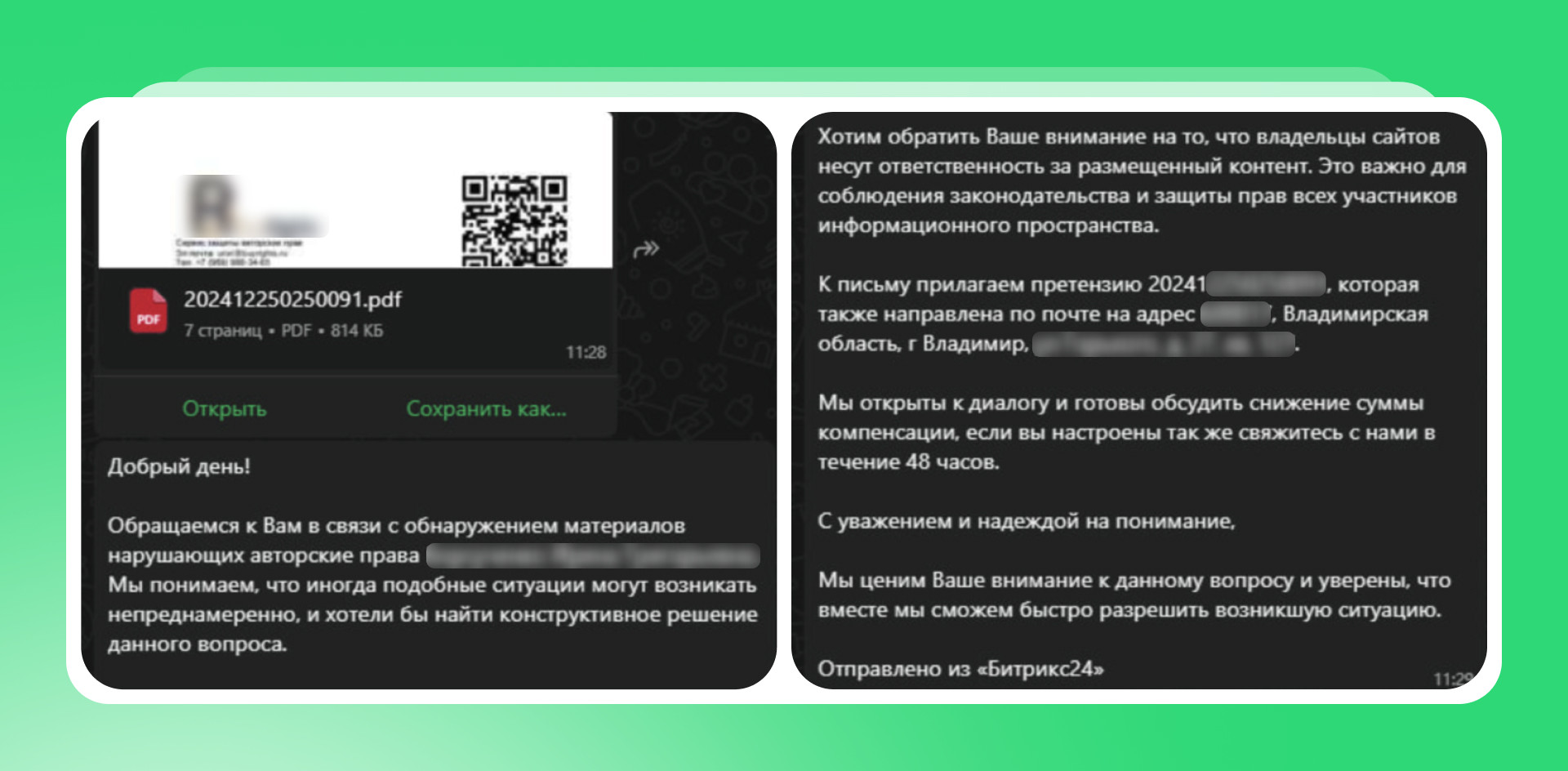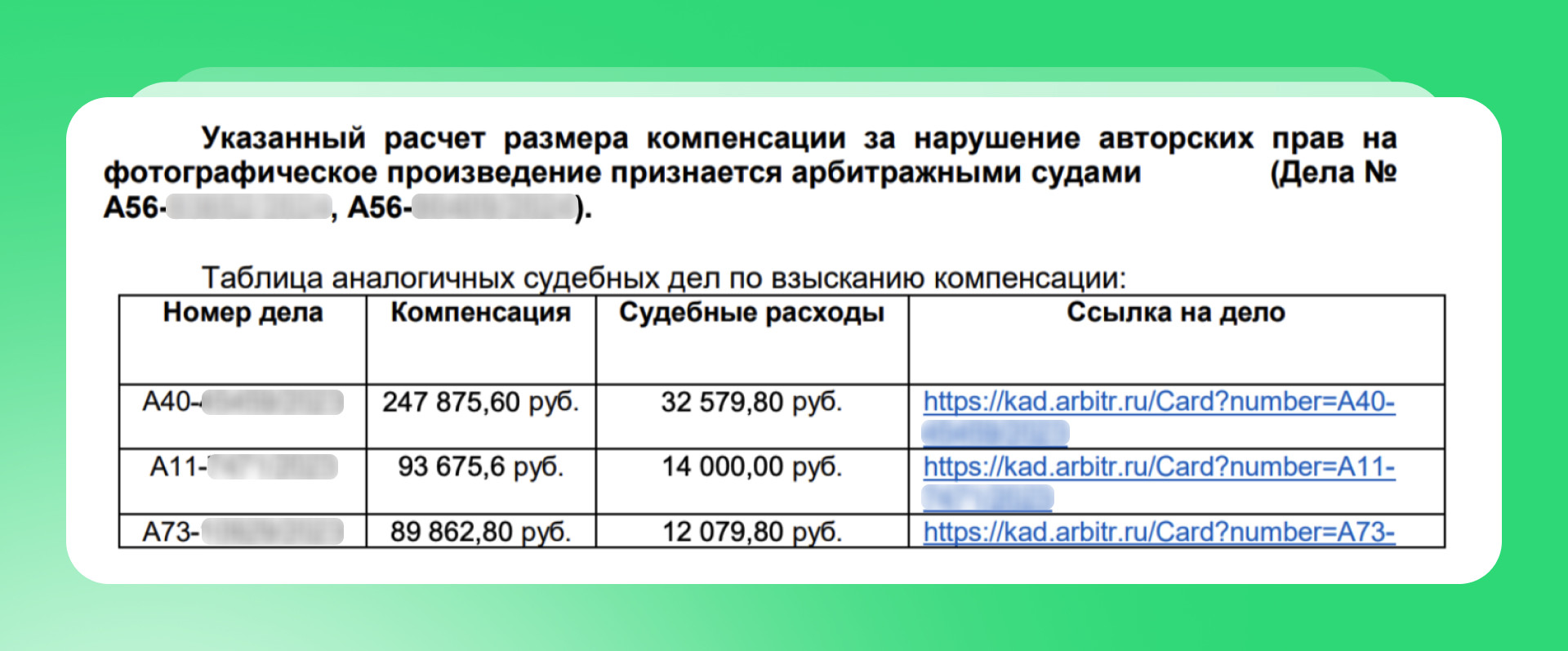 Но спустя 6 лет клиенту пришло досудебное письмо. Его уведомили, что компания незаконно использует снимок и должна выплатить компенсацию — 45 000 рублей. Внутри pdf-файла всё серьёзно: ссылки на статьи закона, примеры судебной практики с внушительными суммами. Когда владелец бизнеса связался с автором фото, оказалось, что история совсем не о жажде справедливости. Фотограф прямо сказал, что у него есть соглашение с фирмой, рассылающей претензии массово, и за каждый «закрытый» случай он получает процент. Схема проста: посредники находят авторов, оформляют с ними договор и ищут сайты, где эти снимки опубликованы. Дальше — рассылка шаблонных писем. Часть компаний платит, часть игнорирует, на кого-то подают в суд. Потоковая схема: чем больше писем, тем выше доход. И прислать такое письмо могут, как и в нашем кейсе, даже за ранее оплаченную картинку. Ничего личного. Просто бизнес. В котором ваша компания может пострадать лишь за то, что не сохранила доказательство оплаты. Мы совсем не против защиты авторских прав и считаем, что просто копировать из Яндекса или скринить понравившиеся иллюстрации — неправильно. Каждая кому-то принадлежит. Но уже в который раз сталкиваемся с тем, что перед подачей претензии никто не проверяет, действительно ли снимок был использован неправомерно. Так хорошее дело — защита авторских прав — превращается в битву бизнеса с схемой по взысканию компенсаций. Повезло, если файлы-доказательства были сохранены. В таких случаях вопрос обычно решается без суда — простым ответом с документами. В нашем кейсе всё закончилось благополучно: клиент нашёл скрин покупки. Этого оказалось достаточно, чтобы подтвердить законность использования снимка. Но сама история показательна: претензия может прилететь даже за старую публикацию, а значит хранить доказательства нужно всегда. Только за осень сразу 5 наших клиентов получили такие письма. В таких случаях за авторскими притязаниями стоит не конкретный фотограф, а целый штат юристов. Согласно расследованию РИА Новости, количество подобных исков выросло со считанных единиц в 2015 году до нескольких тысяч дел в 2024 году. А оборот этого рынка — больше 1,5 млрд рублей. Цель — не суд (он-то может затянуться на годы), а на массовая выручка. Поэтому претензии отправляют сразу сотням бизнесов, рассчитывая на быстрые досудебные соглашения с компенсацией. Без юридических документов у компаний практически нет шансов защититься. Если нет документа, который подтвердил бы факт покупки, то взыскание происходит почти автоматически. Проблема в том, что авторы массовых рассылок досудебных претензий опираются на реально существующие законы, где компенсация от 10 000 до 5 000 000 рублей за одну фотографию. Но на деле — это самая настоящая схема по взысканию компенсаций. Выбор у бизнеса невелик: если письмо упало вам в ящик, то вы ограничены временными рамками. У нашего клиента было 48 часов на отпор. Либо платите по «скидке» из письма, либо идёте на судебный процесс. Главное — иметь подтверждение легальности использования картинки. Любой скрин, чек или подтверждающее письмо от фотобанка, а также скриншоты истории покупок снимают претензии. По поводу Depositphotos. Да, с 2022 года сервис прекратил продажу подписок и вообще заблокирован в России. Но несмотря на ограничения, любая ранее оформленная лицензия остаётся