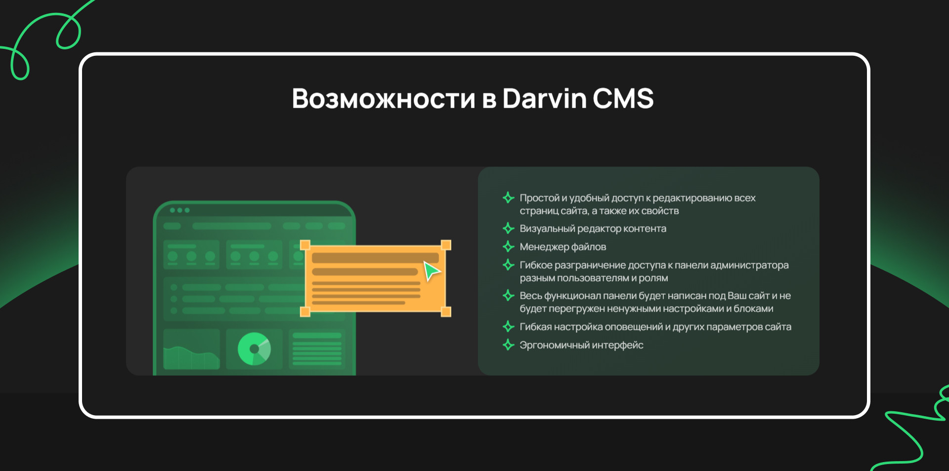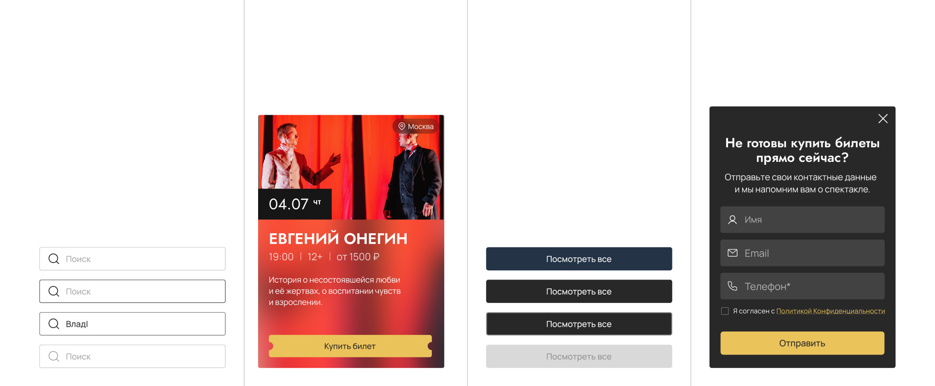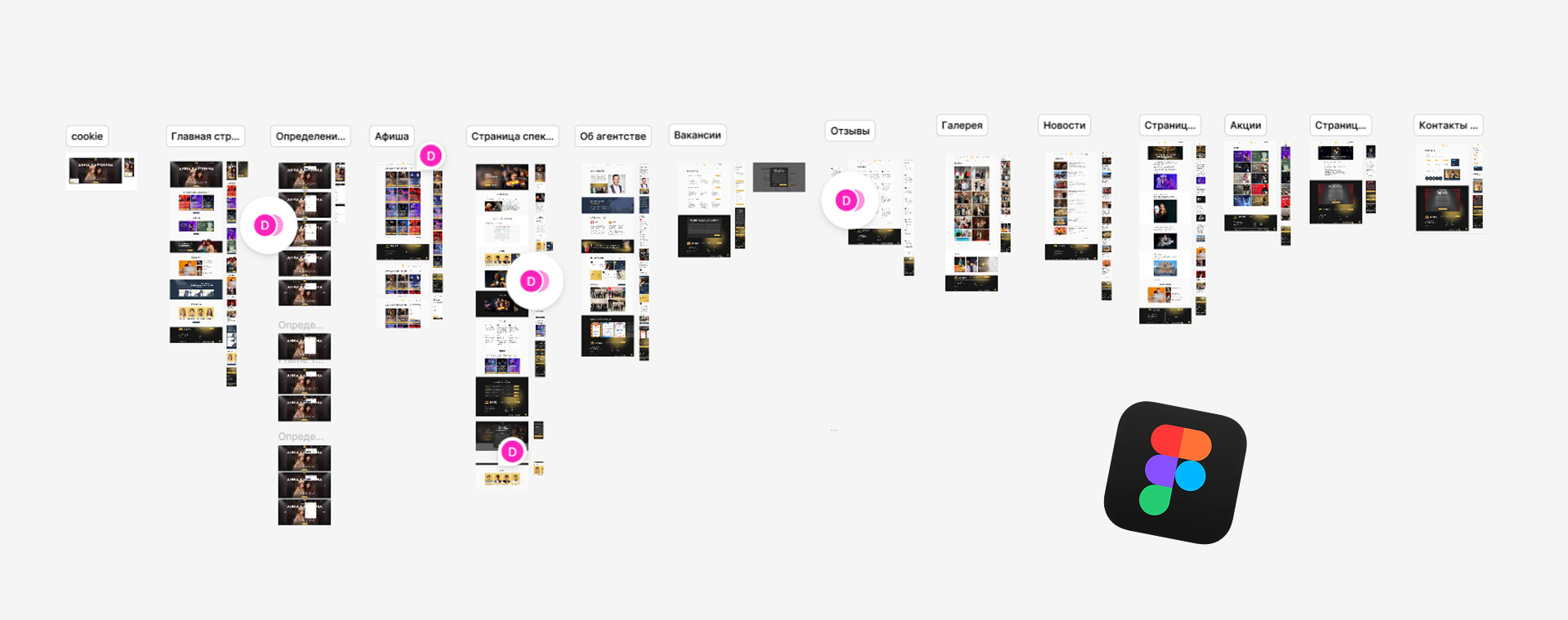 До нас агентство «жило» в группе во «ВКонтакте» и на небольшой посадочной странице-визитке. Под каждый спектакль создавали отдельный лендинг на конструкторе Tilda. С ростом количества городов и премьер таких страниц стало десятки. С одной стороны — простая система продажи билетов, с другой — большое количество разрозненных мини-сайтов с продублированным контентом. Сначала такая схема казалась удобной: есть событие → создаём страницу → запускаем рекламу и продаём билеты. Но чем быстрее рос бизнес, тем больше возникало проблем: У малого и среднего бизнеса часто всё начинается с простого сайта или лендинга для теста гипотез. И это нормально. Но потом появляются филиалы, новые города, направления и продукты, а бизнесу по-прежнему кажется, что под каждую задачу можно просто сделать ещё один лендинг. Проблема в том, что большое количество посадочных почти всегда убивает масштаб проекта. Почему? Потому что лендинг создаётся для решения точечной задачи, а не для управления процессами. Кстати, недавно на примере бизнеса по доставке китайских авто в Россию детально рассказали, почему управление бизнес-процессами — это самое важное в масштабировании и росте. Прочитать новую статью CEO Darvin Digital Ильи Федулова о том, почему для увеличения LTV бизнесу важен совсем не маркетинг, а то, как выстроены бизнес-процессы в компании можно здесь. Мы предложили клиенту собрать всё в одну цифровую систему — современный сайт с акцентом на удобный поиск спектаклей и простой доступ к билетам. Потому что он решает все обозначенные выше боли и помогает поисковому продвижению. Вместо множества страниц с дублирующимся контентом, которые конкурируют между собой, мы получаем один мощный домен. Так поисковая оптимизация работает на один сайт, который может ранжироваться по множеству запросов. Хотите так же: один домен вместо десятков лендингов, одна админка вместо ручного копипаста, одна структура вместо вечного «где какая версия страницы»? Оставьте заявку на создание сайта — бесплатно разберём ваш кейс и предложим решение. Начали со структуры и логики многостраничника. После — работа над визуальной концепцией первого экрана. Были созданы три варианта дизайна. Каждый по-своему раскрывал атмосферу проекта и задавал направление для дальнейшего оформления. Главная идея этого дизайна — с первых секунд погружать пользователя в атмосферу театра. Поэтому на первом экране крупные портреты артистов, направленный свет, словно прожектор на сцене, и выверенная композиция. Центр в фокусе — именно туда попадает взгляд, именно там размещены ключевые блоки. Кнопки «Купить билет» стилизованы под театральные билеты — маленький штрих, который делает интерфейс неформальным и цепляющим. А карточки ближайших дат — яркие и заметные, чтобы пользователь сразу видел актуальное расписание. А за счёт лёгкого размытия фона создаётся глубина — визуальный приём работает на эмоции, усиливая эффект присутствия. Этот дизайн делает ставку на фотографии — никаких лишних украшений, только визуал самих спектаклей. Картинки говорят за себя: атмосферные, выразительные, они передают настроение постановок без дополнительных графических элементов. Навигация реализована через превью слайдов — визуальные подсказки помогают быстро сориентироваться и переключаться между разделами. В к