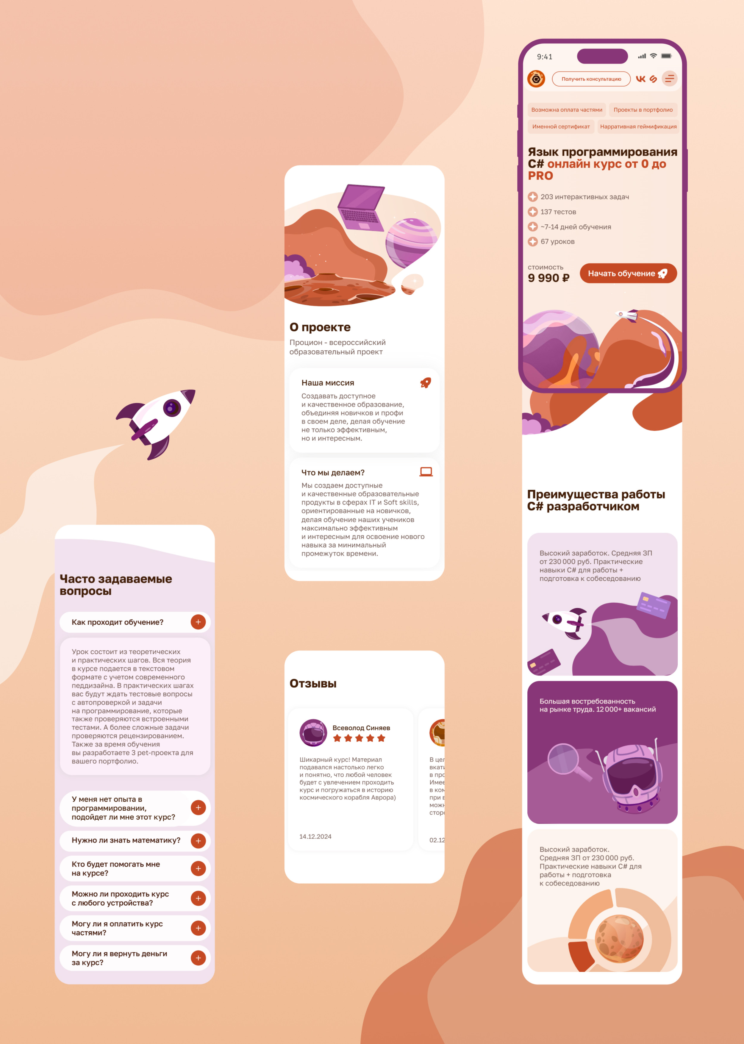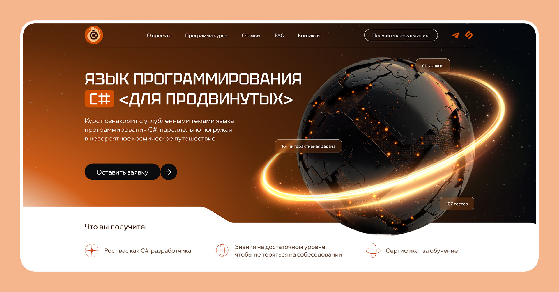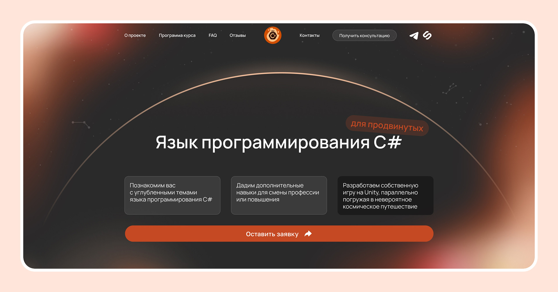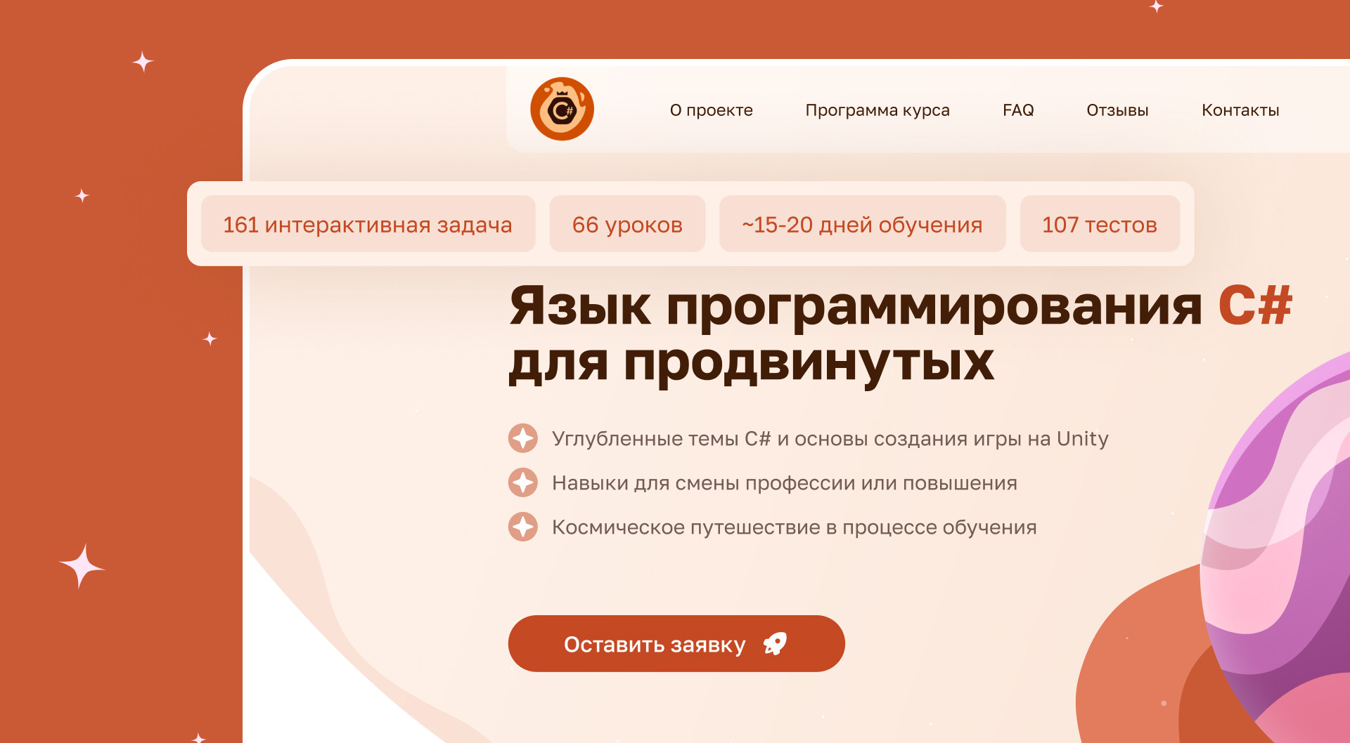 Наш клиент — образовательный проект «Процион». Компания создаёт доступные продукты в сфере IT, рассчитанные на новичков. Помогает освоить новые навыки за минимальный промежуток времени. В Darvin Digital специалисты обратились за лендингом на Tilda для курса по программированию на языке C#. Основная точка продаж до этого — платформа Stepik.