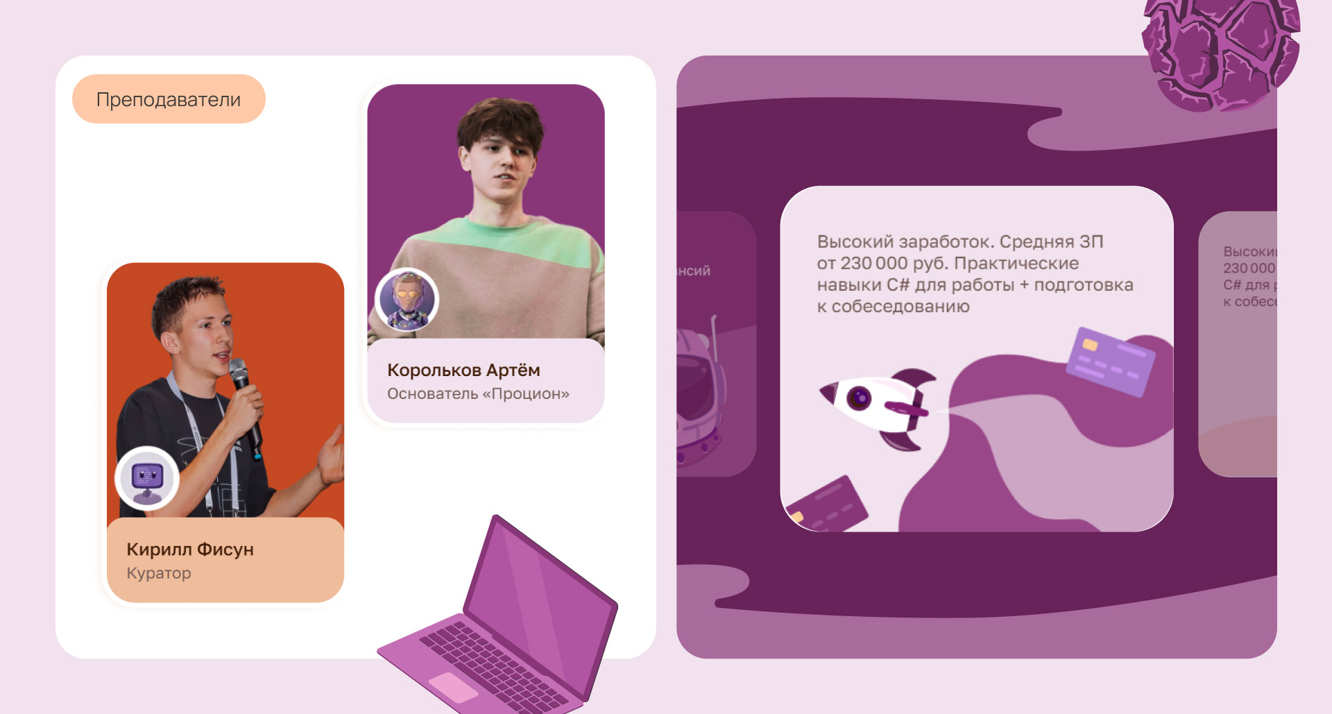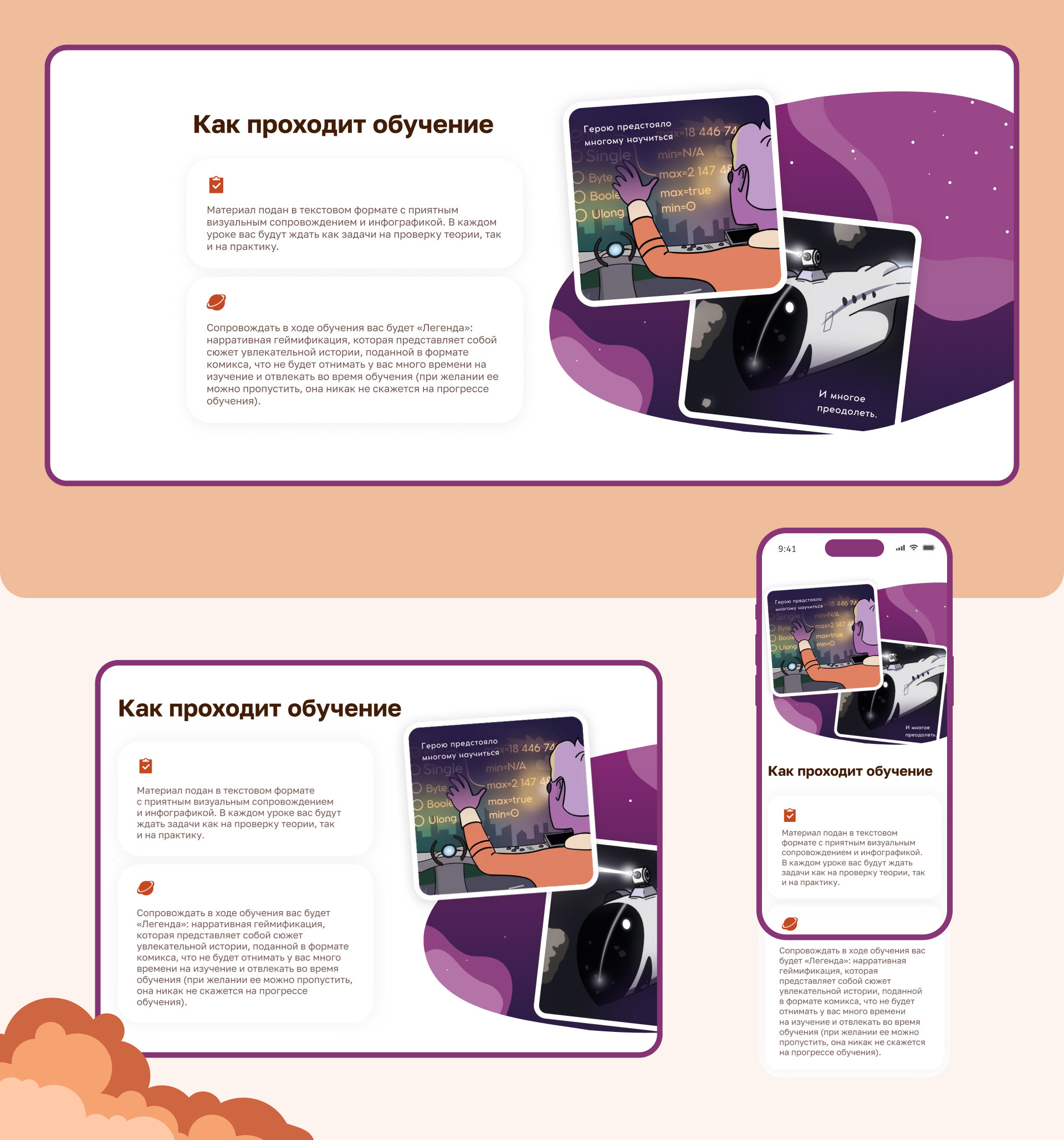 «С помощью иллюстраций мы погружали посетителей сайта в продуктовую систему клиента. Чтобы пользователи сразу понимали, что из себя представляет этот продукт: как подана информация на сайте и как потом она будет подана в курсе. На этом этапе мы сделали хорошую отсылку и соотнесли внутренний продукт и отдельный канал коммуникации — новый лендинг. Я думаю, это одно из самых важных, что нам удалось сделать. И в итоге мы получили такой уникальный сайт».