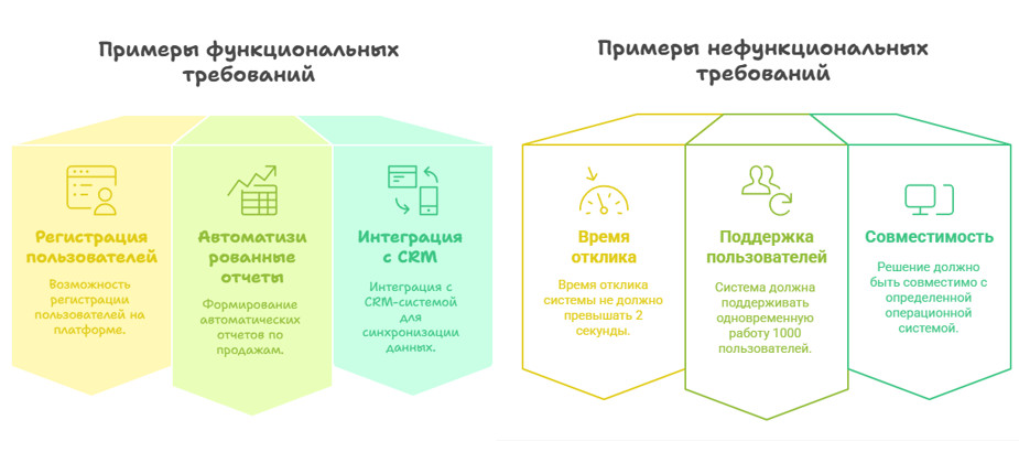 - Нефункциональные требования: отвечают на вопрос «Как система должна это делать?»