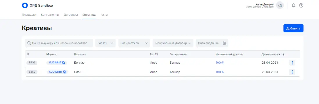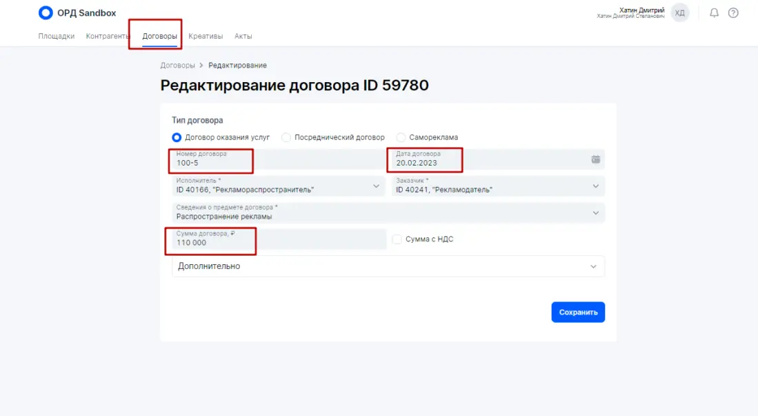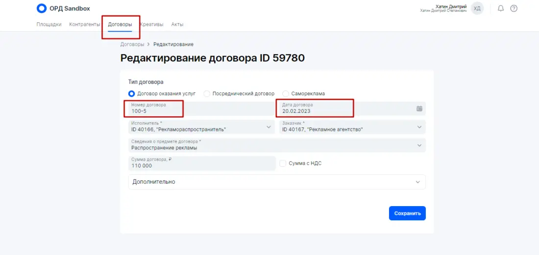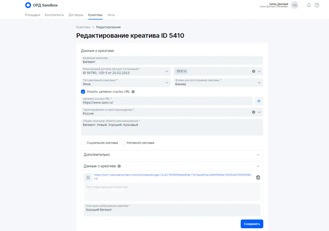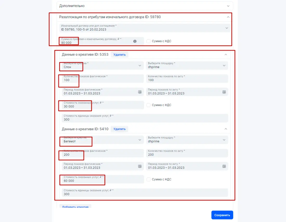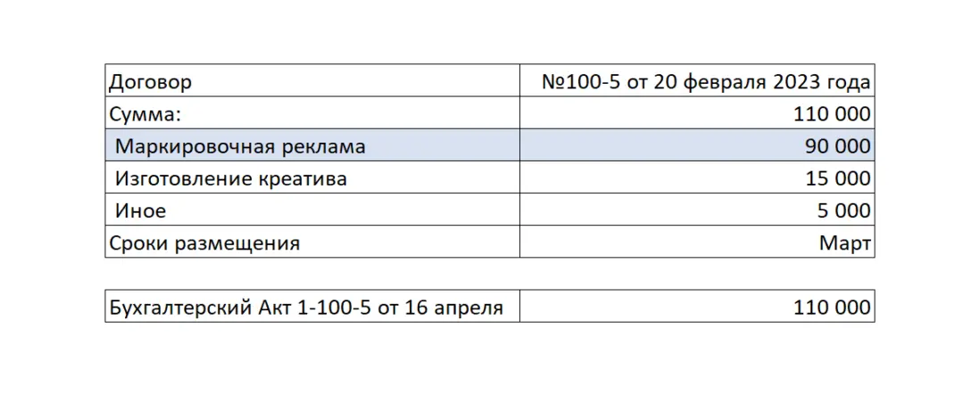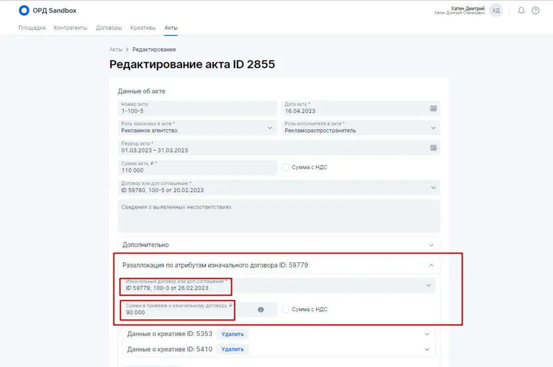 *Блогер (владелец интернет-площадки) — это юридическое лицо, ИП либо физическое лицо, которое обладает собственными интернет-ресурсами для распространения рекламы : сайты, аккаунты в соцсетях, YouTube-каналы, телеграмм-каналы и прочих интернет ресурсов, которые могут быть использованы каким-либо образом для размещения рекламных материалов Предположим, что между контрагентами данной цепочки есть в наличии договор на оказание услуг, который включает в себя не только непосредственное размещение рекламных материалов. После размещения блогер выставил бухгалтерский (бумажный) акт. В итоге на основании этих данных будем выстраивать отчетность в ОРД (на примере ОРД Озон) Если бы Блогер имел достаточную экспертизу насчет исполнения закона о маркировке рекламы, то все необходимые действия для данной цепочки он сделал бы в ОРД сам (см. выше — Исходные правила), так как у него статус Доходного договора (почему важен статус именно Доходного договора смотрите мой системный видеоматериал здесь) с необходимой разаллокацией по креативам и по Изначальному договору (почему важен Изначальный договор смотрите мой системный видеоматериал здесь). Однако, реальности таковы, что Рекламодателю придется всю отчетность оформлять самостоятельно, так как Блогер не умеет работать с ОРД. Подчеркну (см. выше Исходные правила), по закону (для данной цепочке) Рекламодатель не обязан заносить данные и отчетность в ОРД, так как он может делегировать это своему Контрагенту (Блогеру) — эти обязательства закрепляются в договоре Что должен сделать Рекламодатель в своем ОРД? Рассмотрим пошаговые действия на примере ОРД Озон: 1. Получить аккаунт в ОРД 2. Указать площадку Блогера, где будут размещаться рекламные материалы (сайт, аккаунт в соцсетях...) 3. Добавить Контрагентов. Рекламораспространитель это и есть Блогер (владелец интернет-площадки) 4. Указать, что площадка принадлежит Рекламораспространителю (Блогеру) 5. Занести договор с атрибутами точь-в-точь как у бухгалтерского (бумажного) договора. 6. Оформить креативы и получить токены для непосредственной маркировки. Допустим Рекламодатель размещает на интернет-площадке Блогера два баннера Слон и Бегемот в марте 2023 года. Вместо этого могут быть иные рекламные материалы, например два поста в соцсетях блогера в марте 2023 года. Оформление каждого конкретного креатива интуитивно понятно и не составляет проблем. 7. После размещения рекламных материалов Рекламодатель должен оформить отчетность в ОРД с помощью Актов с необходимой разаллокацией по креативам и изначальному договору. В нашем случае Изначальный договор и Договор между Рекламодателем и Блогером это одно и тоже, ввиду того, что цепочка короткая состоит из двух контрагентов. В Актах Рекламодатель сначала укажет данные по бухгалтерскому акту закрытия, который обязан выставить Блогер для Рекламодателя. Атрибуты в ОРД должно быть указаны точь-в-точь, как в бухгалтерском акте. Причем (это очень важно) сумму в ОРД надо указать полную 110 000 рублей, как в акте. Далее в Актах идет блок насчет разаллокации (детализации) в разрезе креативов и изначального договора Как я указал выше, в нашем случае изначальный договор и договор Рекламодатель-Блогер это одно и тоже. Сумма должна быть указана ТОЛЬКО за маркировочную рекламу — 90 000 рублей. Теперь разаллокация по креатива