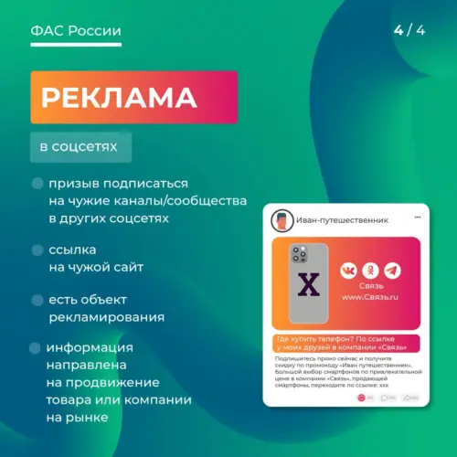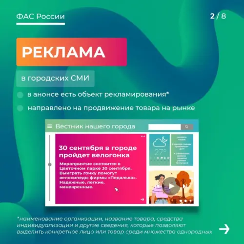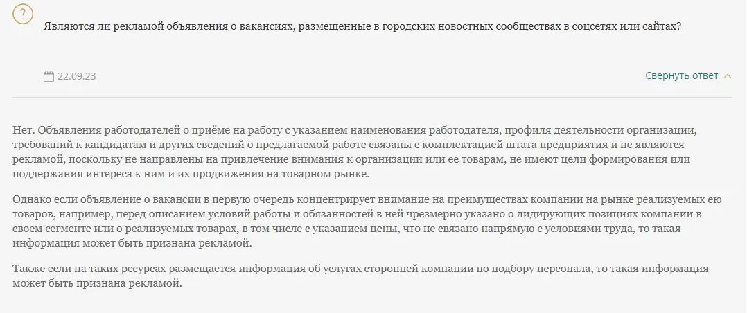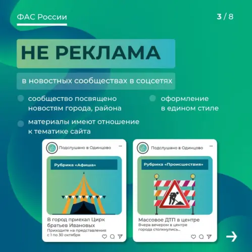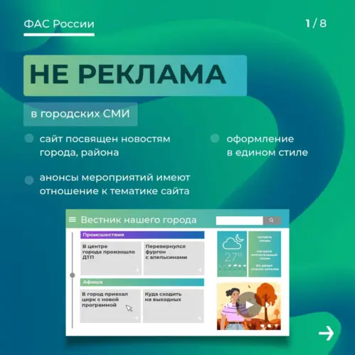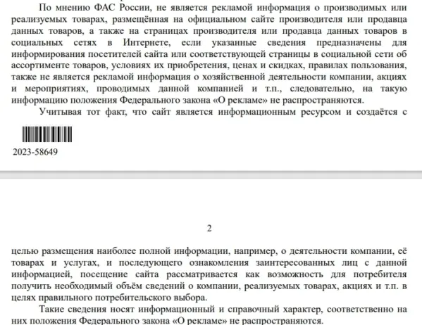 Итак, рассмотрим официальные методички ФАС, которые помогут решить многие вопросы при проецировании указанных нарративов на ваши кейсы либо обозначат ориентиры для исполнения закона о маркировке рекламы. Я уверен, что среди слайдов ФАС вы найдете очень важную для себя информацию с моими комментариями. № 1 Базовая информация о том, что в подавляющем большинстве случаев любой контент на своих ресурсах (сайты и соцсети) несет справочно-информационную сущность. Самое главное в своих соцсетях не закреплять свои посты про свой отдельный товар, услугу либо мероприятие и не делать сквозной (всплывающий) баннер на собственном сайте Скан из официального ответа ФАС по кейсу интернет-магазина № 2 Размещение в своих соцсетях постов о товарах из чужих интернет-ресурсов и ссылками на них. Например, в своей ленте вы по коммерческой договоренности публикуете чужой товар с другого сайта вне ассортимента вашего каталога. При клике на него происходит переход на чужой сайт либо аккаунт в соцсети вашего контрагента. № 3 Публикации любого каталога с вашем ассортиментом товаров на вашем сайте является справочно-информационной сущностью и маркировке не подлежит. № 4 Публикация на своем сайте баннеров либо текстовых блоков с чужими товарами, которые не входят в ассортимент вашей продукции и ведут по ссылкам на сайты третьих лиц. № 5 На вашем сайте либо на маркетплейсе присутствует всплывающий баннер, который проявляется на других страницах интернет-ресурса, которые по контенту никак не связаны с данным товаром. И, следовательно, выделяются особым образом среди контента данной страницый товар либо группу товаров среди другой продукции из вашего ассортимента № 6 На вашем сайте либо на странице вашего аккаунта в маркетплейсе присутствует сквозной (закрепленный) баннер, который проявляется на других страницах вашего интернет-ресурса, которые никак не связаны с данным товаром № 7 Размещение информации на тематическом сайте (профильные интернет-ресурсы либо в тематических пабликах с обзорами товаров и услуг у блогеров).В данном слайде ФАС некорректно указала, что не должно быть ссылок на ресурс, хотя по ответам на кейсы ФАС никогда не запрещала на профильных и тематических ресурсах указывать ссылки. Самое главное условие было, чтобы объявление совпадало по контенту с тематикой ресурса, было оформлено в едином стиле по сравнению с другими материалами (постами). По-видимому, они имели ввиду совокупность причин, но ссылка никогда самостоятельно не являлась критерием рекламности материала. № 8 Очень важная информация для всевозможных городских пабликов с разнообразной информацией о жизни города (новости, политика, выборы, выставки, происшествия, ярмарки и пр). Кстати нашумевший нижегородский кейс был связан как раз с городским пабликом. № 9 Анонсы мероприятий не крамольны с точки зрения маркировки рекламы, но нельзя указывать в анонсе конкретную фирму и сообщать об ассортименте ее продукции. № 10 Материалы должны относиться к тематике ресурса и формлены в едином стиле без закрепов, иначе возможны проблемы. Мы все помним про новосибирский кейс, когда именно закрепы привели к тому, что ФАС квалифицировало пост в ВК как рекламный со всеми вытекающими последствиями. № 11 Типичный посев в новостном ресурсе требует маркировки про коммерческое предл