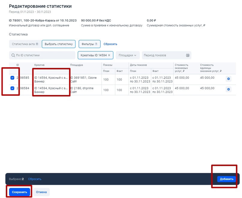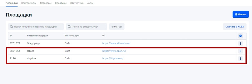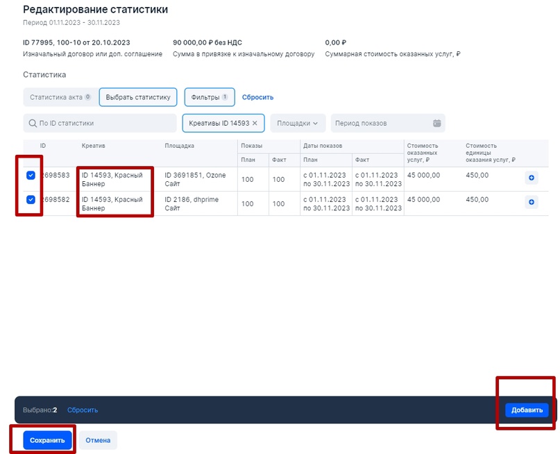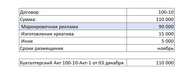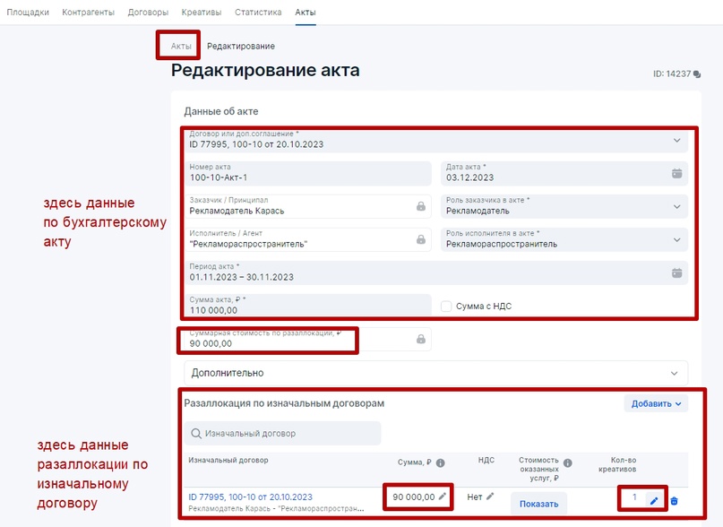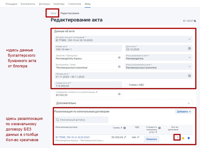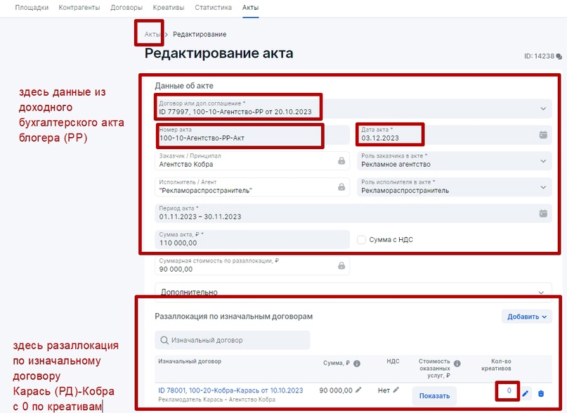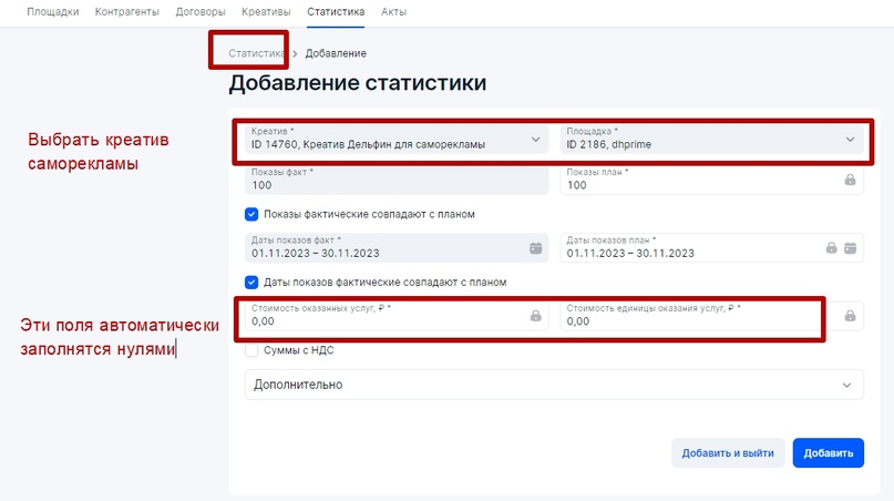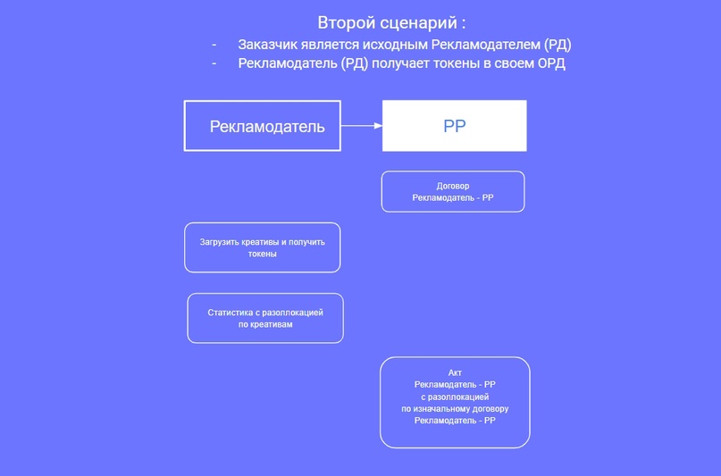 Если РД переводит деньги за размещение РИМ непосредственно РР, то ПСР в рекламной цепочке не присутствует: Для того, чтобы избежать дублирования данных в ЕРИР, при оформлении отчетности в ОРД для каждой рекламной связки внутри рекламной цепочки надо принимать следующее: Базовая схема, которая может быть интегрирована в любые кейсы с участием РР, где по договору рекламораспространитель должен заполнять отчетность в ОРД за связку Заказчик-РР (см. раздел Исходные правила для оформления отчетности в ОРД) Рекламораспространитель в обязательном порядке, когда к нему приходит Заказчик, должен узнать, является ли тот исходным Рекламодателем или Посредником при организации процесса оформлении рекламы в ОРД со своей стороны. На основании полученной информации для базовой схемы может присутствовать один из четырех сценариев, который потребуется оформить в ОРД. Остановимся на каждом подробнее. Изначально предположим, что между Рекламодателем и РР есть договор 100-10 от 20 октября на размещение рекламных материалов в ноябре 2023 года и дополнительным работам по договору (креатив и иные виды услуг). По окончании размещения РР (блогер) выставит для Рекламодателя бухгалтерский (бумажный акт) от 03 декабря 2023 года на общую сумму работ по договору. Этапы отчетности для Первого сценария: РР заполнит информацию о себе, поставит галочку Рекламораспространитель и прикрепит интернет-площадки, которые ему принадлежат. Далее оформит данные по Рекламодателю: Важно: прикрепление креативов в блоке Креативы всегда производится к Изначальному договору (договор между Рекламодателем и его первым контрагентом). В нашем случае, при короткой рекламной цепочке, Изначальный договор и договор РД-РР это одно и то же, поэтому в блоке Креативы указан наш договор № 100-10 от 20 октября 2023 года (он автоматически появится в меню поля при выборе) Напомним, что за атрибутами маркировки (Реклама и Название рекламодателя) следит ФАС, а Роскомнадзор отслеживает наличие атрибута erid (токен) на РИМ и контролирует отчетность в ОРД. Базовый вариант маркировки рекламного материала: Как маркировать рекламу, а именно каким образом наносить атрибуты маркировки на различные форматы РИМ можно посмотреть в моей публикации. Сначала для удобства следует оформить блок Статистика, в котором РР занесет данные по показам для каждого креатива и для каждой площадки. Так как у нас креатив был один, то в блоке Статистика будет присутствовать две строчки — каждая для своей площадки. Итак, в блоке Статистика нажмем Добавить и поэтапно добавим каждую площадку. Напомним, площадки размещения РИМ мы добавили в самом начале практической части и прикрепили их к РР (рекламораспространителю). Добавляем первую площадку — Ozone. Указываем количество показов, которые можно взять из систем аналитики платформы размещения (например из ленты ВК либо системы аналитики ВК) либо с помощью Яндекс Метрики со своего сайта, указывая количество посещений страницы, где был размещен рекламный материал. Этого будет достаточно. Указываем точный срок размещения, если бы у нас было размещение с 10.11.23 по 30.11.23, то указать надо именно его. Так как у нас общая сумма, которая была выделена на размещение 90 000 рублей, а площадки две, то мы смело указываем сумму для текущей площадки в размере 45 000 рублей либо можно распределить эту сумм