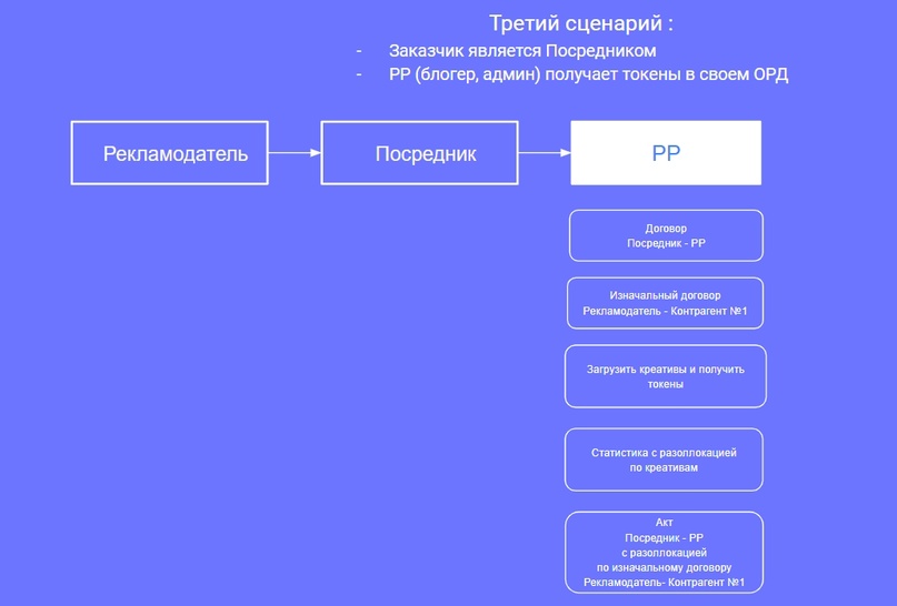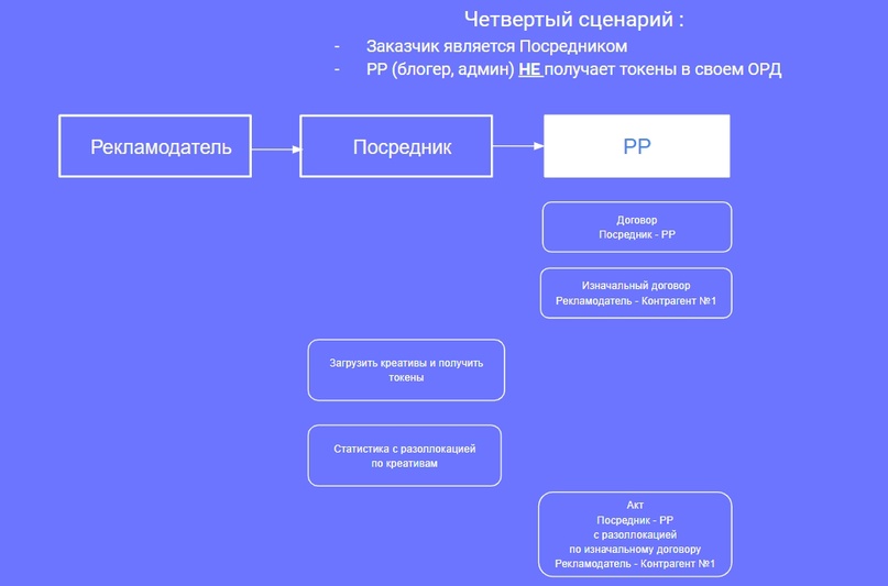 Практически во всех, причем заказчиком для блогера может быть непосредственно Рекламодатель (РД) либо Посредник (ПСР) в лице рекламного агентства, биржи либо рекламной платформы. В принципе, все рекламные цепочки можно описать единой схемой, где РД переводит финансовые средства за размещение рекламно-информационных материалов (РИМ) в интернете на счет ПСР. Далее Посредник переводит средства непосредственно рекламораспространителю (РР) — владельцу интернет-площадки (сайта, соцсети, тг-кнала, ютуб-канала и т.д).