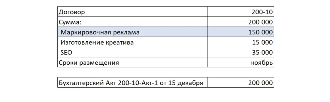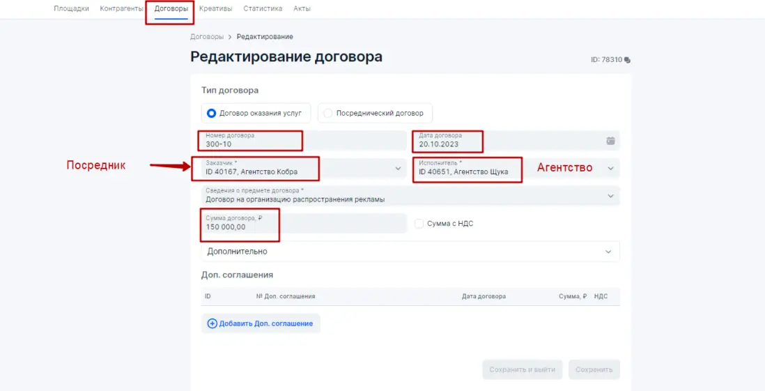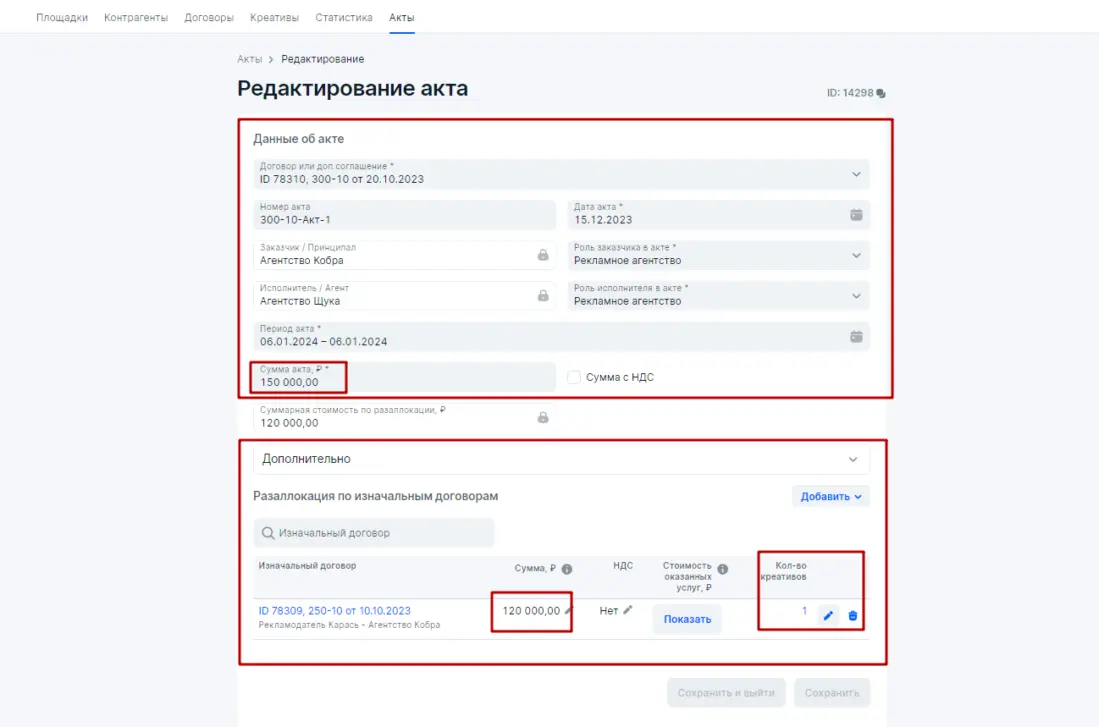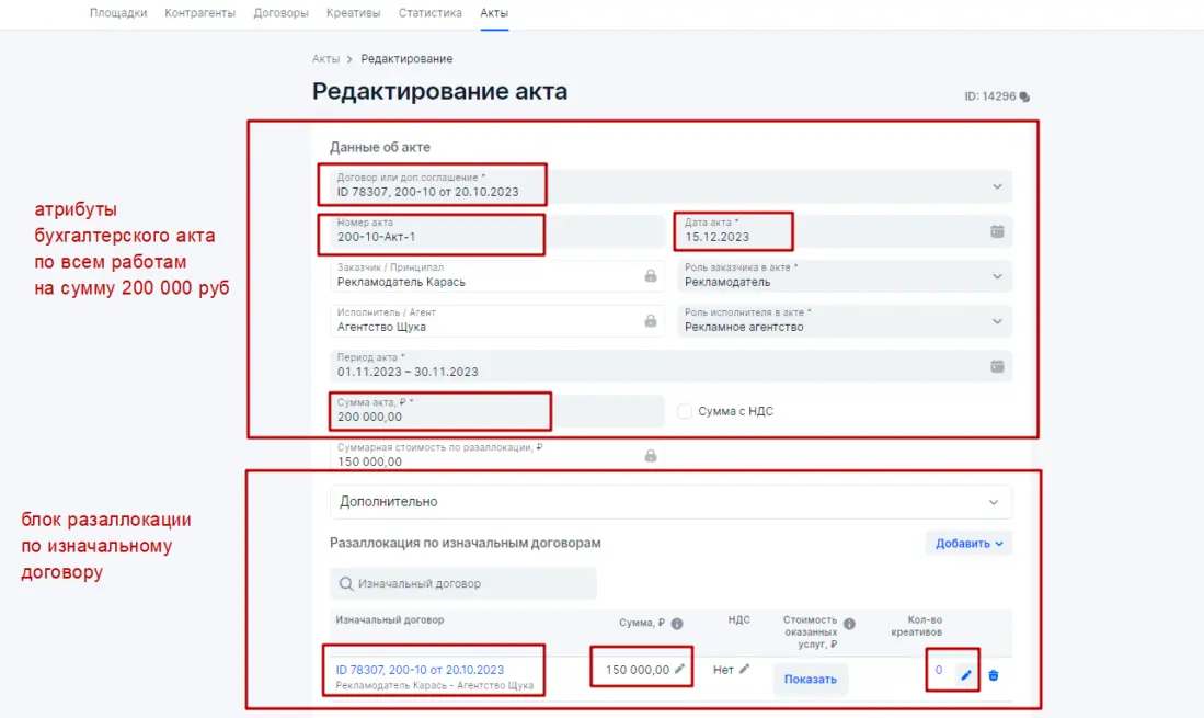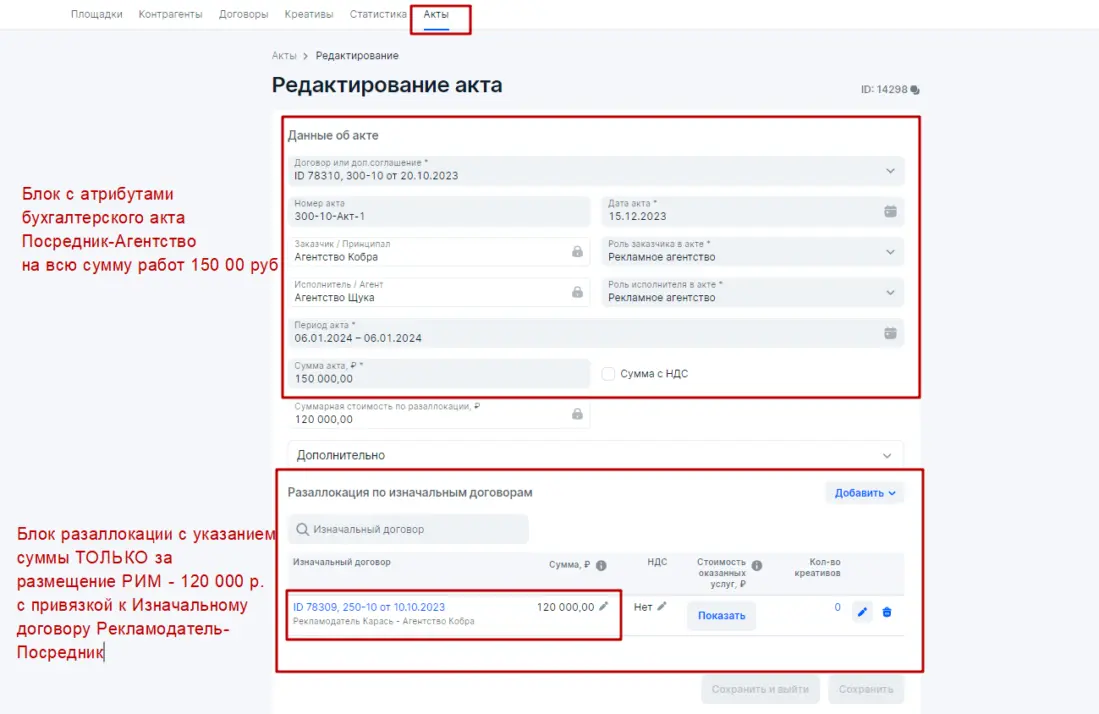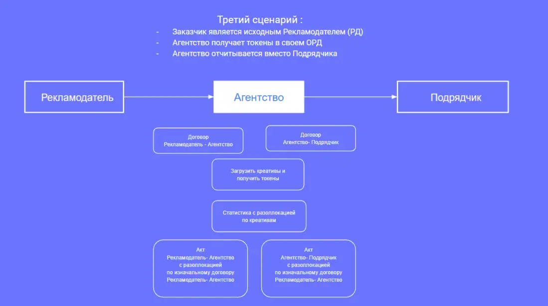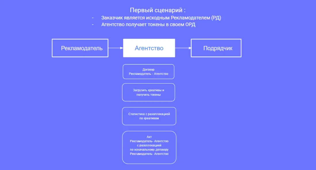 Классическая рекламная цепочка, где участвует Агентство в статусе ИП либо ООО В предыдущей статье было подробно разобрано, почему по закону Посредником не может быть физлицо в статусе Самозанятый Для того, чтобы избежать дублирования данных в ЕРИР, при оформлении отчетности в ОРД для каждой рекламной связки внутри рекламной цепочки надо принимать следующее: Естественно, Заказчиком здесь может быть как исходный Рекламодатель, так и другое Агентство (Посредник) и тогда цепочка будет более длинной слева. А Подрядчиком может быть как Рекламораспространитель (РР — владелец интернет-площадки ), так и другое Агентство либо ОРС (оператор рекламных систем — например, Яндекс Директ, ВК реклама) либо биржа (Telega.in, WOWBloger и мн. другие), что приведет к удлинению рекламной цепочки справа. Что важно для Агентства? Обозначим подробные инструкции для каждого сценария: Первый сценарий: связка Рекламодатель-Агентство Сторонами Рекламодатель-Агентство была заключена договоренность, оформленная в договоре, что обязанность произвести отчетность в своем ОРД за связку (договор) между Рекламодатель-Агентство возьмет на себя Агентство (Доходный договор), в том числе Агентство получит токены в своем ОРД. Важно следующее, кто получает токены, тот по ним и отчитывается с разаллокациями (детализацией) по креативам и площадкам. Краткий перечень работ Агентства в ОРД по первому сценарию: 1. Указать площадки размещения РИМ в блоке Площадки 2. Занести Контрагентов для договора Рекламодатель — Агентство в блоке Контрагенты 3. Прописать договор Рекламодатель — Агентство (статус Изначальный договор) в блоке Договоры с атрибутами официального бухгалтерского договора 4. Загрузить креативы и получить токены для РИМ в блоке Креативы 5. Сделать разаллокацию по креативам в блоке Статистика до 30 числа после месяца размещения 6. Выставить бухгалтерский закрывающий Акт по своем доходному договору 7. Произвести заполнение информации в блоке Акты ОРД на основании бухгалтерского Акта из п.6 до 30 числа после месяца размещения с разаллокацией (детализацией) по Изначальному договору (договор Рекламодатель-Агентство) с прицеплением разаллокации по креативам из блока Статистика. Изначально предположим, что между Рекламодатель и Агентство есть договор 200-10 от 20 октября на размещение рекламных материалов в ноябре 2023 года и дополнительным работам по договору (креатив и SEO). Рекламодатель оплатил услуги Агентства 10 декабря. Агентство выставит для Рекламодателя бухгалтерский (бумажный акт) 200-10-Акт-1 от 15 декабря 2023 года на общую сумму работ по договору в размере 200 000 рублей. Этапы отчетности для Первого сценария: Как сказано выше Агентство зафиксирует в договоре, взяв на себя все работы и ответственность по занесению всей необходимой отчетности за связку (договор) Рекламодатель — Агентство. Рекламодателю не потребуется выполнять каких-либо действий у себя в ОРД. 1. Агентство в своем ОРД, в котором оно предварительно зарегистрировалось и получило аккаунт, должно указать интернет-площадки в блоке Площадки, где будет происходить размещение РИМ от Рекламодателя. 2. Агентство в блоке Контрагенты укажет данные контрагентов (требуется ИНН) по вышеуказанному договору № 200-10 от 20 октября 2023 года — себя, как Агентство Щука в статусе ИП и Рекламодателя, как Рекламодатель Карась в стату