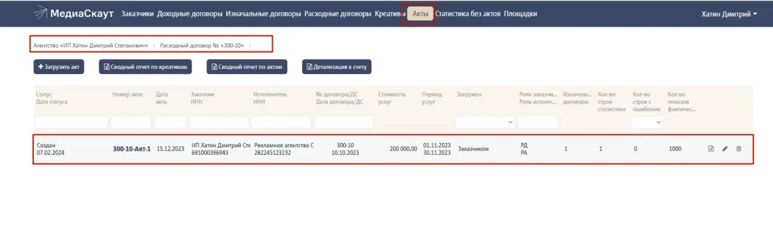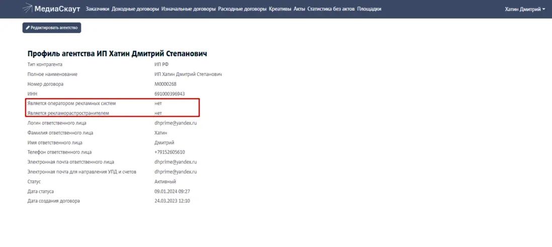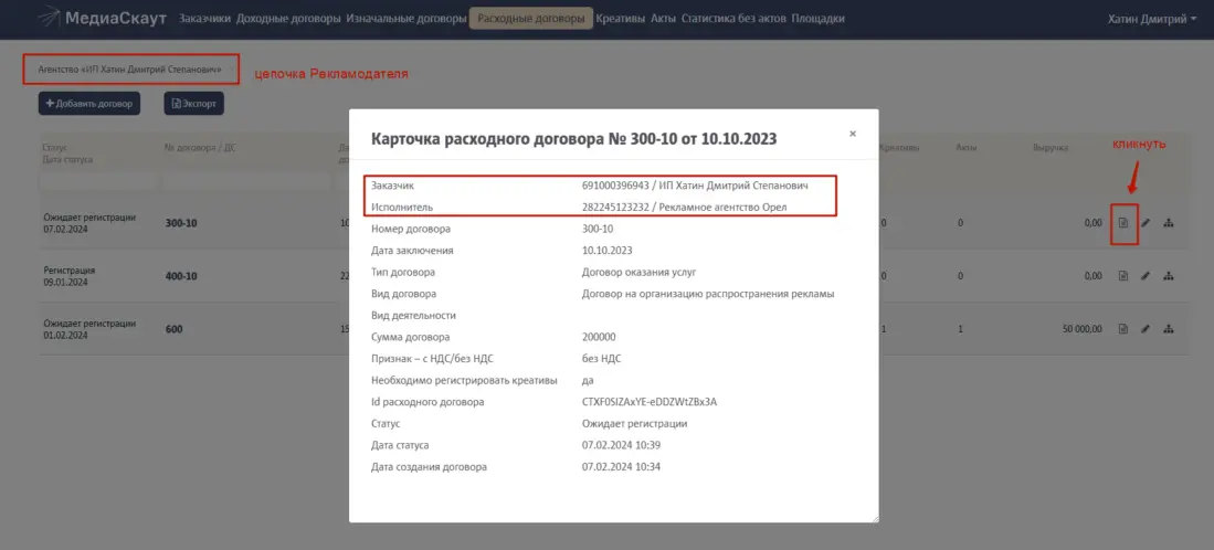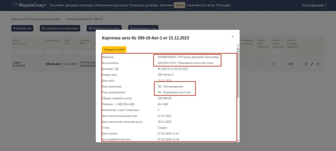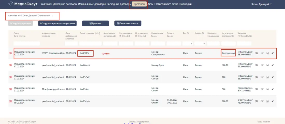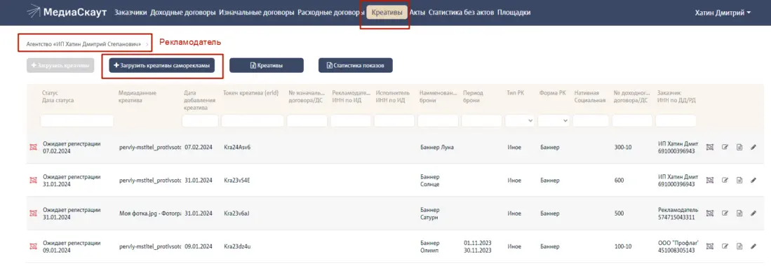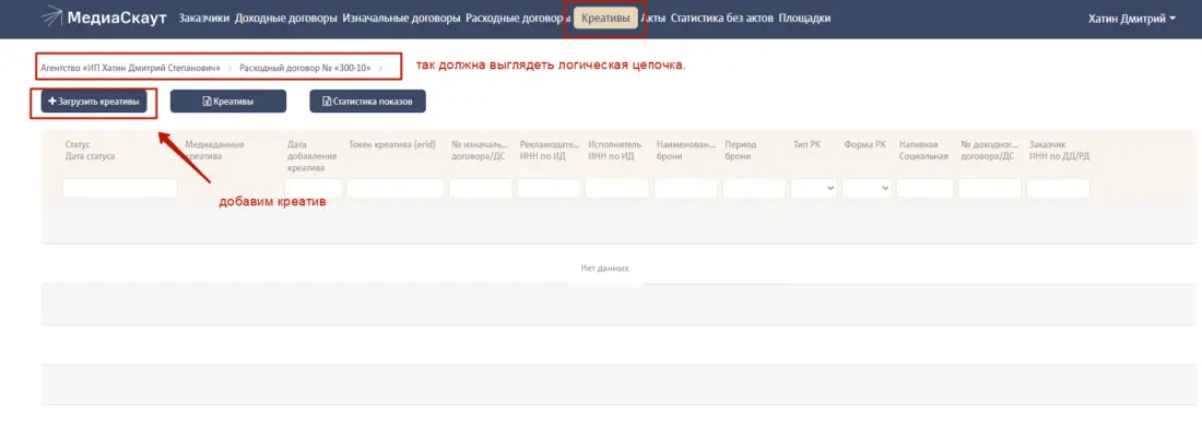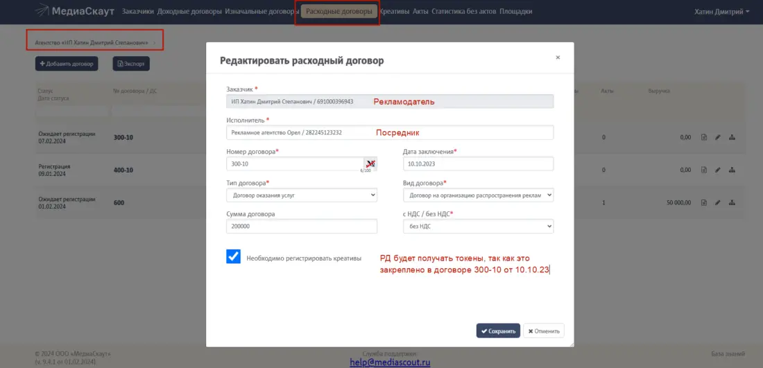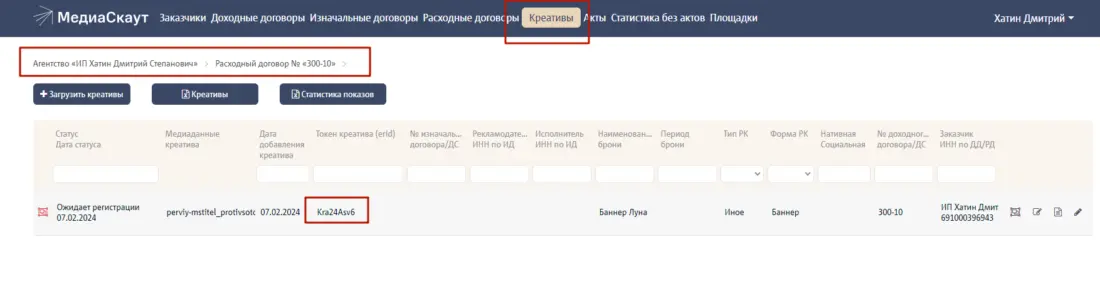Изначально предположим, что между Рекламодатель и Посредник есть договор 300-10 от 10 октября на размещение рекламных материалов в ноябре 2023 года на сумму 150 000 рублей и дополнительным работам по договору (креатив и SEO) в размере 50 000 рублей. Рекламодатель оплатит услуги Посреднику 10 декабря. Посредник выставит для Рекламодателя бухгалтерский (бумажный акт) 300-10-Акт-1 от 15 декабря 2023 года на общую сумму работ по договору в размере 200 000 рублей. Далее пошаговые инструкции, что должен сделать РД (рекламодатель) в своем ОРД для отчетности по Первому сценарию за связку РД — Посредник 1. Профиль Рекламодателя (Профиль агентства ИП Хатин Дмитрий Степанович) имеет следующий вид, как на скане ниже. Специфика ОРД Медиаскаут, что в названии упоминается про агентство. Не обращайте внимание — так на платформе принято, но новичков может ввести в заблуждение. Логично было упоминать слово «контрагент», но это Медиаскаут, поэтому принимаем так как есть) 2. Для того, чтобы успешно оформить отчетность в ОРД Медиаскаут Рекламодателю требуется идти пошагово по строгой логической цепочке. Если бы владельцем аккаунта был Рекламораспространитель (Пометка «Да» в профиле), то логическая цепочка оформления отчетности всегда бы начиналась с блока Заказчики, чтобы занести контрагентов, которые являлись бы заказчиками для владельца аккаунта Однако в нашем случае Рекламодатель сам по статусу всегда заказчик со статусом расходного договора (он платит деньги подрядчику), поэтому, чтобы оформить в своем ОРД отчетность за связку (договор) Рекламодатель-Посредник, загрузить креативы и получить токены (erid), ему требуется начать логическую цепочку с блока Расходный договор в интерфейсе ОРД Медиаскаут Нажмем Добавить договор. Кликнем на поле Исполнитель и занесем Посредника (подрядчика) в качестве Контрагента текущего договора. Отправим данные по Контрагенту в ЕРИД, нажав на Отправить в Erid Затем далее Рекламодатель заполнит карточку расходного договора Рекламодатель-Посредник Карточка договора будет выглядеть так 3. Следующий шаг это загрузка креативов и получение токенов Чтобы перейти в блок Креативы требуется кликнуть на номер договора (300-10) в блоке Расходные договоры, в результате чего система вас автоматически перебросит в блок Креативы с активированной кнопкой Загрузить креативы. Если вы, находясь в блоке Расходные договоры просто кликнете на блок Креативы, то кнопка Загрузить креативы не будет активной (Медиаскаут тем самым указывает, что вы нарушили логическую цепочку) Итак, мы все сделали правильно и оказались в блоке Креативы Заполним Бронь (верхний раздел) Теперь загрузим сам креатив (нижний раздел) В итоге так будет выглядеть строчка креатива с полученным токеном Важно понимать, что в Первом сценарии договор 300-10 и понятие изначальный договор это одна и та же сущность, а токены всегда прикрепляются к изначальному договору. В нашем случае токен прикреплен к договору 300-10, что является по сути прикреплением к изначальному договору в рекламной цепочке Напомним, что изначальный договор для каждой рекламной цепочки — это договор между исходным рекламодателем (ИП Хатин Дмитрий Степанович) и его первым контрагентом (Рекламное агентство Орел). В итоге все необходимое для начала размещения РИМ (рекламно-информационные материалы) в интернете сделано. Остал