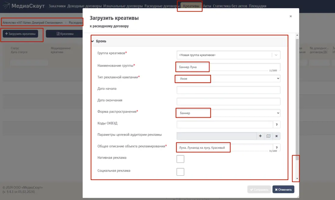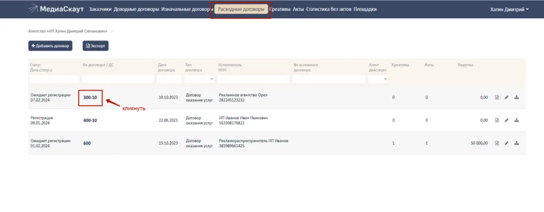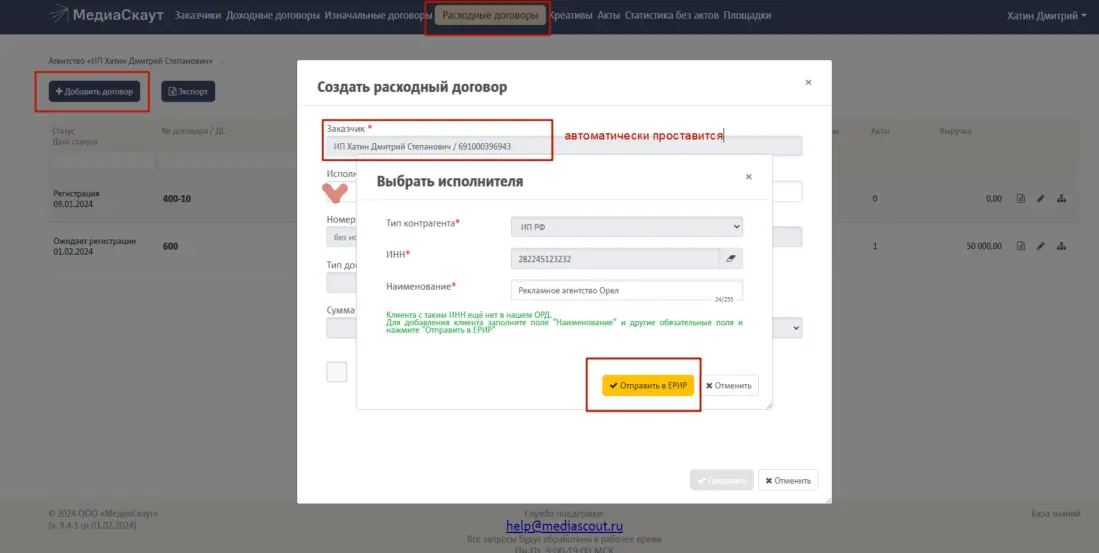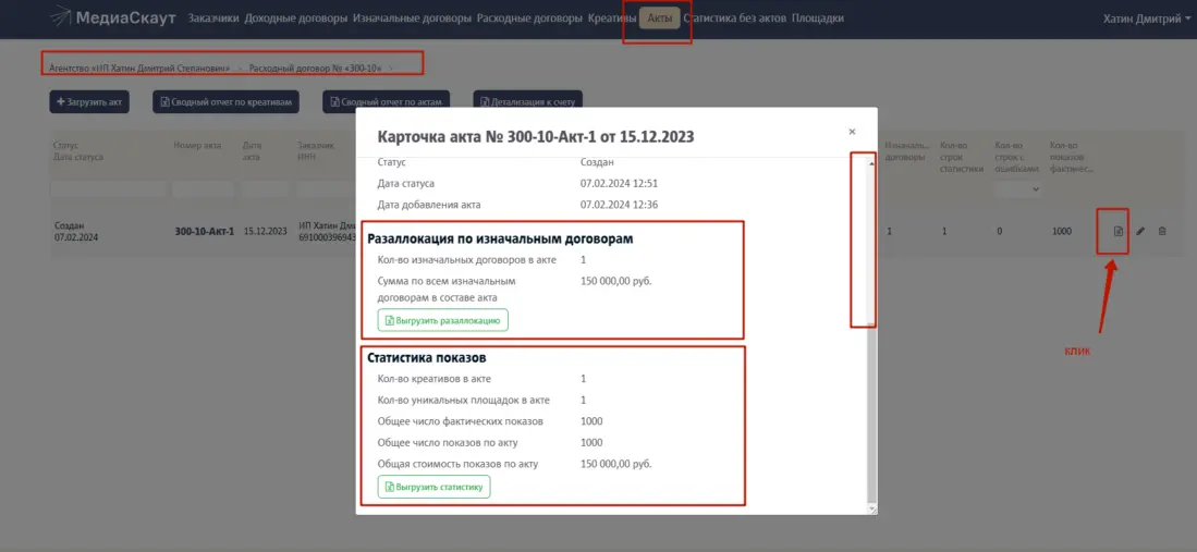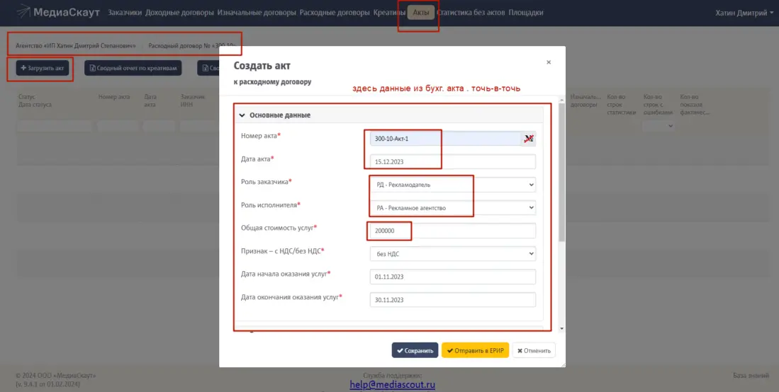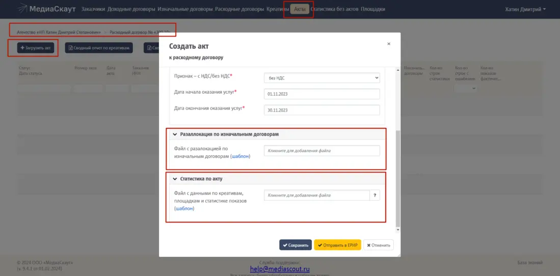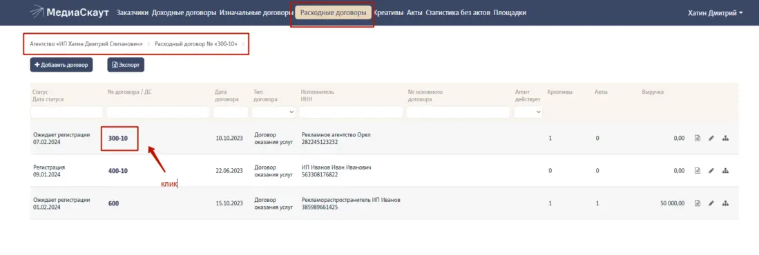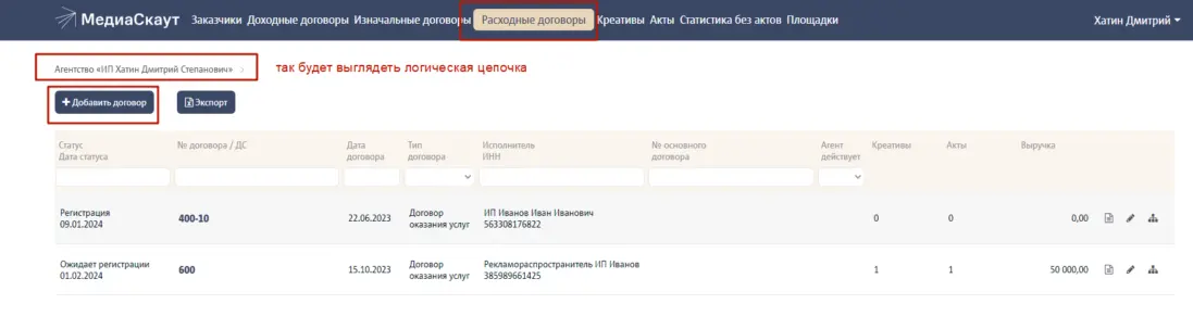 Изначально предположим, что между Рекламодатель и Посредник есть договор 300-10 от 10 октября на размещение рекламных материалов в ноябре 2023 года на сумму 150 000 рублей и дополнительным работам по договору (креатив и SEO) в размере 50 000 рублей. Рекламодатель оплатит услуги Посреднику 10 декабря. Посредник выставит для Рекламодателя бухгалтерский (бумажный акт) 300-10-Акт-1 от 15 декабря 2023 года на общую сумму работ по договору в размере 200 000 рублей. Далее пошаговые инструкции, что должен сделать РД (рекламодатель) в своем ОРД для отчетности по Первому сценарию за связку РД — Посредник 1. Профиль Рекламодателя (Профиль агентства ИП Хатин Дмитрий Степанович) имеет следующий вид, как на скане ниже. Специфика ОРД Медиаскаут, что в названии упоминается про агентство. Не обращайте внимание — так на платформе принято, но новичков может ввести в заблуждение. Логично было упоминать слово «контрагент», но это Медиаскаут, поэтому принимаем так как есть) 2. Для того, чтобы успешно оформить отчетность в ОРД Медиаскаут Рекламодателю требуется идти пошагово по строгой логической цепочке. Если бы владельцем аккаунта был Рекламораспространитель (Пометка «Да» в профиле), то логическая цепочка оформления отчетности всегда бы начиналась с блока Заказчики, чтобы занести контрагентов, которые являлись бы заказчиками для владельца аккаунта Однако в нашем случае Рекламодатель сам по статусу всегда заказчик со статусом расходного договора (он платит деньги подрядчику), поэтому, чтобы оформить в своем ОРД отчетность за связку (договор) Рекламодатель-Посредник, загрузить креативы и получить токены (erid), ему требуется начать логическую цепочку с блока Расходный договор в интерфейсе ОРД Медиаскаут Нажмем Добавить договор. Кликнем на поле Исполнитель и занесем Посредника (подрядчика) в качестве Контрагента текущего договора. Отправим данные по Контрагенту в ЕРИД, нажав на Отправить в Erid Затем далее Рекламодатель заполнит карточку расходного договора Рекламодатель-Посредник Карточка договора будет выглядеть так 3. Следующий шаг это загрузка креативов и получение токенов Чтобы перейти в блок Креативы требуется кликнуть на номер договора (300-10) в блоке Расходные договоры, в результате чего система вас автоматически перебросит в блок Креативы с активированной кнопкой Загрузить креативы. Если вы, находясь в блоке Расходные договоры просто кликнете на блок Креативы, то кнопка Загрузить креативы не будет активной (Медиаскаут тем самым указывает, что вы нарушили логическую цепочку) Итак, мы все сделали правильно и оказались в блоке Креативы Заполним Бронь (верхний раздел) Теперь загрузим сам креатив (нижний раздел) В итоге так будет выглядеть строчка креатива с полученным токеном Важно понимать, что в Первом сценарии договор 300-10 и понятие изначальный договор это одна и та же сущность, а токены всегда прикрепляются к изначальному договору. В нашем случае токен прикреплен к договору 300-10, что является по сути прикреплением к изначальному договору в рекламной цепочке Напомним, что изначальный договор для каждой рекламной цепочки — это договор между исходным рекламодателем (ИП Хатин Дмитрий Степанович) и его первым контрагентом (Рекламное агентство Орел). В итоге все необходимое для начала размещения РИМ (рекламно-информационные материалы) в интернете сделано. Остал