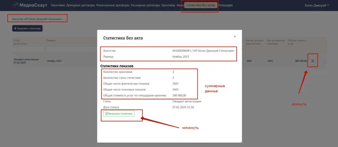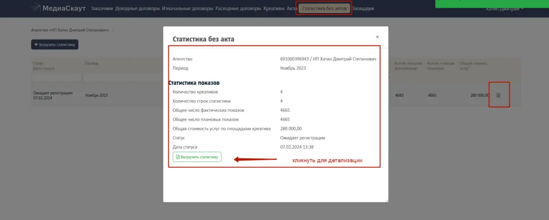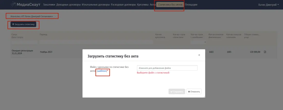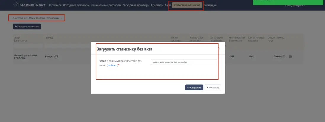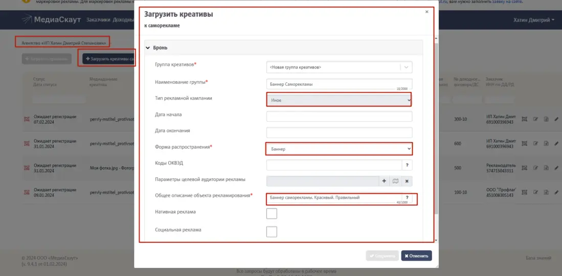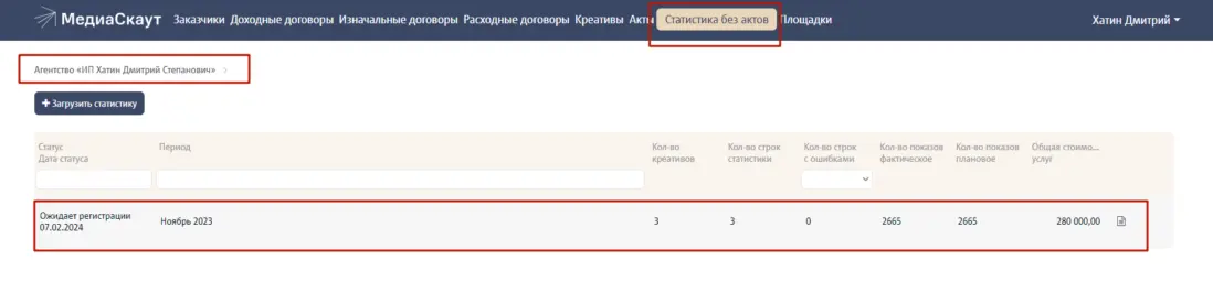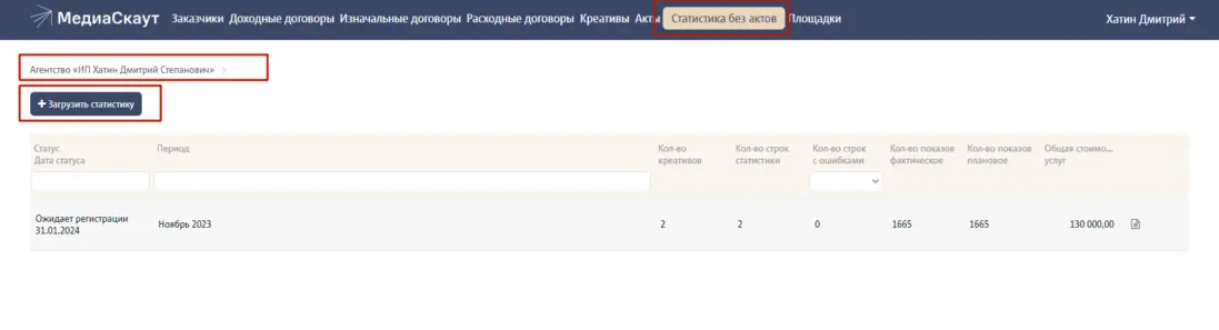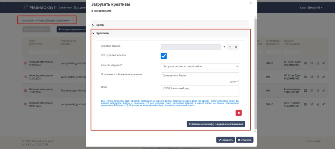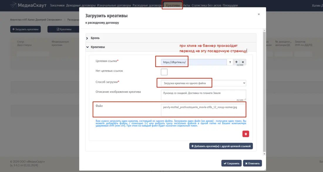 Изначально предположим, что между Рекламодатель и Посредник есть договор 300-10 от 10 октября на размещение рекламных материалов в ноябре 2023 года на сумму 150 000 рублей и дополнительным работам по договору (креатив и SEO) в размере 50 000 рублей. Рекламодатель оплатит услуги Посреднику 10 декабря. Посредник выставит для Рекламодателя бухгалтерский (бумажный акт) 300-10-Акт-1 от 15 декабря 2023 года на общую сумму работ по договору в размере 200 000 рублей. Далее пошаговые инструкции, что должен сделать РД (рекламодатель) в своем ОРД для отчетности по Первому сценарию за связку РД — Посредник 1. Профиль Рекламодателя (Профиль агентства ИП Хатин Дмитрий Степанович) имеет следующий вид, как на скане ниже. Специфика ОРД Медиаскаут, что в названии упоминается про агентство. Не обращайте внимание — так на платформе принято, но новичков может ввести в заблуждение. Логично было упоминать слово «контрагент», но это Медиаскаут, поэтому принимаем так как есть) 2. Для того, чтобы успешно оформить отчетность в ОРД Медиаскаут Рекламодателю требуется идти пошагово по строгой логической цепочке. Если бы владельцем аккаунта был Рекламораспространитель (Пометка «Да» в профиле), то логическая цепочка оформления отчетности всегда бы начиналась с блока Заказчики, чтобы занести контрагентов, которые являлись бы заказчиками для владельца аккаунта Однако в нашем случае Рекламодатель сам по статусу всегда заказчик со статусом расходного договора (он платит деньги подрядчику), поэтому, чтобы оформить в своем ОРД отчетность за связку (договор) Рекламодатель-Посредник, загрузить креативы и получить токены (erid), ему требуется начать логическую цепочку с блока Расходный договор в интерфейсе ОРД Медиаскаут Нажмем Добавить договор. Кликнем на поле Исполнитель и занесем Посредника (подрядчика) в качестве Контрагента текущего договора. Отправим данные по Контрагенту в ЕРИД, нажав на Отправить в Erid Затем далее Рекламодатель заполнит карточку расходного договора Рекламодатель-Посредник Карточка договора будет выглядеть так 3. Следующий шаг это загрузка креативов и получение токенов Чтобы перейти в блок Креативы требуется кликнуть на номер договора (300-10) в блоке Расходные договоры, в результате чего система вас автоматически перебросит в блок Креативы с активированной кнопкой Загрузить креативы. Если вы, находясь в блоке Расходные договоры просто кликнете на блок Креативы, то кнопка Загрузить креативы не будет активной (Медиаскаут тем самым указывает, что вы нарушили логическую цепочку) Итак, мы все сделали правильно и оказались в блоке Креативы Заполним Бронь (верхний раздел) Теперь загрузим сам креатив (нижний раздел) В итоге так будет выглядеть строчка креатива с полученным токеном Важно понимать, что в Первом сценарии договор 300-10 и понятие изначальный договор это одна и та же сущность, а токены всегда прикрепляются к изначальному договору. В нашем случае токен прикреплен к договору 300-10, что является по сути прикреплением к изначальному договору в рекламной цепочке Напомним, что изначальный договор для каждой рекламной цепочки — это договор между исходным рекламодателем (ИП Хатин Дмитрий Степанович) и его первым контрагентом (Рекламное агентство Орел). В итоге все необходимое для начала размещения РИМ (рекламно-информационные материалы) в интернете сделано. Остал