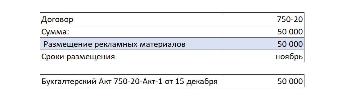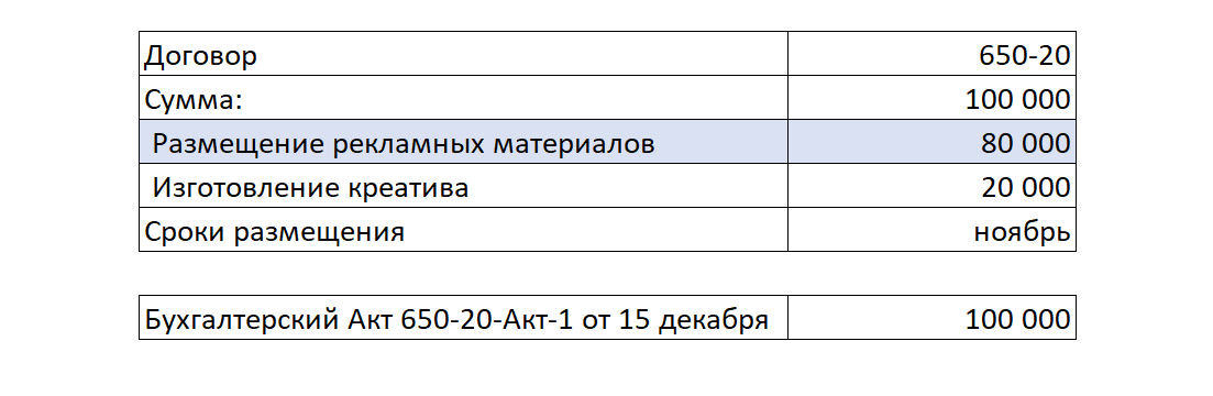Предположим, что между РД и РА есть договор 650-20 от 10 октября на размещение рекламных материалов в ноябре 2023 года на сумму 80 000 рублей и дополнительным работам по договору (изготовление креатива) на 20 000 рублей.
