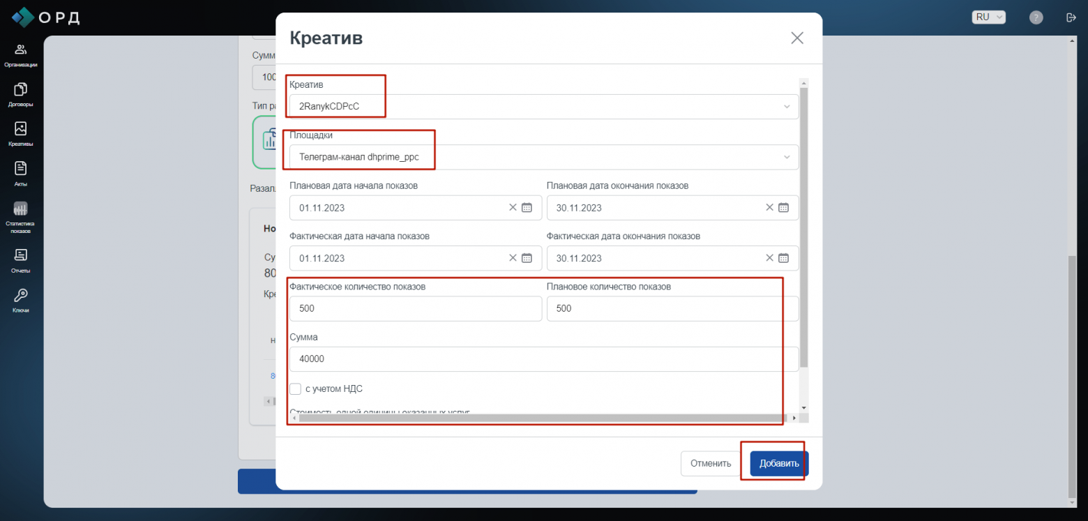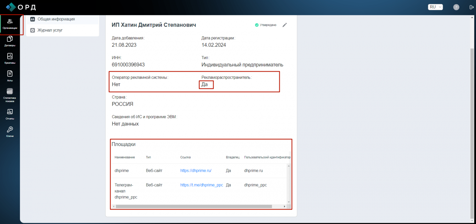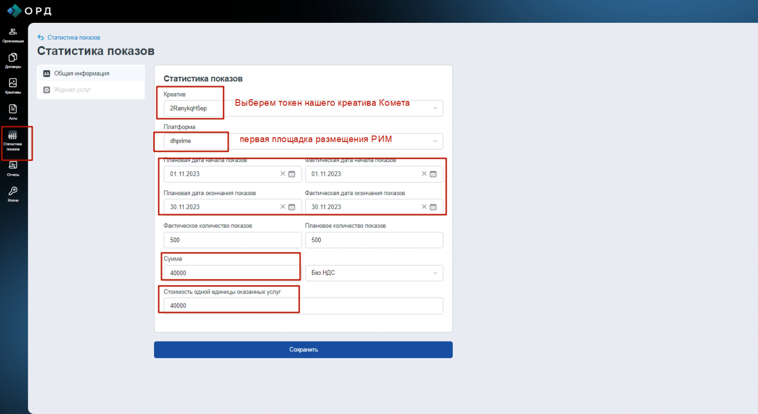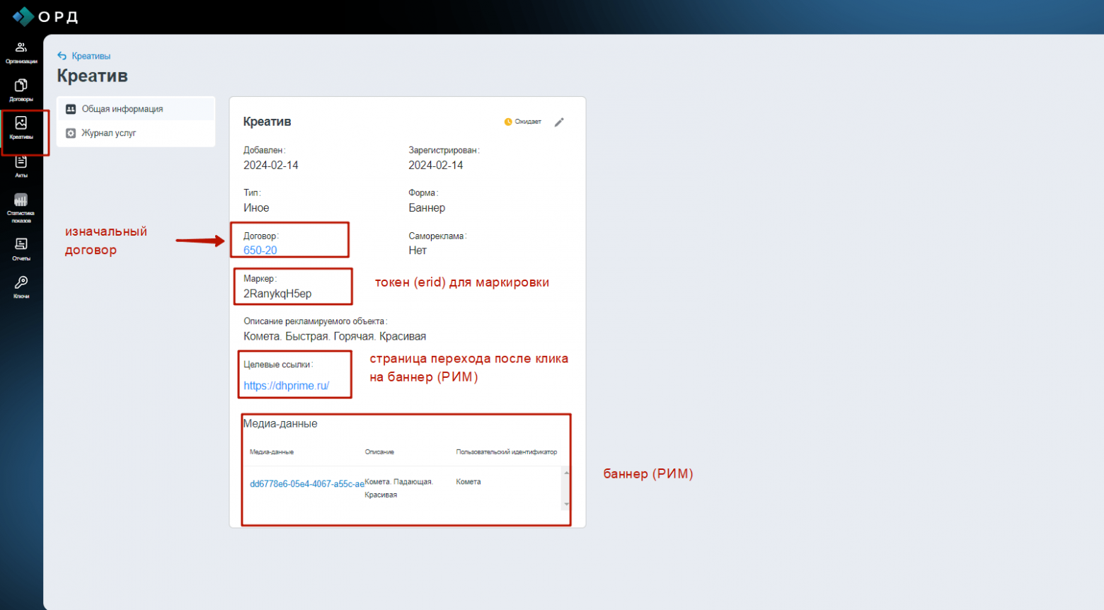 Рекламодатель оплатит услуги по размещению РИМ 10 декабря. РА выставит для РД бухгалтерский акт 650-20-Акт-1 от 15 декабря 2023 года на общую сумму работ по договору в размере 100 000 рублей Далее пошаговые инструкции, что должно сделать РА в своем ОРД для отчетности по Первому сценарию за связку РД — РА Первый шаг: Агентство в своем ОРД, в котором оно предварительно зарегистрировалось и получило аккаунт будет присутствовать в системе со своей карточкой Так как Агентство по договору будет загружать креативы и получать токены (erid), то Агентству придется оформлять блок Статистика и производить разаллокацию по креативам и площадкам. Для этого требуется знать на каких площадках будут размещаться РИМ (рекламно-информационные материалы). Для этого требуется завести дополнительного Контрагента (Рекламораспространителя) к которому будут привязаны интернет-площадки, где будет происходить размещение РИМ. Отдельно завести площадки в ОРД Сбер (ОРД Лаборатория разработки) не получится, что неудобно. В интерфейсе отдельного блока Площадки просто нет, в отличие от некоторых других ОРД (например Озон ОРД). Агентству для отчетности в ОРД придется знать реквизиты Рекламораспространителя (РР), чтобы завести для него отдельную карточку организации и к ней прикрепить площадки. Если Агентство самостоятельно занимается вопросами поиска подрядчиков (РР), то здесь никаких проблем, а если наше Агентство сотрудничает и переводит деньги другому агентству, которое будет контактировать с РР, то данная схема организованная в ОРД Сбер не совсем удобна. Итак, заведем карточку Рекламораспространителя и прикрепим к нему две площадки для размещения РИМ — dhprime и dhprime_ppc Второй шаг: Агентство в блоке Организации укажет данные Рекламодателя (заказчика) по вышеуказанному договору № 650-20 от 20 октября 2023 года. Пусть это будет Рекламодатель Питон В итоге будет иметь место рекламная связка: Рекламодатель Питон — Агентство Слон (мы). Третий шаг: Агентство укажет договор с атрибутами (номер, дата, сумма договора необязательна) точь-в-точь из бухгалтерского (бумажного) договора № 650-20 от 20 октября 2023 года в блоке Договоры Четвертый шаг: Далее Агентство загрузит креативы и получит токен в блоке Креативы. Например, креативом будет баннер Комета в качества РИМ (рекламно-информационный материал) ОКВЭД объекта рекламирования Далее спускаемся ниже В Целевой ссылке указана посадочная страница после клика на баннер В итоге так будет выглядеть карточка креатива (РИМ) Важно: прикрепление креативов в блоке Креативы всегда производится к Изначальному договору (договор между Рекламодателем и его первым контрагентом). Первый Контрагент у Рекламодателя Питон это и есть в данном случае Агентство Слон. Т.е. в нашем случае, изначальный договор и договор между Рекламодателем и Агентством это одно и то же, поэтому в блоке Креативы указан наш договор № 650-20 от 20 октября 2023 года. В поле Тип при размещении РИМ у блогеров в пабликах либо у владельцев интернет-площадок, как правило, указывается именно Иное, как универсального варианта. Агентство направит токен своему Подрядчику направо по цепочке для обеспечения нанесения атрибутов маркировки на рекламно-информационные материалы. Затем произойдет размещение РИМ в ноябре 2023 года, согласно договору на утвержденных интернет-площадках (в нашем случ