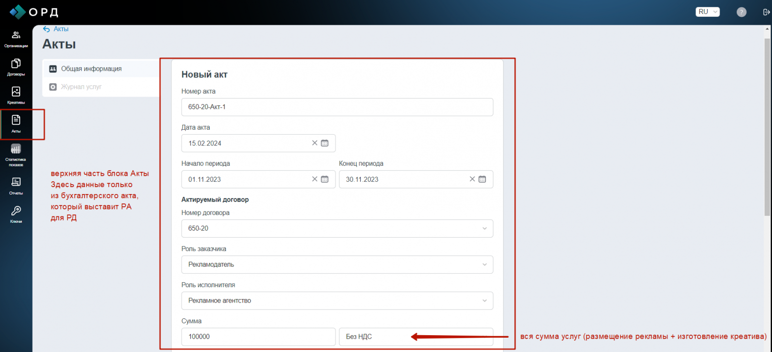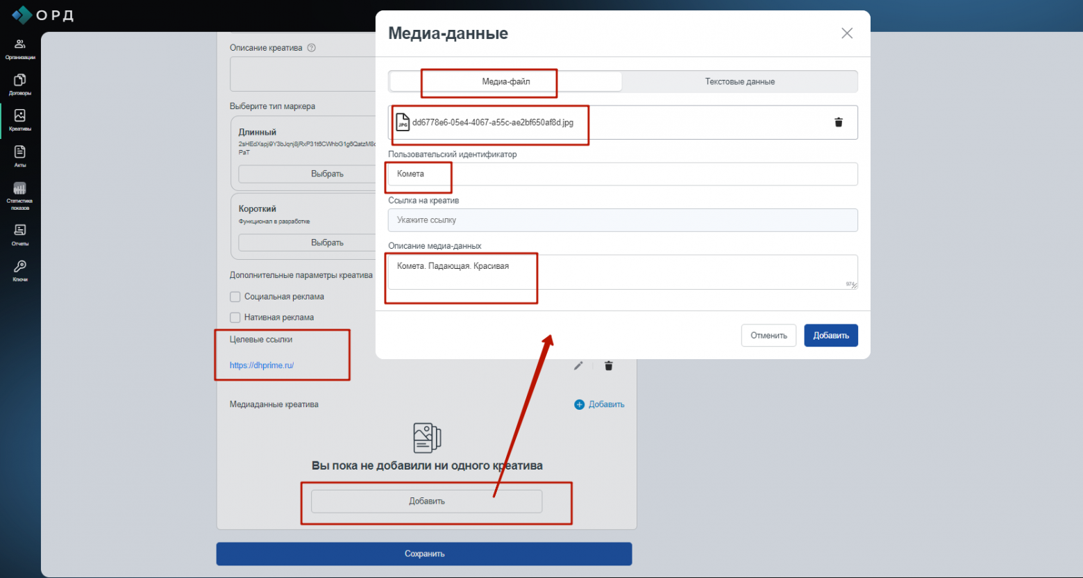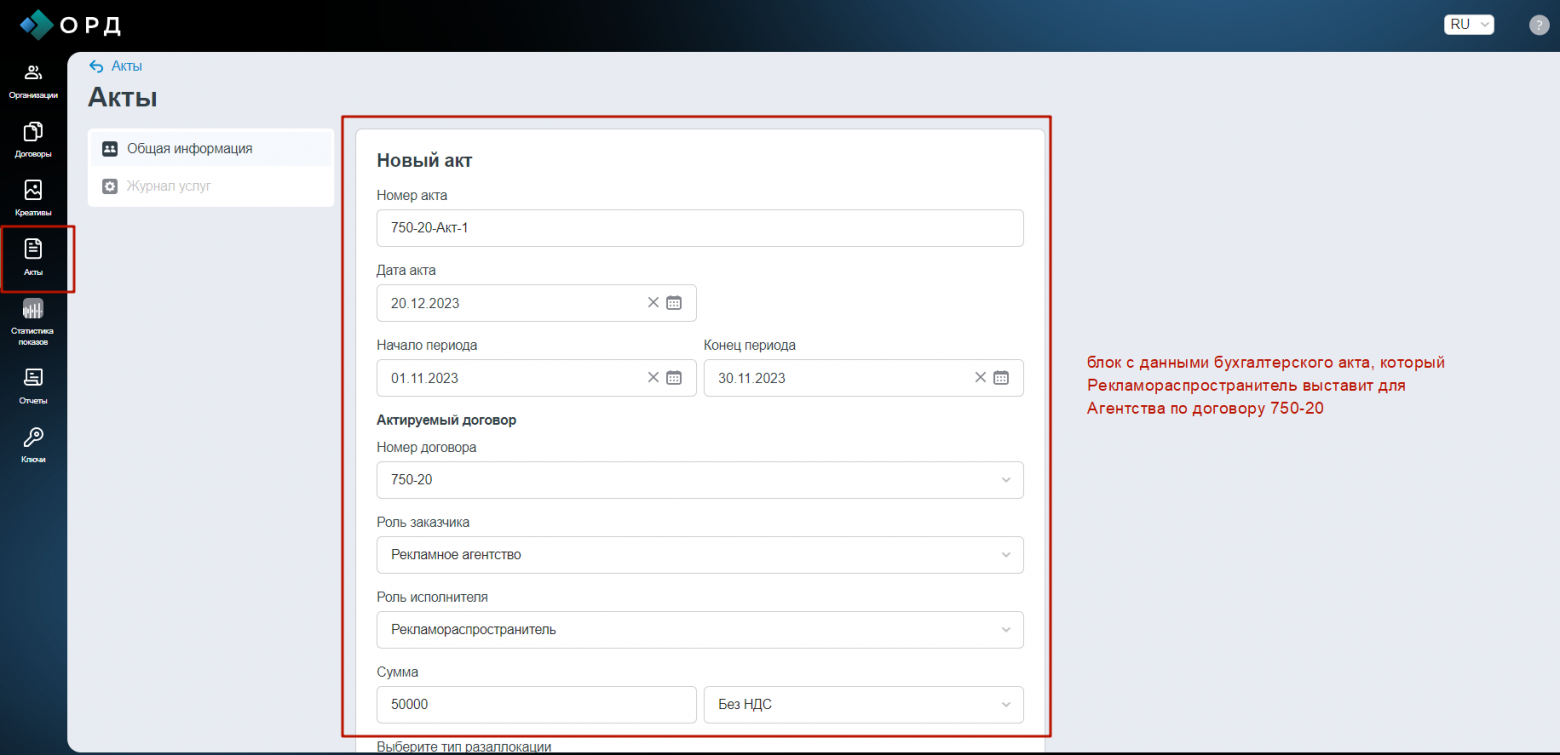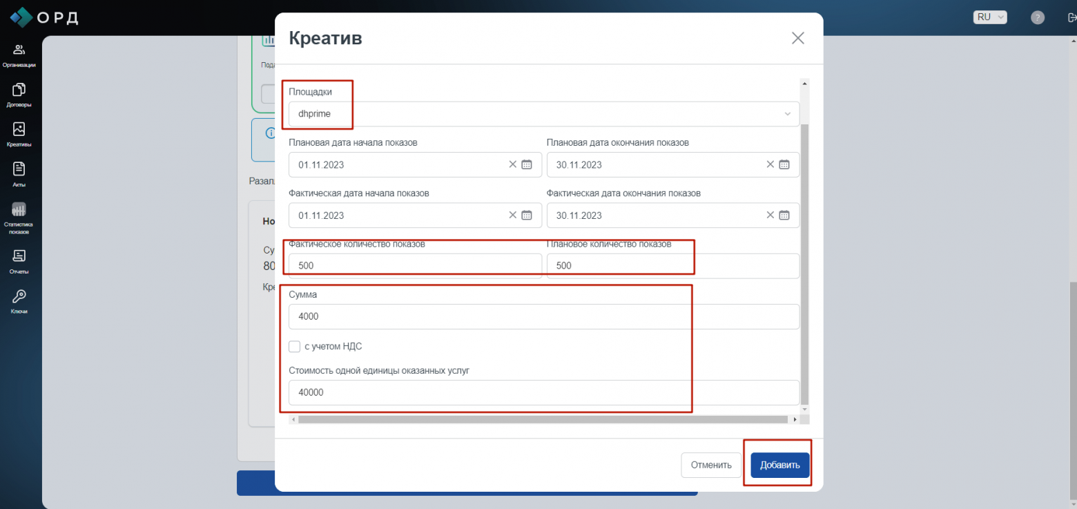 Рекламодатель оплатит услуги по размещению РИМ 10 декабря. РА выставит для РД бухгалтерский акт 650-20-Акт-1 от 15 декабря 2023 года на общую сумму работ по договору в размере 100 000 рублей Далее пошаговые инструкции, что должно сделать РА в своем ОРД для отчетности по Первому сценарию за связку РД — РА Первый шаг: Агентство в своем ОРД, в котором оно предварительно зарегистрировалось и получило аккаунт будет присутствовать в системе со своей карточкой Так как Агентство по договору будет загружать креативы и получать токены (erid), то Агентству придется оформлять блок Статистика и производить разаллокацию по креативам и площадкам. Для этого требуется знать на каких площадках будут размещаться РИМ (рекламно-информационные материалы). Для этого требуется завести дополнительного Контрагента (Рекламораспространителя) к которому будут привязаны интернет-площадки, где будет происходить размещение РИМ. Отдельно завести площадки в ОРД Сбер (ОРД Лаборатория разработки) не получится, что неудобно. В интерфейсе отдельного блока Площадки просто нет, в отличие от некоторых других ОРД (например Озон ОРД). Агентству для отчетности в ОРД придется знать реквизиты Рекламораспространителя (РР), чтобы завести для него отдельную карточку организации и к ней прикрепить площадки. Если Агентство самостоятельно занимается вопросами поиска подрядчиков (РР), то здесь никаких проблем, а если наше Агентство сотрудничает и переводит деньги другому агентству, которое будет контактировать с РР, то данная схема организованная в ОРД Сбер не совсем удобна. Итак, заведем карточку Рекламораспространителя и прикрепим к нему две площадки для размещения РИМ — dhprime и dhprime_ppc Второй шаг: Агентство в блоке Организации укажет данные Рекламодателя (заказчика) по вышеуказанному договору № 650-20 от 20 октября 2023 года. Пусть это будет Рекламодатель Питон В итоге будет иметь место рекламная связка: Рекламодатель Питон — Агентство Слон (мы). Третий шаг: Агентство укажет договор с атрибутами (номер, дата, сумма договора необязательна) точь-в-точь из бухгалтерского (бумажного) договора № 650-20 от 20 октября 2023 года в блоке Договоры Четвертый шаг: Далее Агентство загрузит креативы и получит токен в блоке Креативы. Например, креативом будет баннер Комета в качества РИМ (рекламно-информационный материал) ОКВЭД объекта рекламирования Далее спускаемся ниже В Целевой ссылке указана посадочная страница после клика на баннер В итоге так будет выглядеть карточка креатива (РИМ) Важно: прикрепление креативов в блоке Креативы всегда производится к Изначальному договору (договор между Рекламодателем и его первым контрагентом). Первый Контрагент у Рекламодателя Питон это и есть в данном случае Агентство Слон. Т.е. в нашем случае, изначальный договор и договор между Рекламодателем и Агентством это одно и то же, поэтому в блоке Креативы указан наш договор № 650-20 от 20 октября 2023 года. В поле Тип при размещении РИМ у блогеров в пабликах либо у владельцев интернет-площадок, как правило, указывается именно Иное, как универсального варианта. Агентство направит токен своему Подрядчику направо по цепочке для обеспечения нанесения атрибутов маркировки на рекламно-информационные материалы. Затем произойдет размещение РИМ в ноябре 2023 года, согласно договору на утвержденных интернет-площадках (в нашем случ