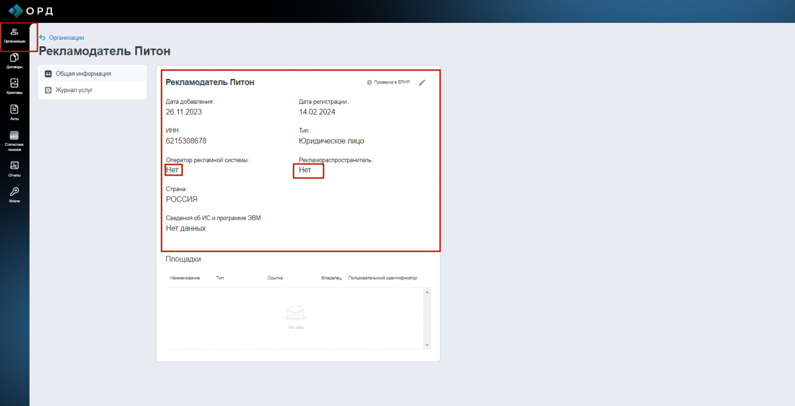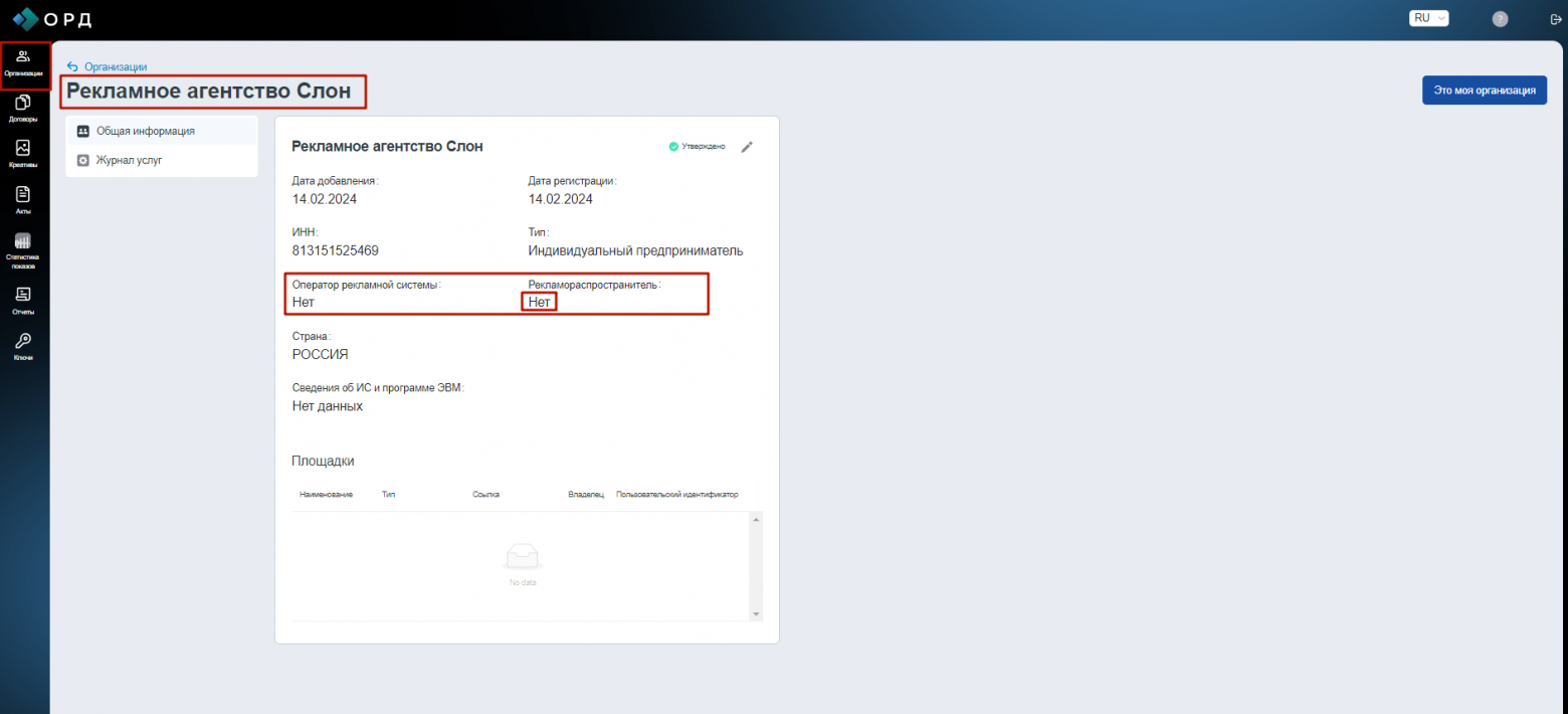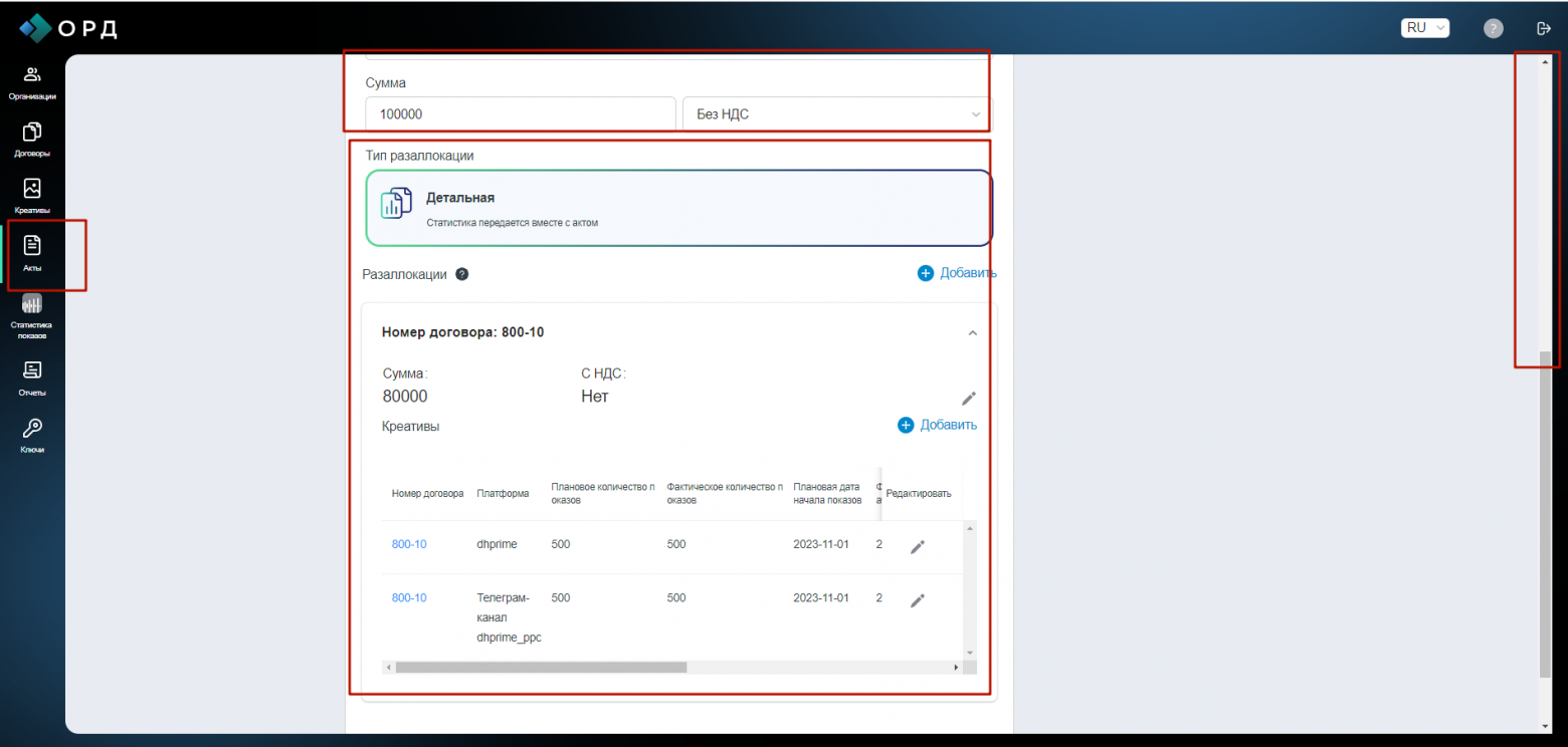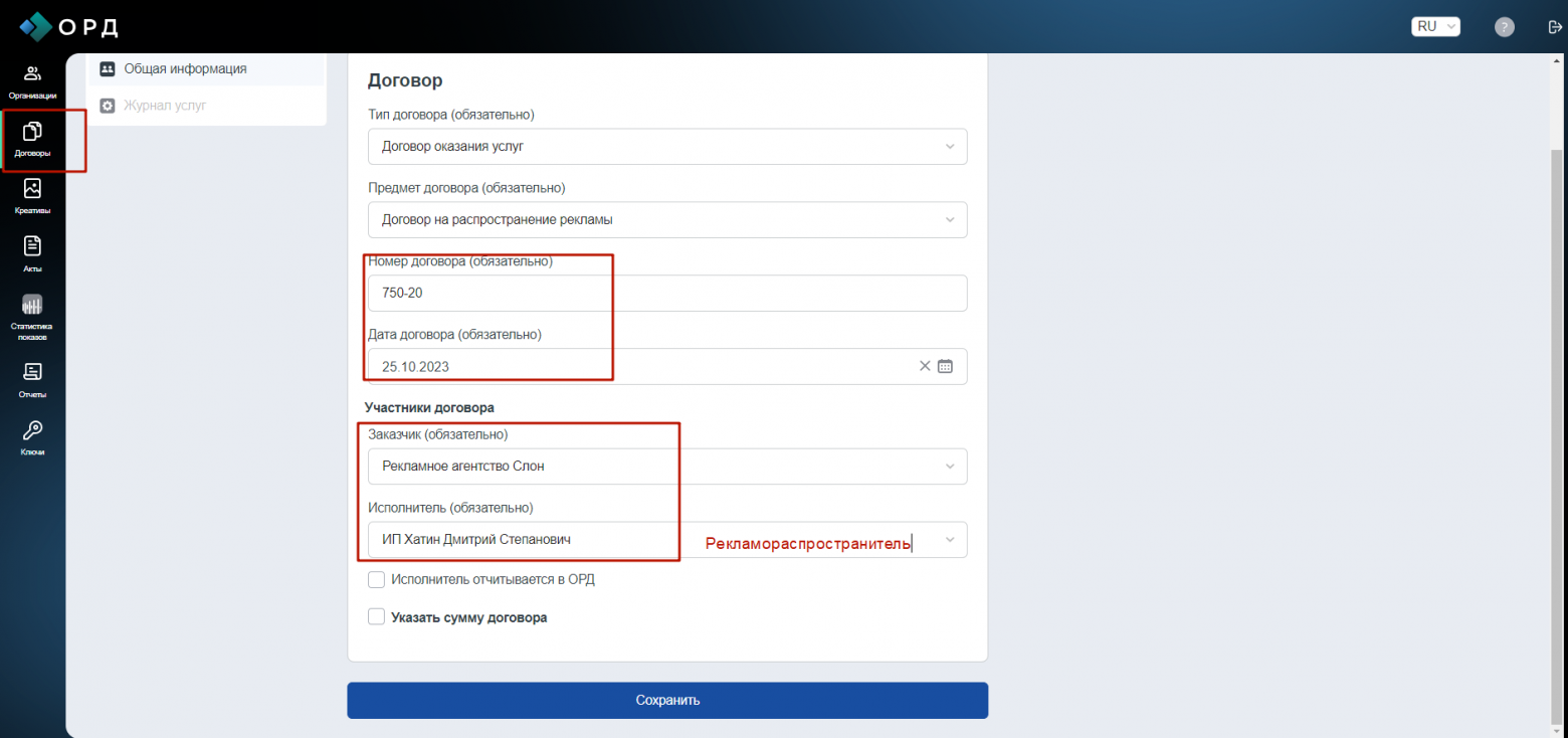 Рекламодатель оплатит услуги по размещению РИМ 10 декабря. РА выставит для РД бухгалтерский акт 650-20-Акт-1 от 15 декабря 2023 года на общую сумму работ по договору в размере 100 000 рублей Далее пошаговые инструкции, что должно сделать РА в своем ОРД для отчетности по Первому сценарию за связку РД — РА Первый шаг: Агентство в своем ОРД, в котором оно предварительно зарегистрировалось и получило аккаунт будет присутствовать в системе со своей карточкой Так как Агентство по договору будет загружать креативы и получать токены (erid), то Агентству придется оформлять блок Статистика и производить разаллокацию по креативам и площадкам. Для этого требуется знать на каких площадках будут размещаться РИМ (рекламно-информационные материалы). Для этого требуется завести дополнительного Контрагента (Рекламораспространителя) к которому будут привязаны интернет-площадки, где будет происходить размещение РИМ. Отдельно завести площадки в ОРД Сбер (ОРД Лаборатория разработки) не получится, что неудобно. В интерфейсе отдельного блока Площадки просто нет, в отличие от некоторых других ОРД (например Озон ОРД). Агентству для отчетности в ОРД придется знать реквизиты Рекламораспространителя (РР), чтобы завести для него отдельную карточку организации и к ней прикрепить площадки. Если Агентство самостоятельно занимается вопросами поиска подрядчиков (РР), то здесь никаких проблем, а если наше Агентство сотрудничает и переводит деньги другому агентству, которое будет контактировать с РР, то данная схема организованная в ОРД Сбер не совсем удобна. Итак, заведем карточку Рекламораспространителя и прикрепим к нему две площадки для размещения РИМ — dhprime и dhprime_ppc Второй шаг: Агентство в блоке Организации укажет данные Рекламодателя (заказчика) по вышеуказанному договору № 650-20 от 20 октября 2023 года. Пусть это будет Рекламодатель Питон В итоге будет иметь место рекламная связка: Рекламодатель Питон — Агентство Слон (мы). Третий шаг: Агентство укажет договор с атрибутами (номер, дата, сумма договора необязательна) точь-в-точь из бухгалтерского (бумажного) договора № 650-20 от 20 октября 2023 года в блоке Договоры Четвертый шаг: Далее Агентство загрузит креативы и получит токен в блоке Креативы. Например, креативом будет баннер Комета в качества РИМ (рекламно-информационный материал) ОКВЭД объекта рекламирования Далее спускаемся ниже В Целевой ссылке указана посадочная страница после клика на баннер В итоге так будет выглядеть карточка креатива (РИМ) Важно: прикрепление креативов в блоке Креативы всегда производится к Изначальному договору (договор между Рекламодателем и его первым контрагентом). Первый Контрагент у Рекламодателя Питон это и есть в данном случае Агентство Слон. Т.е. в нашем случае, изначальный договор и договор между Рекламодателем и Агентством это одно и то же, поэтому в блоке Креативы указан наш договор № 650-20 от 20 октября 2023 года. В поле Тип при размещении РИМ у блогеров в пабликах либо у владельцев интернет-площадок, как правило, указывается именно Иное, как универсального варианта. Агентство направит токен своему Подрядчику направо по цепочке для обеспечения нанесения атрибутов маркировки на рекламно-информационные материалы. Затем произойдет размещение РИМ в ноябре 2023 года, согласно договору на утвержденных интернет-площадках (в нашем случ