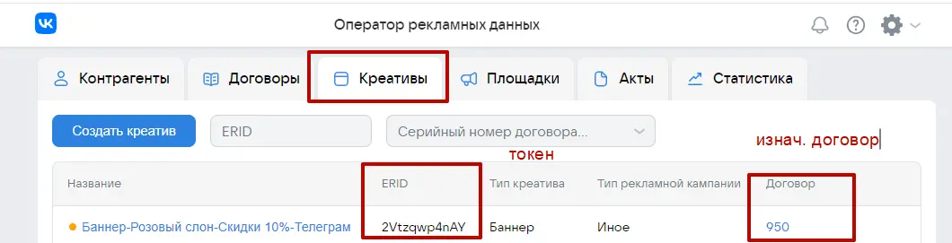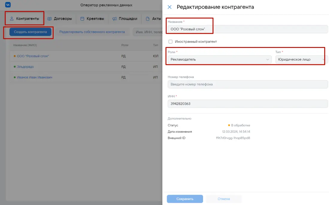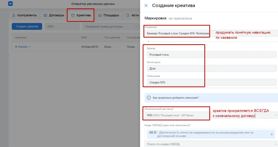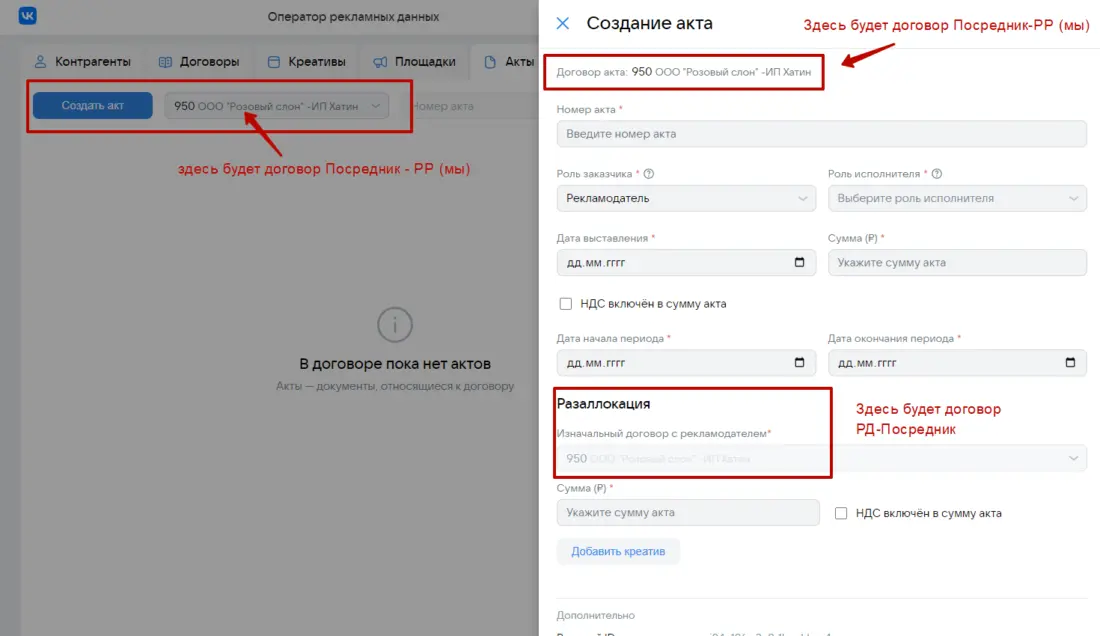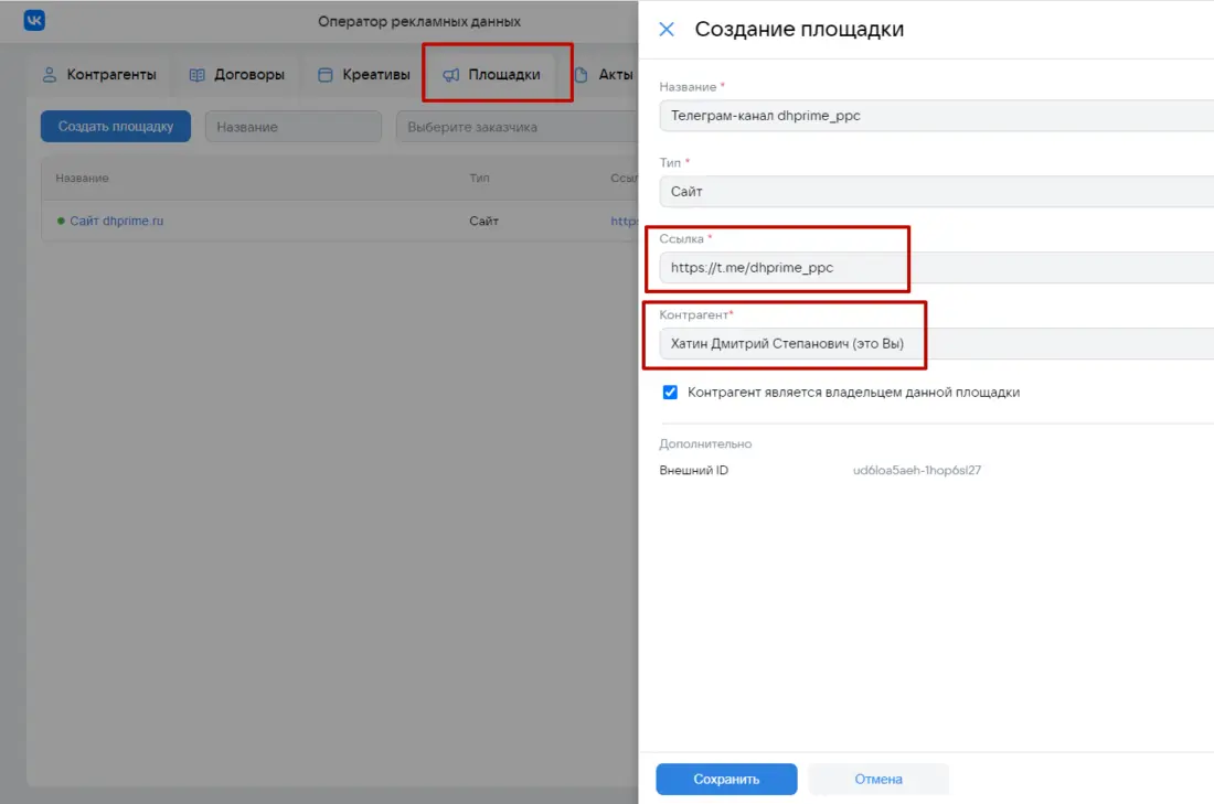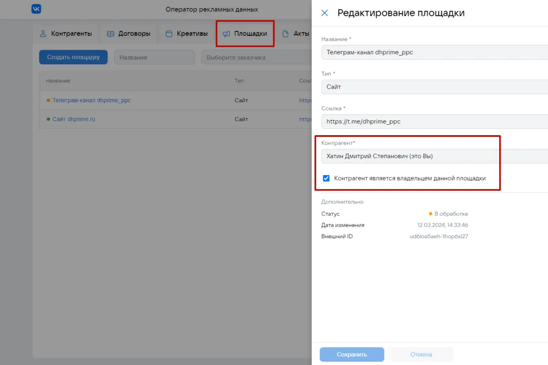 Предположим, что между Рекламодатель и Рекламораспространитель есть договор 950 от 10 декабря 2023 года на размещение рекламных материалов в феврале 2024 года на сумму 40 000 рублей и дополнительным работам по договору (изготовление креатива) на 10 000 рублей. Рекламодатель оплатит услуги по размещению и Рекламораспространитель (блогер) выставит для Рекламодателя бухгалтерский (бумажный акт) 950-Акт-1 в марте 2024 года на общую сумму работ по договору в размере 50 000 рублей Первый этап: Рекламораспространитель (мы) пройдет регистрацию на сайте ord.vk.com с помощью своего VK ID и получит доступ к платформе ОРД Кстати, аналогичную процедуру предлагает ОРД Яндекс через Яндекс ID со своим новым интерфейсным решением вместо старого Партнерского кабинета Другие операторы рекламных данных: ОРД Озон, ОРД Амбердата, ОРД Билайн, ОРД Медиаскаут, ОРД Сбер потребуют подписание полноценных договоров (в том числе возможно отдельное NDA) для предоставления доступов в личные кабинеты ОРД Второй этап: При получении доступа в аккаунт ОРД ВК в блоке Контрагенты пользователь (владелец аккаунта) уже будет фигурировать со своей информацией, которая подтянулась из VK ID Свою карточку (как впрочем карточку любого контрагента, которого вы заведете на платформе) можно будет потом редактировать, расширяя либо урезая роли, которые он может пользоваться в различных рекламных цепочках Например, роли указанные выше на скане позволяют использовать пользователя как Рекламодателя в какой либо рекламной цепочке либо как посредника (Агентство) в другой рекламной цепочке либо как Издателя (Рекламораспространителя) Многоролевой статус позволяет очень гибко использовать свой текущий аккаунт в ОРД и не требует заводить дополнительный аккаунт, если пользователь (ИНН) будет играть иную роль в какой-либо рекламной цепочке. Итак, наша карточка, как РР присутствует в договоре. Теперь Рекламораспространителю нам необходимо занести данные по своему заказчику (Рекламодателю) Пусть нашим РД будет ООО «Розовый слон» В итоге будет иметь место рекламная цепочка: ООО «Розовый слон» (РД) — ИП Хатин Дмитрий Степанович (РР) Третий этап: Если вы в карточке контрагента выберете в том числе роль Издателя, то система автоматически потребует ввести интернет-площадку, которая будет прикреплена к данному контрагенту ОРД автоматически перебросит пользователя в блок Площадки, где потребуется завести карточку интернет-площадки Далее занесем нашу вторую площадку размещения в блоке Площадки В итоге так Стоит обратить внимание на чек-бокс с галочкой Контрагент является владельцем данной площадки Это говорит о том, что площадка оформлена именно на указанного контрагента в карточке — в данном случае Хатин Дмитрий Степанович в статусе индивидуального предпринимателя. Что значит оформлена? Это значит в описании либо при регистрации данной площадки вы в свое время указывали свои контактные данные, в том числе упоминали себя в описании паблика либо сайта, как владельца данной интернет-площадки. Однако, если вы будете размещать РИМ и фигурировать в договоре как физлицо в статусе ИП, а площадка будет оформлена на вас как обычное физлицо, то в карточке площадки вы ее к себе прикрепите, но не будете указывать галочку в чек-боксе. Как правило, имеет место наличие галочки, т.е. владелец интернет-площадки и лицо, фиг