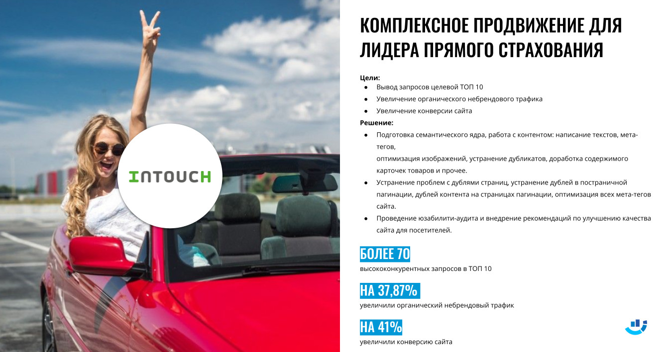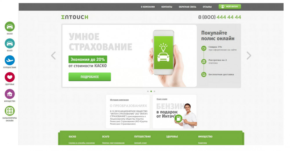 Особенно глубоко погрузиться в данную тему нам позволило сотрудничество с Intouch — лидером прямого страхования. В Intouch в режиме онлайн можно оформить КАСКО, ОСАГО, застраховать имущество, здоровье, купить полис для путешествий.