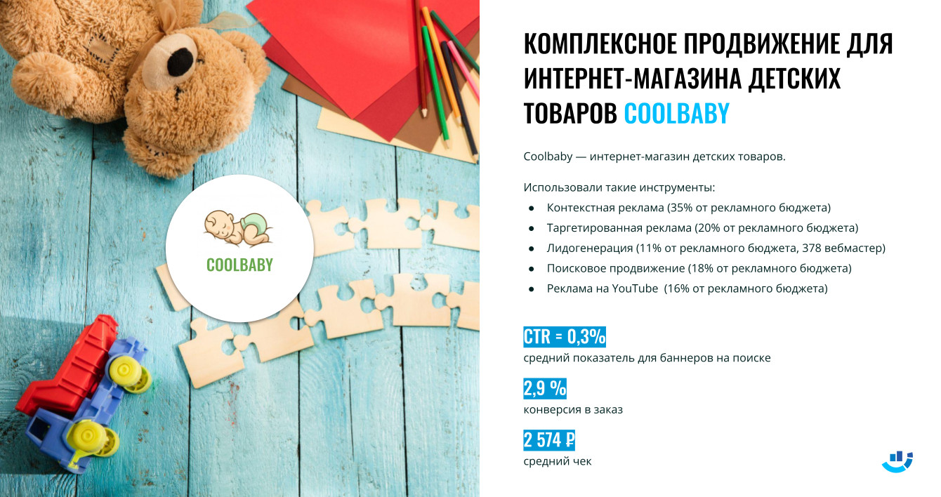 Это ещё раз подтверждает, что товары для детей — один из самых востребованных сегментов на коммерческом рынке. И поэтому, чтобы выбиться из множества детских магазинов, требуется сильное маркетинговое продвижение.