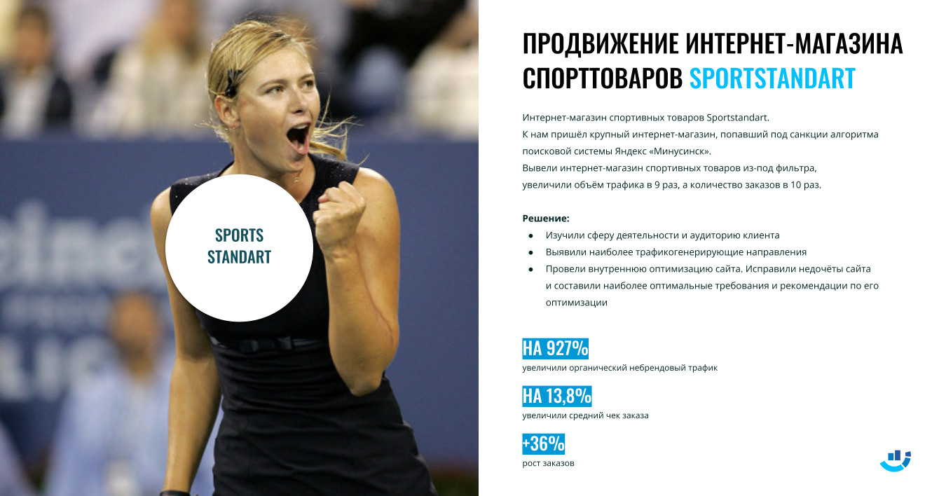 Нам удалось вывести интернет-магазин спортивных товаров из-под фильтра «Минусинск», увеличить объем трафика в 9 раз, а количество заказов в 10 раз.