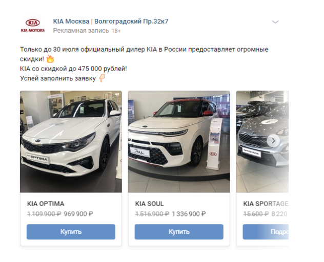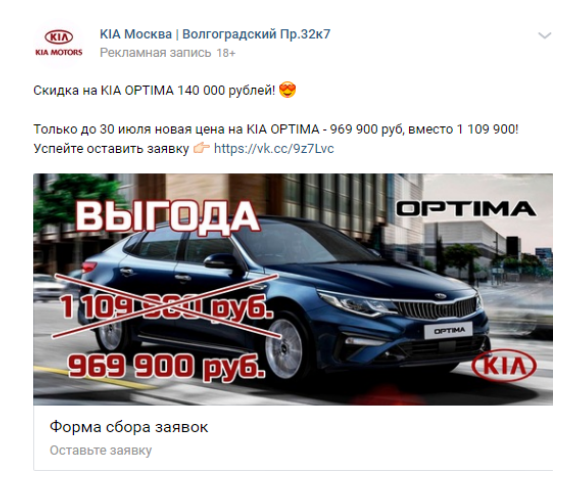 Мы создали две кампании: в одной таргетировались на холодных клиентов, в другой на тёплых и горячих. Формат публикаций был всех видов: универсальный баннер, с кнопкой, с лид-формой, тизер. Писали про скидки, программы по кредиту и специальные предложения автоцентра.