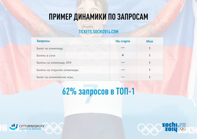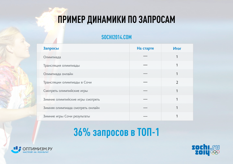 Мы стали собирать их в нон-стоп режиме и привлекать по ним новую аудиторию. Например, когда Россия получила золотые медали по фигурному катанию, мы моментально отреагировали и написали новостные SEO-статьи, чтобы собрать горячий и целевой трафик. Весь процесс осуществлялся в режиме реального времени. Вся SEO-команда Оптимизма следила за играми и результатами, выводила в топ актуальные запросы, а через день уже делала продвижение сайта через следующие ключи. Бессонные ночи и сотни литров крепкого кофе окупились сполна — мы получили более 40% бесплатного трафика из органической поисковой выдачи и вывели на 1 место «Яндекса» и Google 3 основных сайта: Наша отдача сконвертировалась в широкую осведомлённость и реакцию зрителей: Сегодня