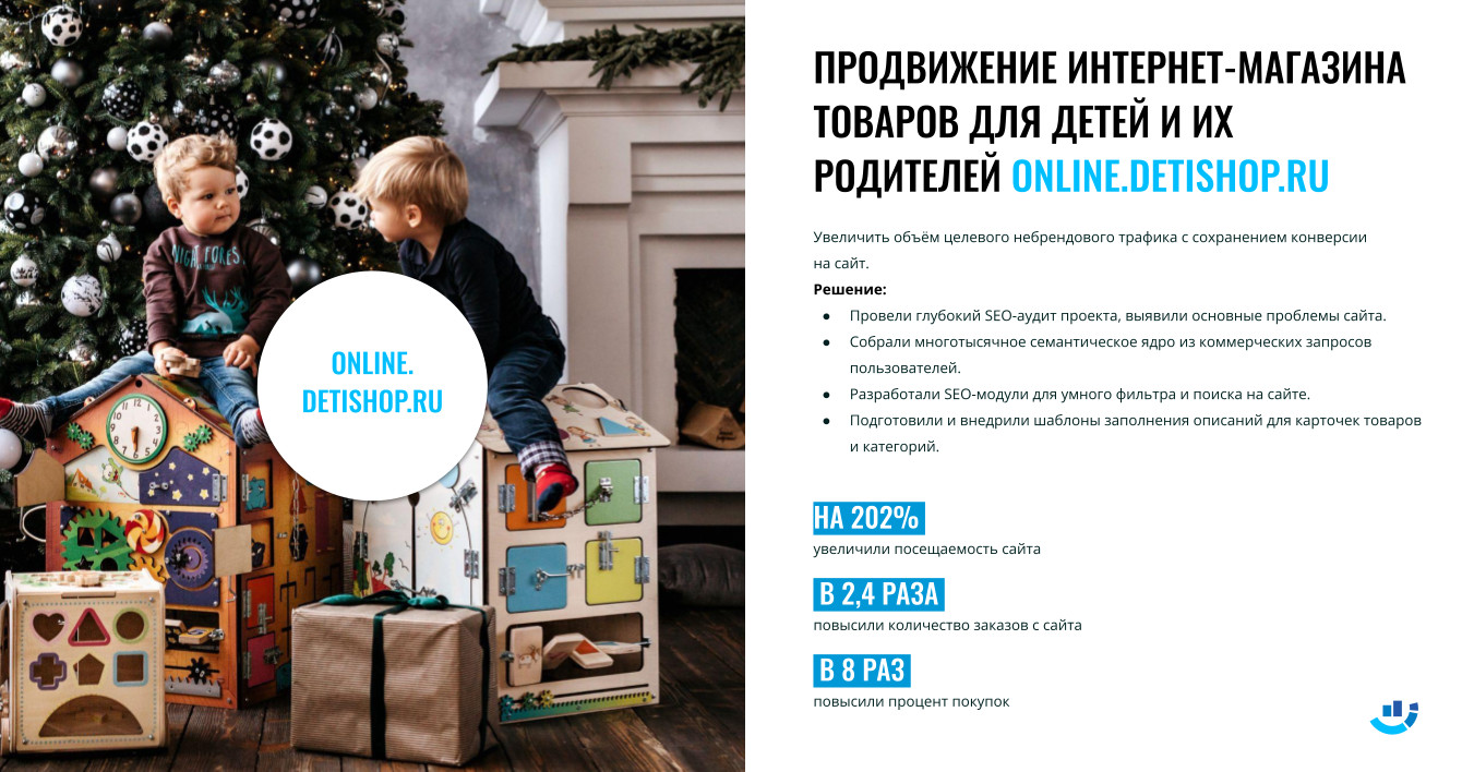 Около двух лет назад мы занимались онлайн-продвижением интернет-магазина из этой сферы. С детской тематикой всегда приятно работать, поэтому нам легко далось сотрудничество с клиентом Detishop.