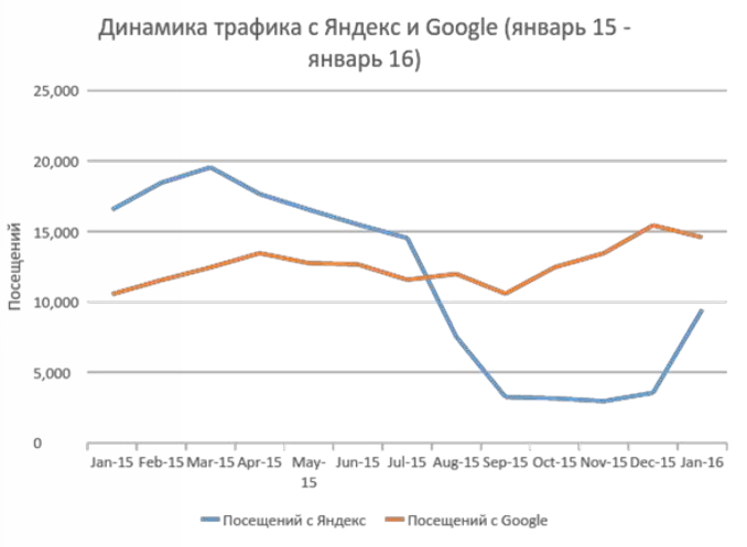 Постоянное поддерживание связи с Яндексом позволило показать поисковой системе, насколько сильно мы заинтересованы в снятии санкций. Корректно составленный и выполненный план позволил сократить срок вывода до 2,5 месяцев, и в январе 2016 года трафик начал резко расти.