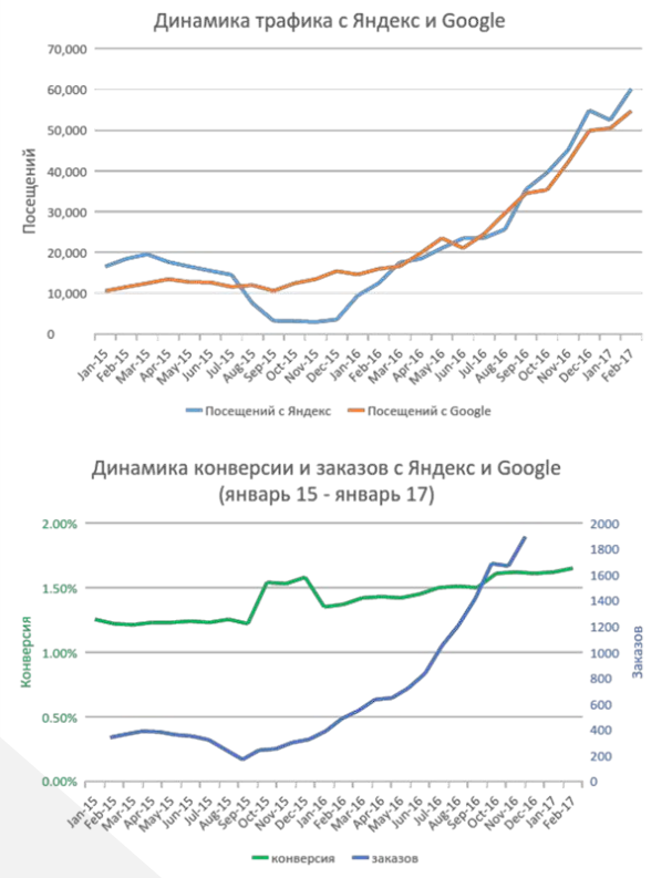 - быстрая реализация технического задания на стороне клиента позитивно сказалась на позициях Google, а после вывода сайта из-под санкций— и в Яндексе.