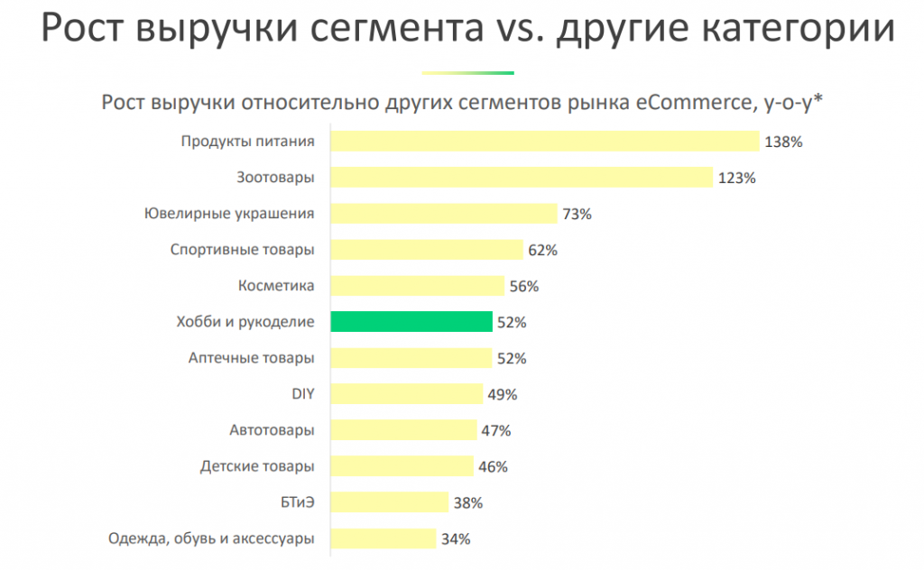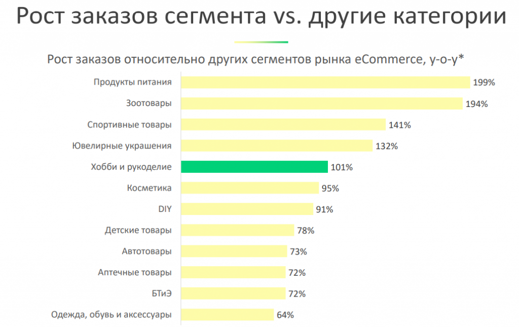 Как видно из графиков ниже, рост заказов в сегменте «Хобби и рукоделие» достигал 101% по количеству заказов и 52% по выручке.