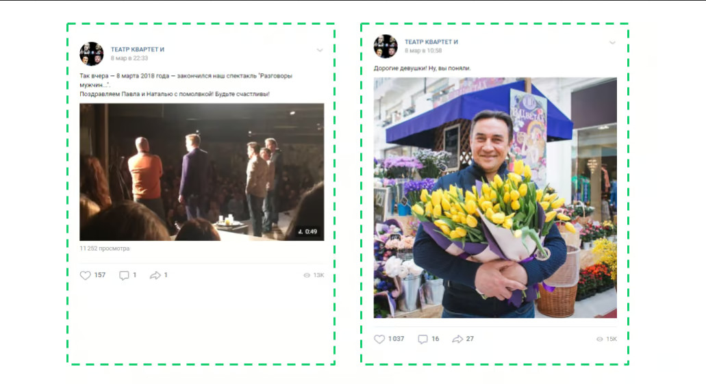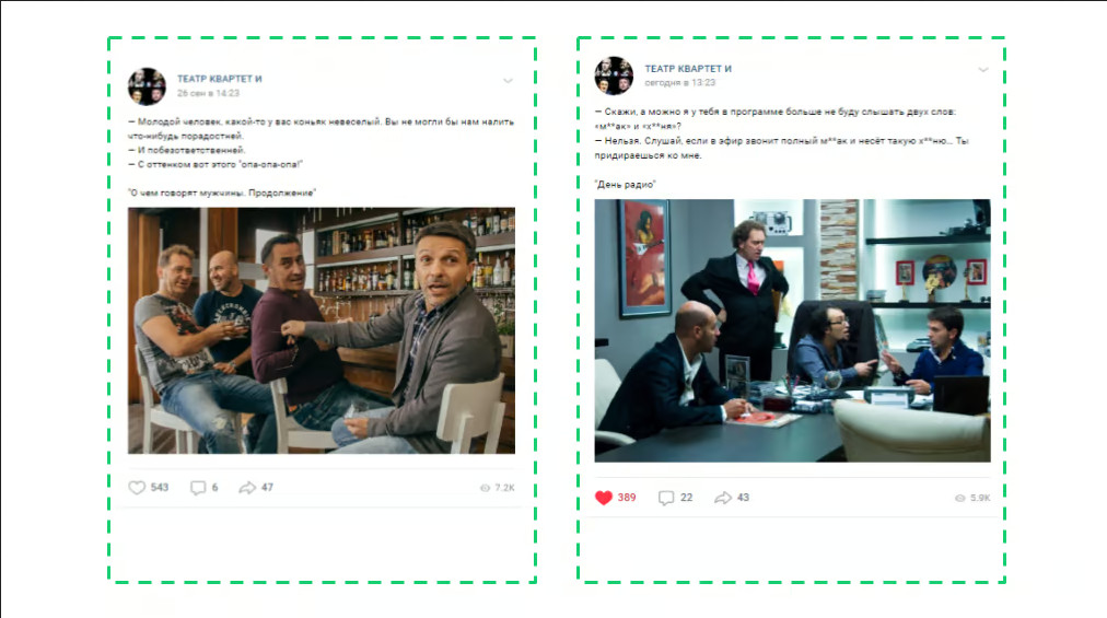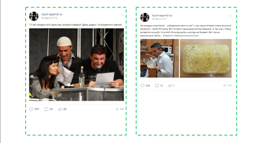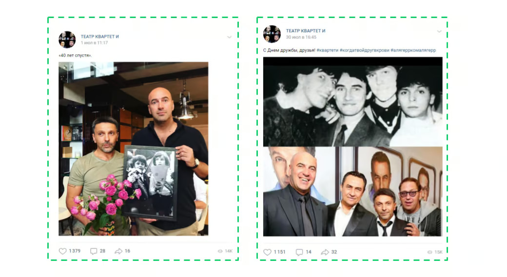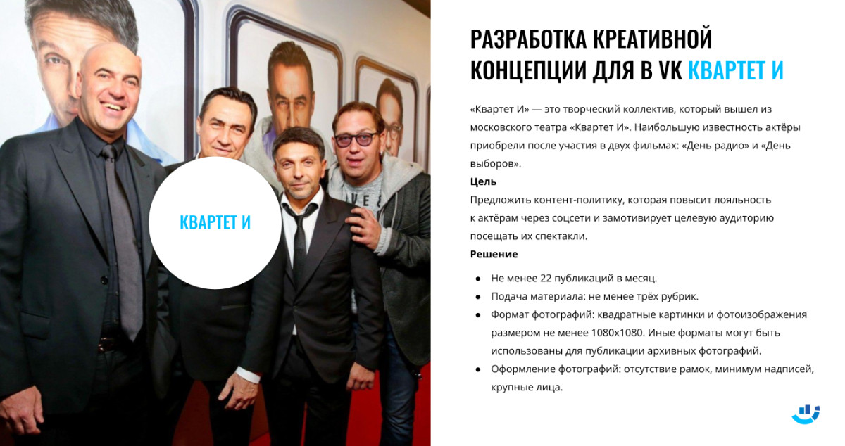 Посты с историями о событиях за кулисами и фотографиями из разных проектов «Квартета И». Для увеличения вовлеченности публики могут использоваться вопросы и неожиданные визуальные элементы. 2. Архивные воспоминания. Эта рубрика в сообществах «Квартет И» пользуется популярностью и вовлеченностью. В рамках её можно затронуть историю формирования «Квартета И», провести параллели между тем, какими они были, и какими стали, раскрыть мечты и тайны ранних лет, а также поделиться воспоминаниями участников и их близких. Для усиления интереса предлагается рассказать о пути «от старта к 25-летию», начав за месяц до юбилея. Текст под фотографиями и видео — до 650 символов, включая хештеги. 3. Необычные моменты. Это рубрика предлагает интересные высказывания и цитаты из фильмов с фото или короткими видео до 5 минут. Можно включить и «закадровые» моменты — слова и шутки, которые запомнились в повседневной жизни. Рубрика запущена в конце сентября и заслуживает продолжения. 4. Золотые фразы. Высказывания и моменты из фильмов с изображениями или короткими видео до 5 минут. 5. Свежие новости. Обзор новых проектов, участников и впечатлений от съемок. Публикации снабжаются фотографиями со съемочных площадок. В рубрике могут появиться и реактивные посты на актуальные события. 6. «Квартет и Звёзды». Встречи с известными личностями в мире шоу-бизнеса. Фотографии с краткими подписями и упоминаниями звёзд посредством @. Это может быть отдельной рубрикой или вводной к какому-либо событию. 7. Реклама для Вконтакте: Мы также подготовили рекламные баннеры для таргетинга во Вконтакте: