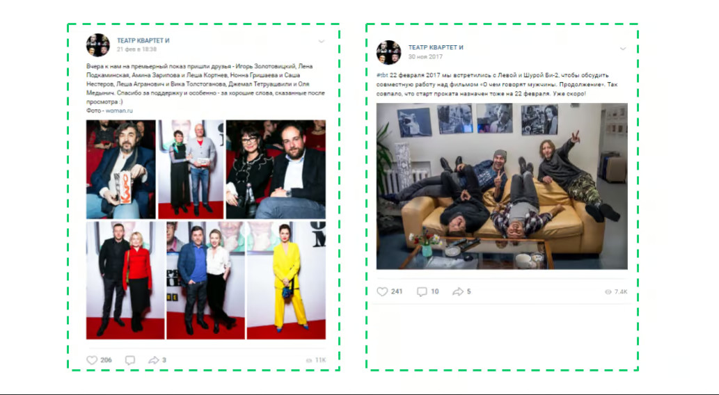 - Информационный и вовлекающий контент (70%): Интересные факты, цитаты, истории о «Квартете И» и так далее.