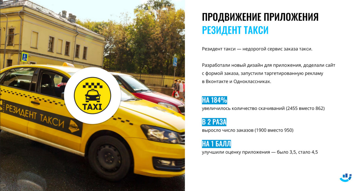 «Такси Резидент» — это доступное такси в Москве, которое начало свою работу в 2007 году. В 2015 году компания представила свое приложение и обратилась к нам для его продвижения.