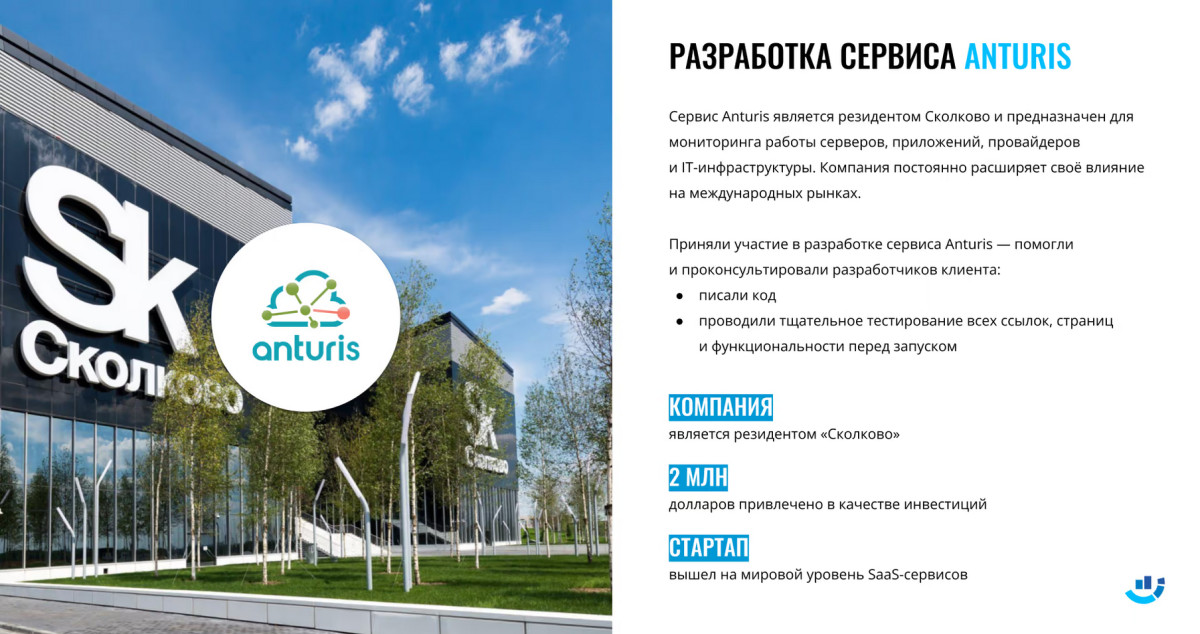 Anturis, резидент инновационного центра Сколково, предоставляет услуги мониторинга серверов, приложений и IT-инфраструктуры, активно расширяя свое присутствие на глобальном рынке.